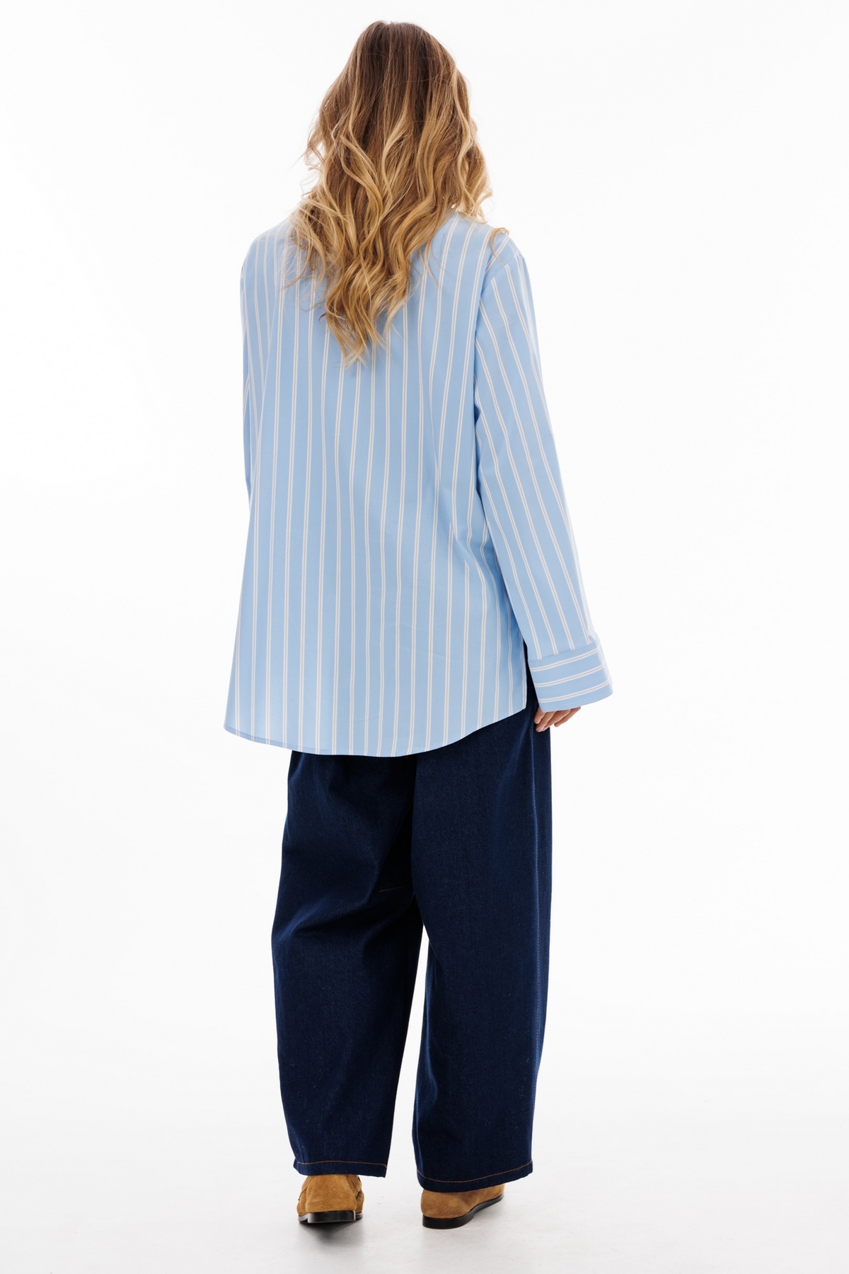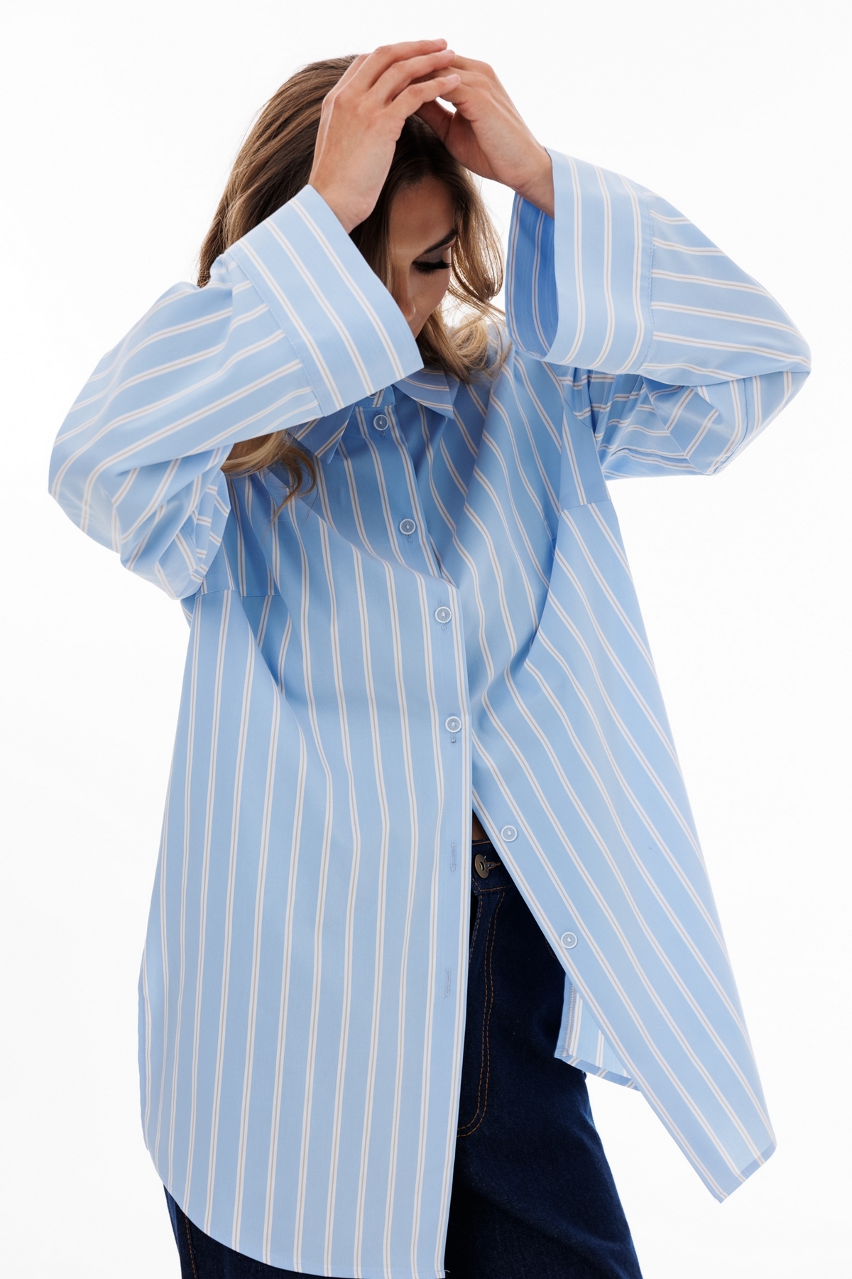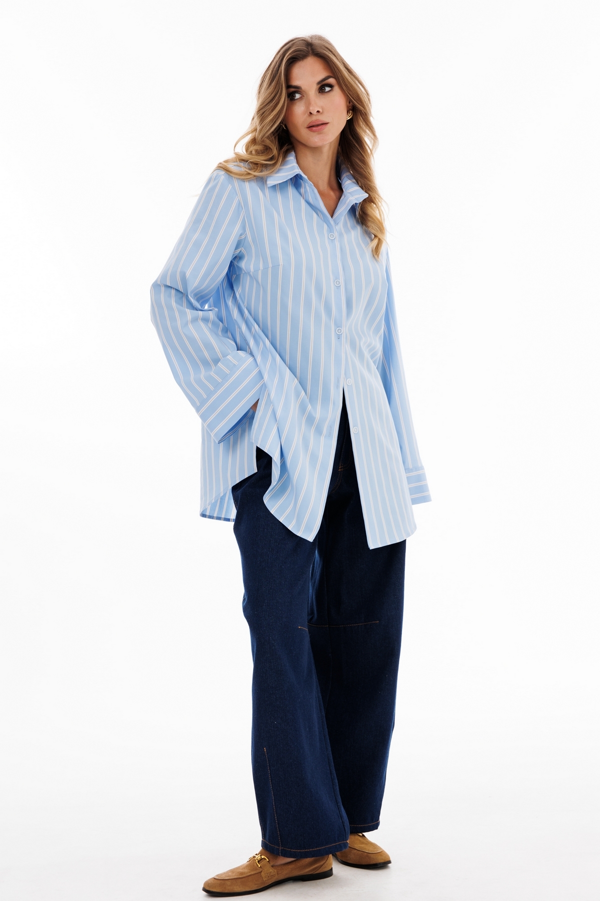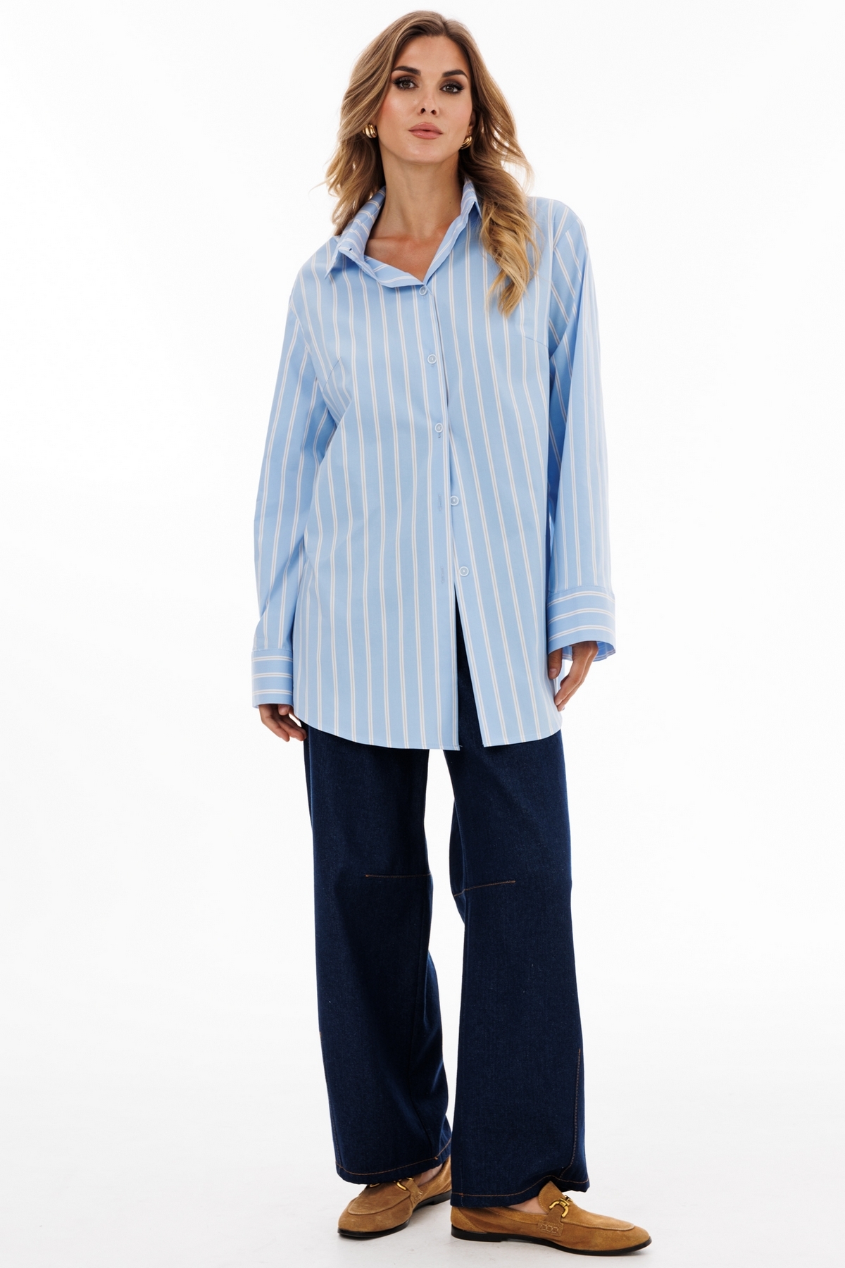 Блузка выполнена из блузочной ткани в полоску. Блузка прямого силуэта, длиной ниже линии бедер. Спереди центральная застежка на пуговицы. Спинка цельная. Вортник стояче-отложной с отрезной стойкой. Плечевой шов удлинен. Рукав рубашечный, одношовный. Низ рукава на широкой манжете. В боковых швах разрезы. Низ блузки фигурной формы.