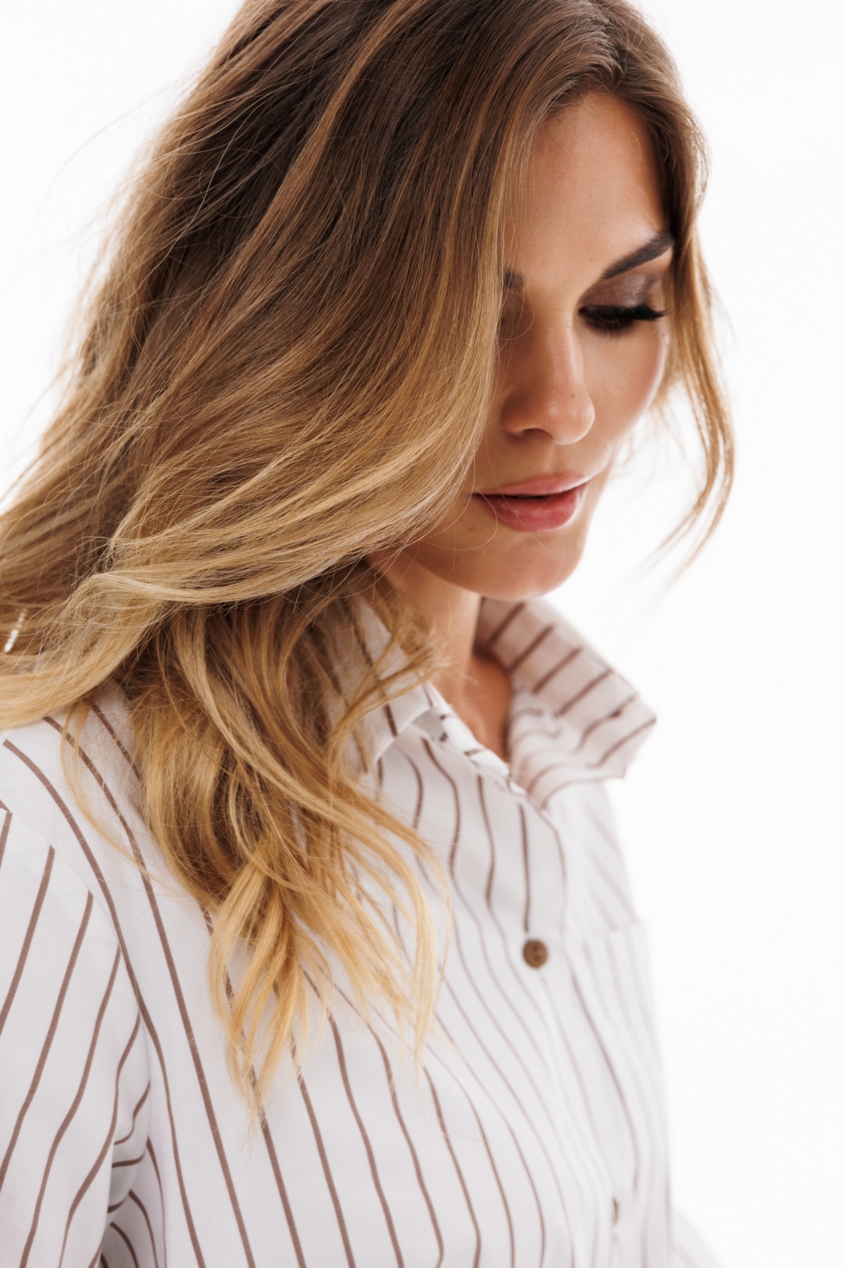 Блузка выполнена из блузочной ткани в полоску. Блузка прямого силуэта, длиной ниже линии бедер. Спереди застежка на пуговицы. На спинке обработана кокетка и две складки. Воротник стояче-отложной. Плечевой шов удлинен. Рукав рубашечного покроя, одношовный, низ рукава на притачной манжете. Низ блузки фигурной формы. По спинке блузка декорирована брендированной нашивкой из натуральной кожи.