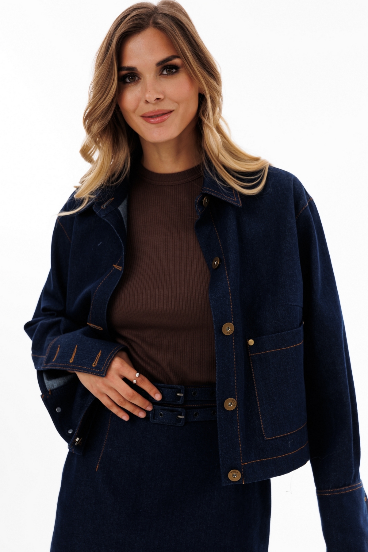 Блузка выполнена из плотного джинса. Блузка прямого силуэта, длиной ниже линии талии. Спереди накладные карманы и центральная застежка с планкой на пробивные пуговицы. На спинке кокетка и две складки. Воротник стояче-отложной с отрезной стойкой. Плечевой шов удлинен. Рукав рубашечного покроя, одношовный. Низ рукава на притачной манжете с застежкой на пробивные пуговицы. Рукав удлинен. Блузка декорирована по кокетке спинки нашивкой из натуральной кожи.