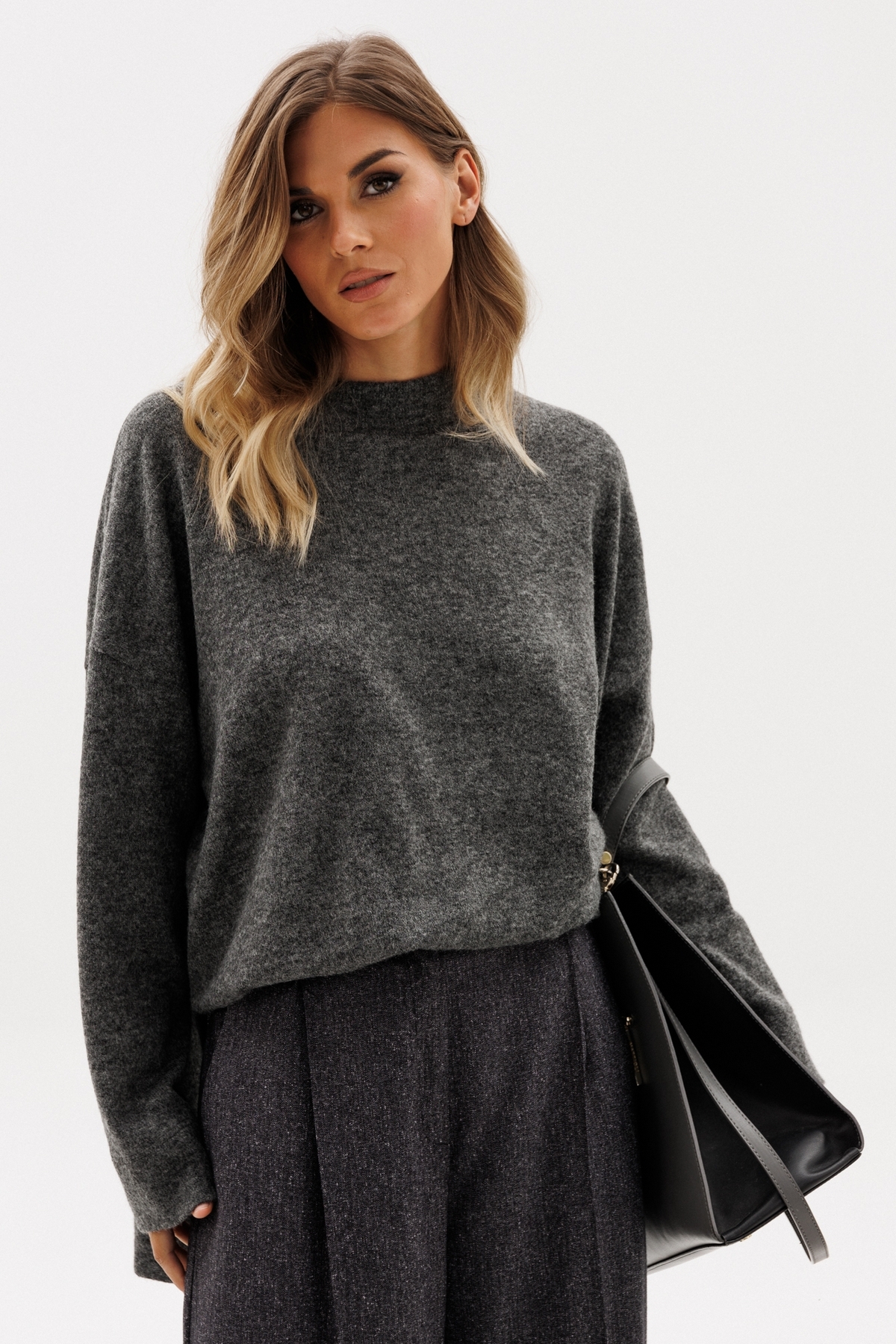 Джемпер выполнен из трикотажного полотна. Джемпер прямого силуэта, длиной ниже линии бедер. Перед и спинка цельные. Горловина округлой формы, обработана широкой бейкой. Плечевой шов удлинен. Рукав рубашечного покроя, одношовный. В боковых швах разрезы.