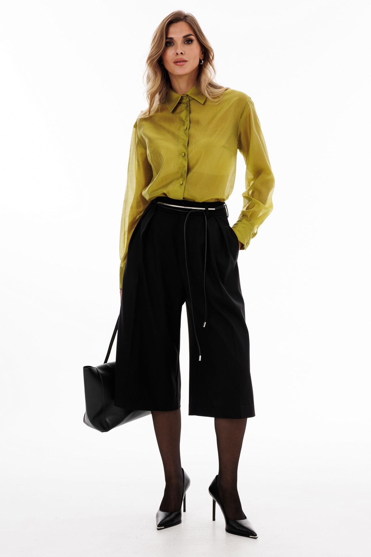 Капри выполнены из костюмно-плательной ткани. Капри длиной ниже линии колена, расширенные к низу на притачном поясе. Спереди обработаны две пары складок и застежка на молнию с гульфиком. В боковых швах обработаны карманы. Ремень в комплект НЕ ВХОДИТ.