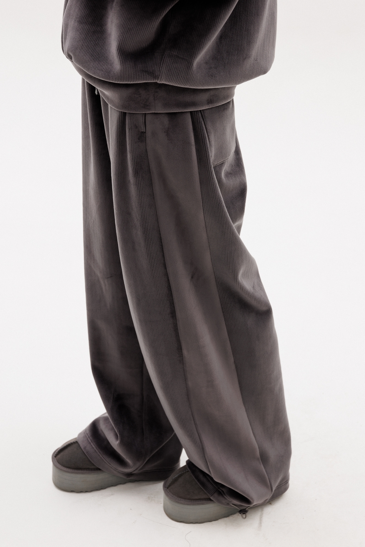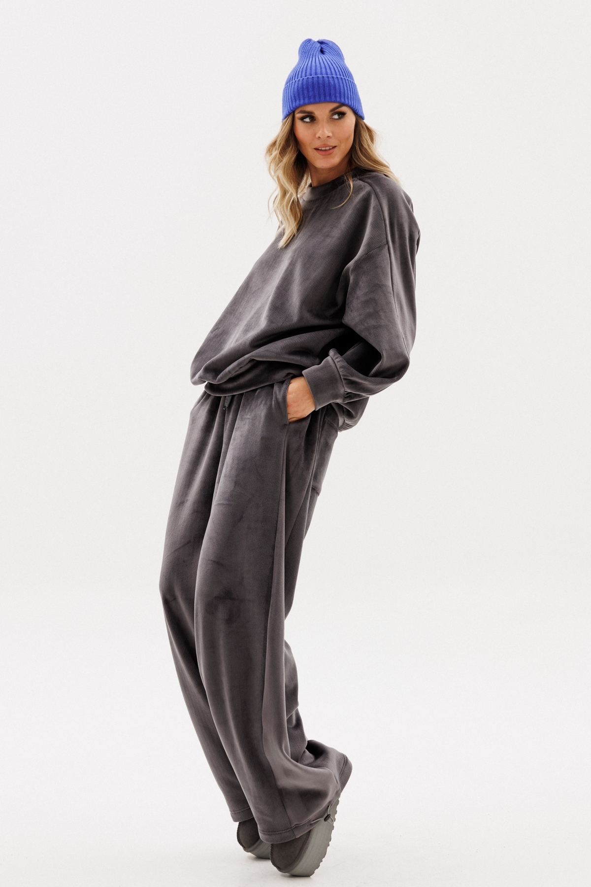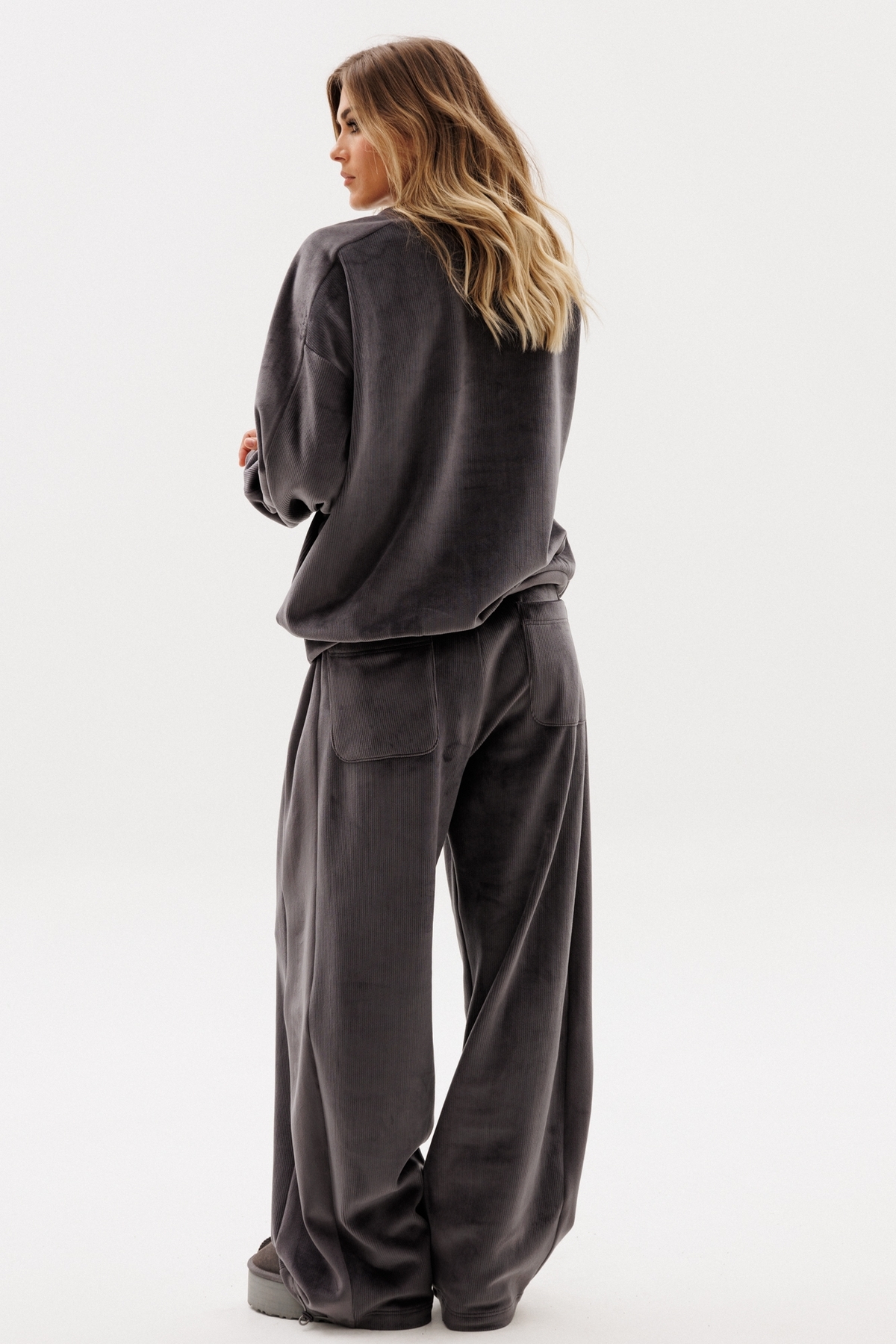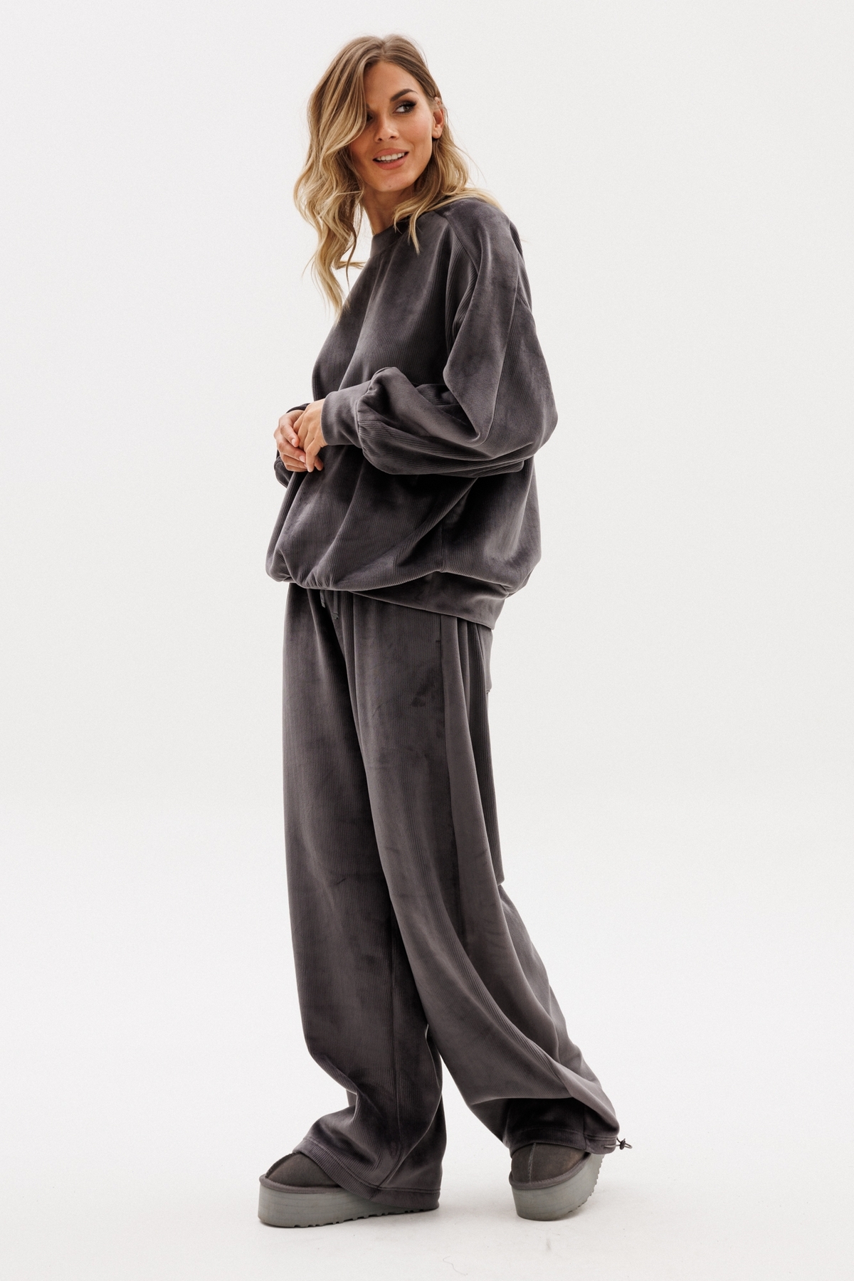 Комплект: джемпер+брюки. Комплект выполнен из двустороннего велюра в мелкий рубчик. Джемпер О-образного силуэта, покроя "oversize", длиной до линии бедер. Перед и спинка цельные. Горловина округлой формы, обработана бейкой. Плечевой шов удлинен. Рукав рубашечного покроя, одношовный. Низ рукава на манжете. Верхняя часть рукава переходит в кокетку переда т спинки и доходит до горловины. По низу джемпера обработан пояс. Пояс, манжеты, верхняя часть рукава и бейка горловины выполнены из основной, но без рубчика. Брюки на притачном поясе с эластичной тесьмой, прямого силуэта, длиной в пол, покроя "oversize". Боковой шов заменен лампасом. В швах лампаса карманы. Сзади накладные карманы. В пояс протянут шнур с наконечниками. По низу брюк втянута эластичная тесьма с фиксаторами. Лампасы и пояс выполнены из основной ткани, но без рубчика.