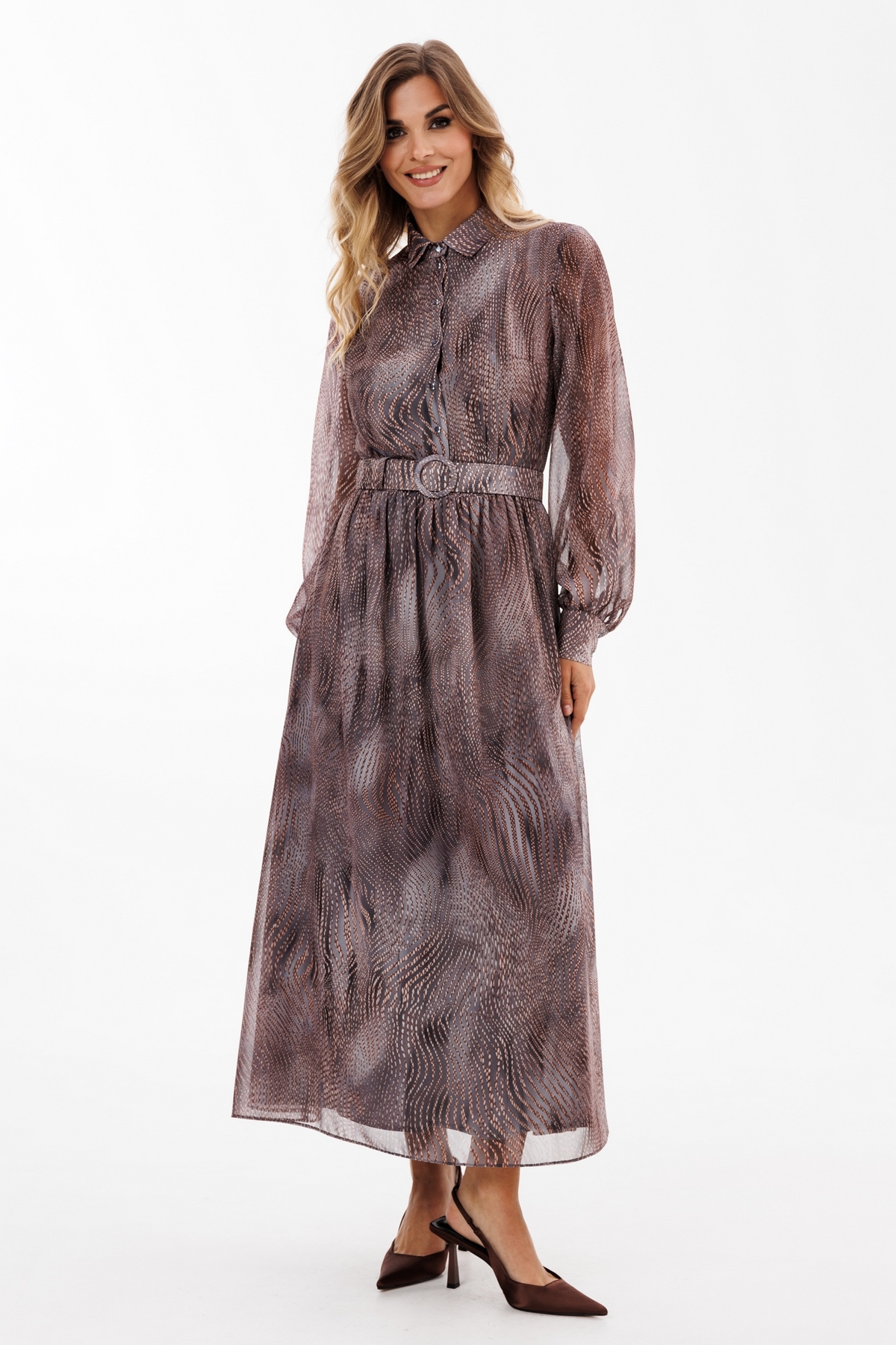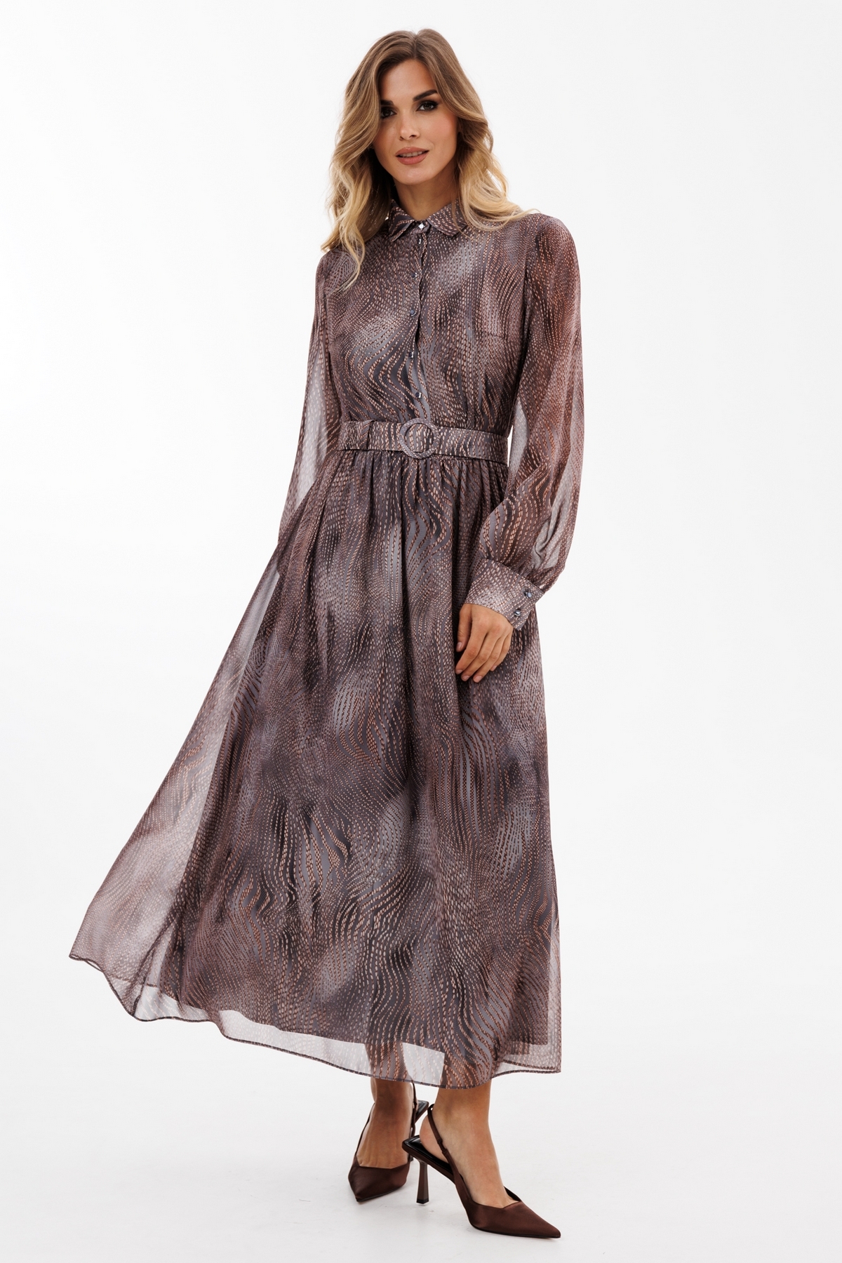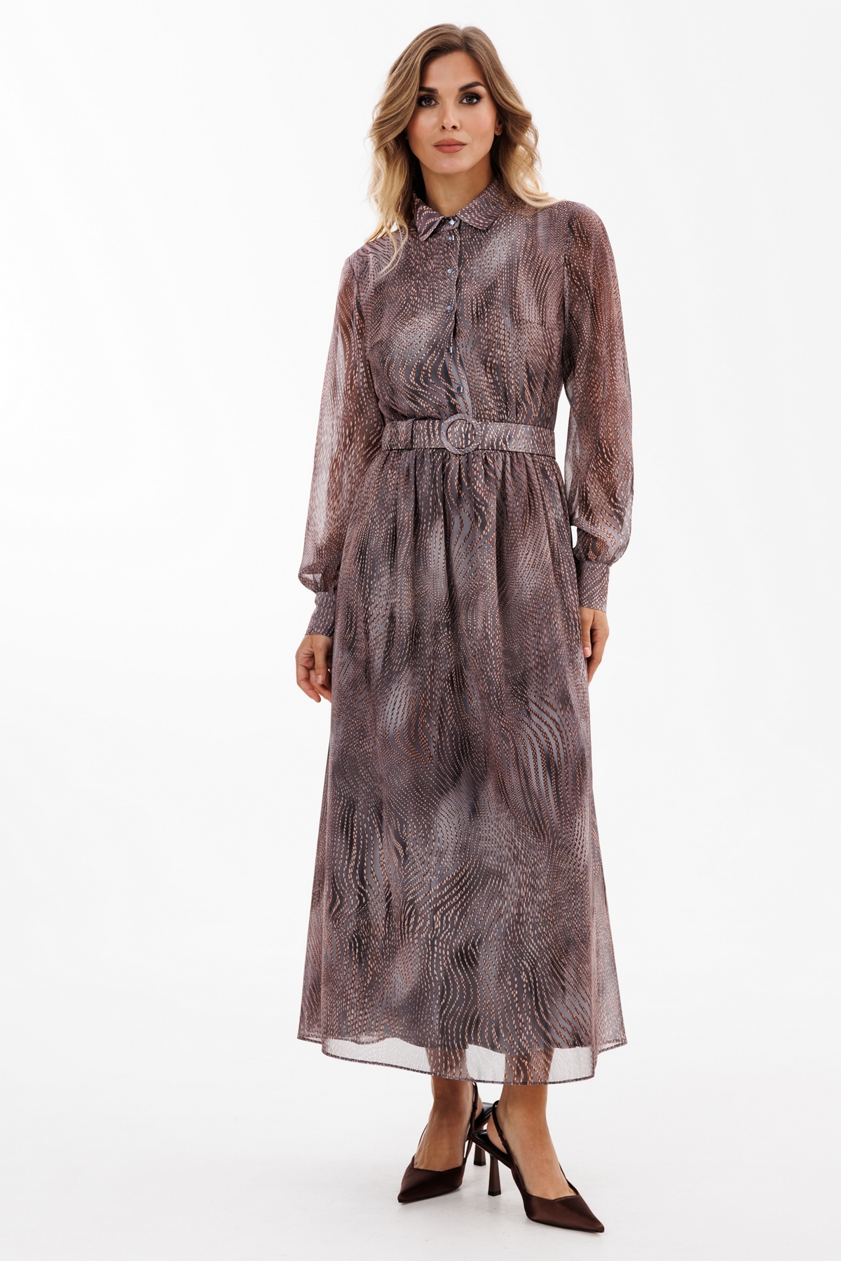 Платье выполнено из шифона с принтом. Платье отрезное по линии талии. Воротник рубашечного типа. Застежка спереди на пуговицы на планке. Рукав втачной, на манжете. Лиф и юбка платья на подкладке из тонкого атласа.  В комплект входит съемный ремень из основной ткани с обтяжной пряжкой.