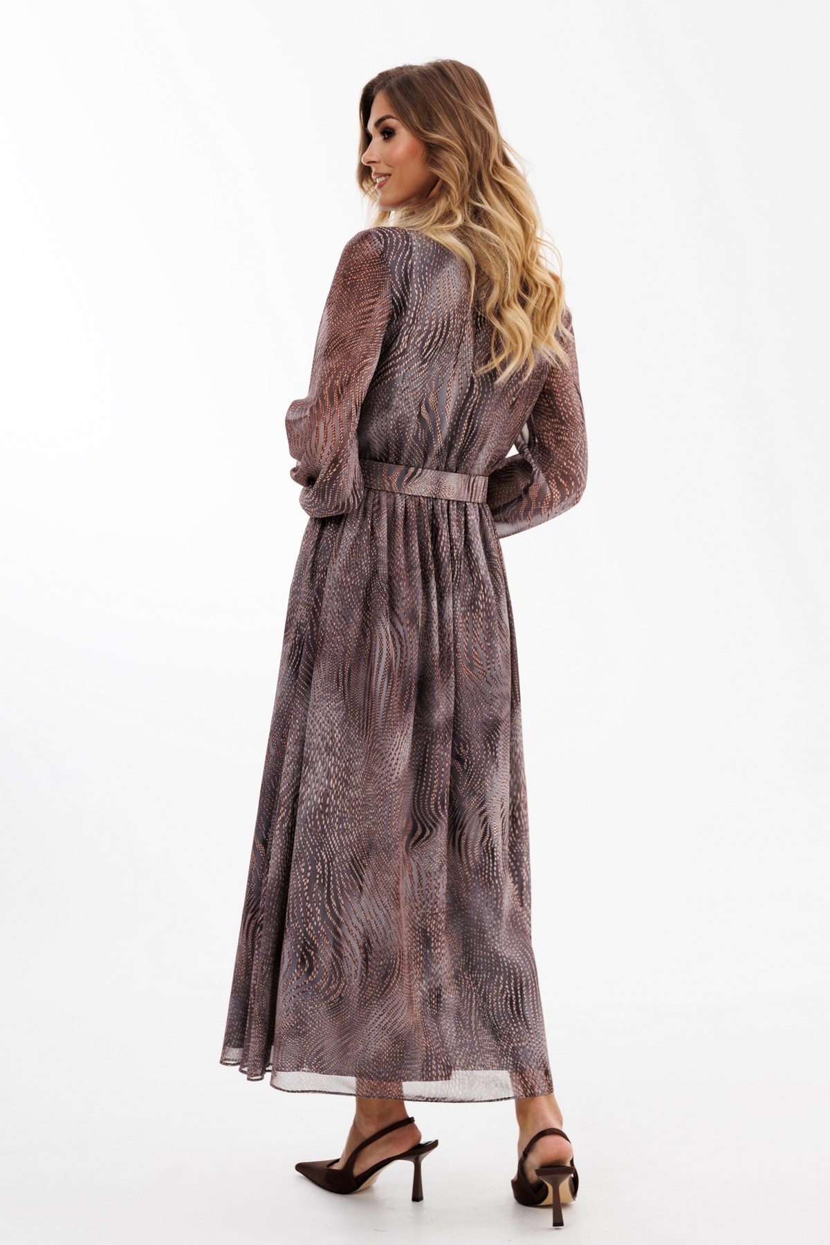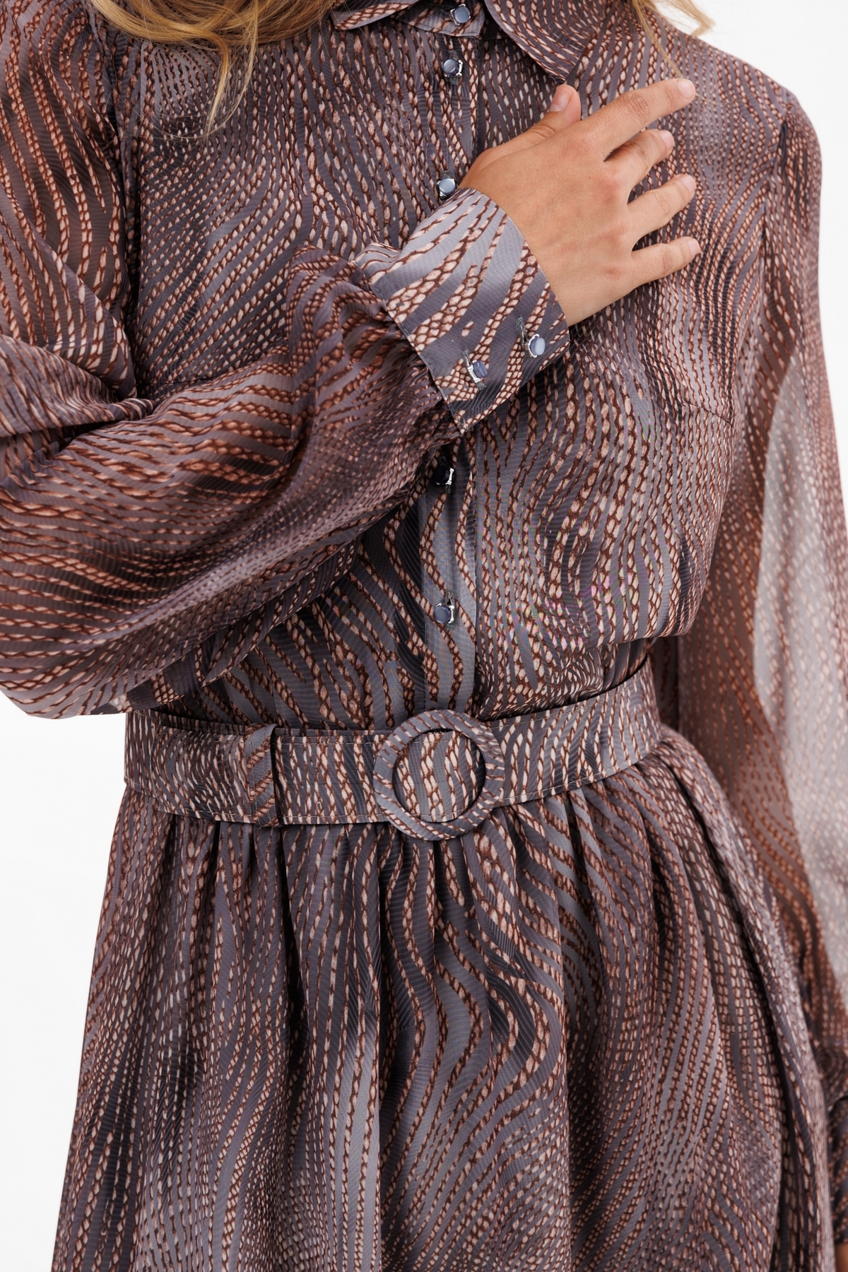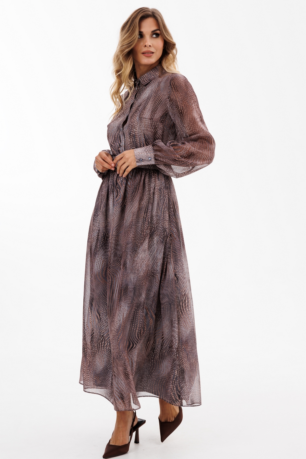 Платье выполнено из шифона с принтом. Платье отрезное по линии талии. Воротник рубашечного типа. Застежка спереди на пуговицы на планке. Рукав втачной, на манжете. Лиф и юбка платья на подкладке из тонкого атласа.  В комплект входит съемный ремень из основной ткани с обтяжной пряжкой.