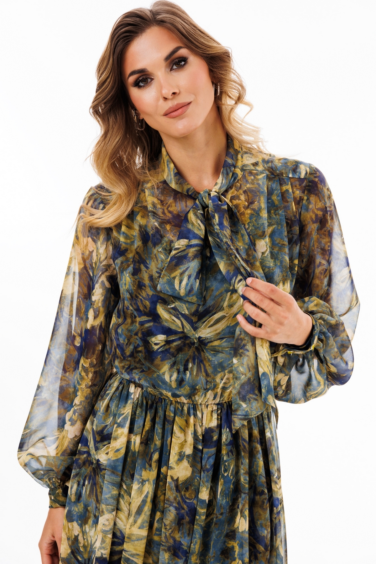 Платье выполнено из шифона с принтом. Платье Х-образного силуэта, отрезное по линии талии, длиной до щиколотки. Перед лифа и спинка цельные. Воротник-стойка переходящий в бант. Рукав втачной, одношовный, расширенный книзу. Низ рукава собран на сборку. Манжет застегивается на две прорезные петли и пуговицы. Платье присборено на эластичную тесьму по линии талии. Платье на подкладке.