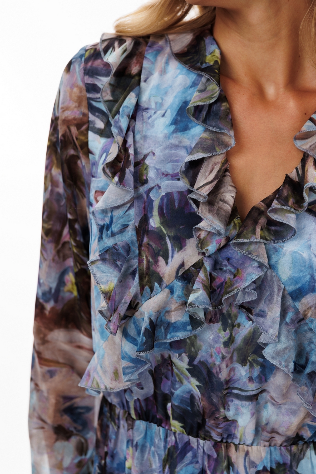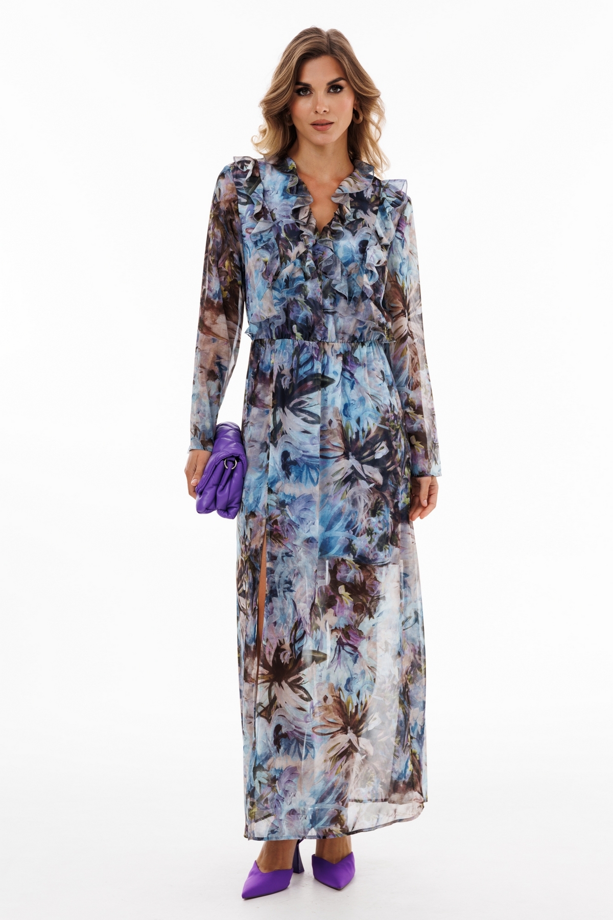 Платье выполнено из шифона с цветочным принтом. Платье Х-образного силуэта, длиной миди. Платье отрезное по линии талии. Спереди рельефы и фигурные подрезы, в которых обработаны волны. Горловина V-образной формы. Горловина обработана волнами. Рукав втачной одношовный. Юбка слегка расширена к низу. Спереди справа разрез. По линии талии эластичная тесьма. Платье на отлетной по низу подкладке.