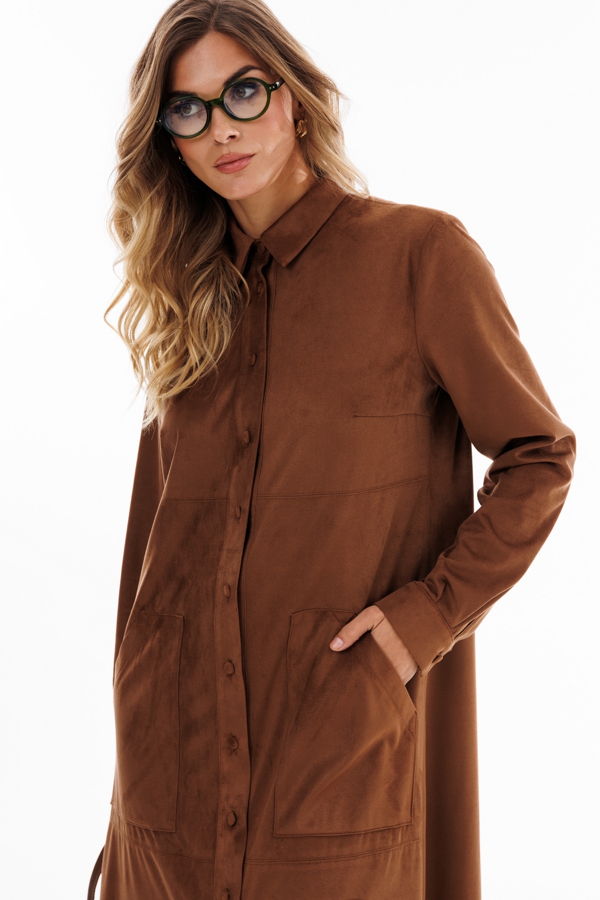 Платье выполнено из тонкой искуственной замши. Платье прямого силуэта, длиной миди. Спереди горизонтальные подрезы, накладные карманы и центральная застежка до верха с планкой на пуговицы. На спинке кокетка и встречная складка. Воротник стояче-отложной с отрезной стойкой и затежкой на пуговицу. Рукав втачной, одношовный. По низу рукава две складки и планка-обтачка. Низ рукава на притачной манжете с застежкой на пуговицу. Платье декорировано нашивкой из натуральной кожи по кокетке спинки. В комплект входит ремень из основной ткани с обтяжной пряжкой.
