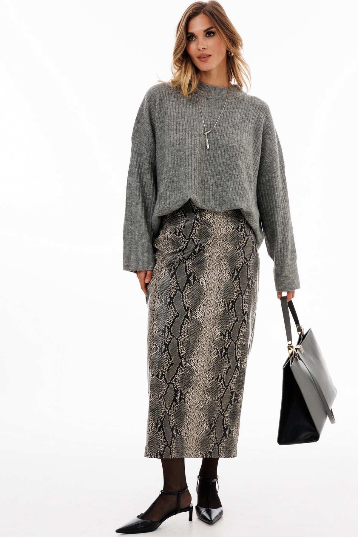 Юбка выполнена из искусственной кожи с анималистичным принтом. Юбка заужена к низу, на притачном поясе, длиной миди. Застежка сзади на потайную молнию и пуговицу. Сзади в среднем шве разрез. Юбка на отлетной по низу подкладке.
