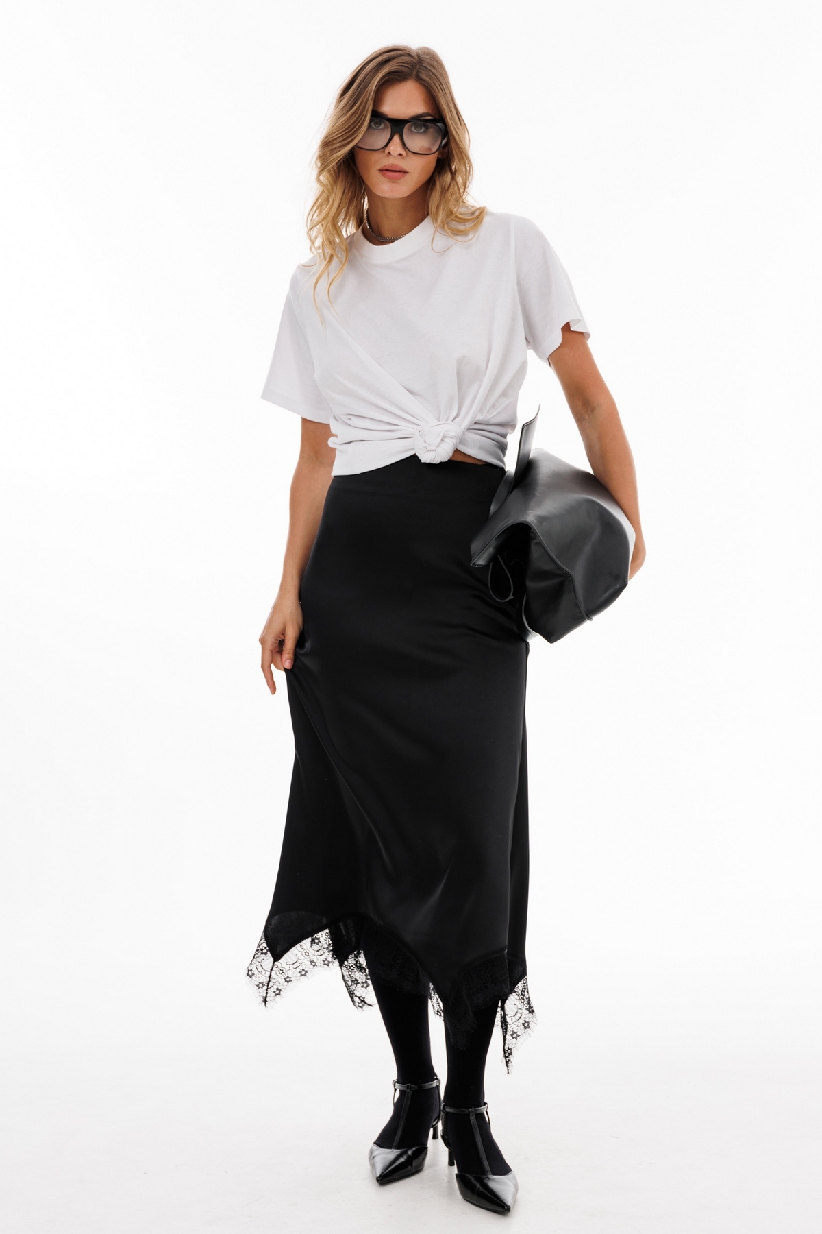 Юбка выполнена из атласа. Юбка А-образного силуэта, длиной миди. Переднее и заднее полотнище цельные и расширены к низу. Низ юбки фигурной формы, обработан кружевом. ВЗастежка в левом боковом шве на потайную молнию и пуговицу. Юбка без подкладки.
