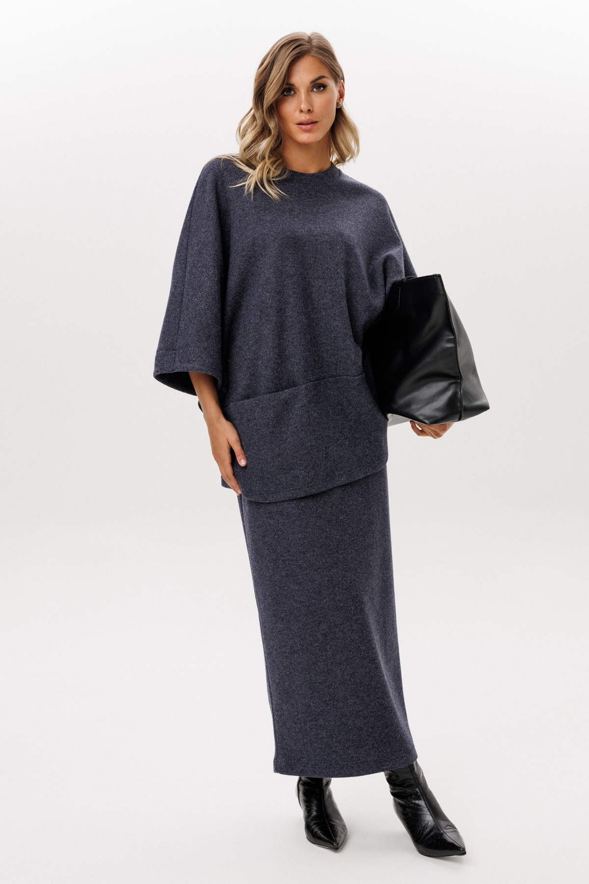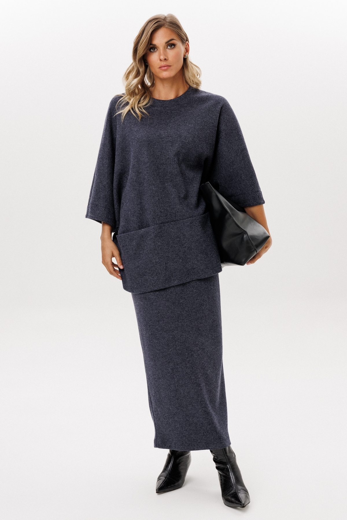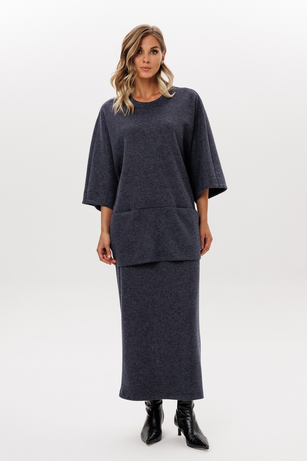 Юбка выполнена из трикотажного полотна. Юбка прямого силуэта, длиной миди, на цельнокроенном поясе с эластичной тесьмой. Сзади разрез в среднем шве.