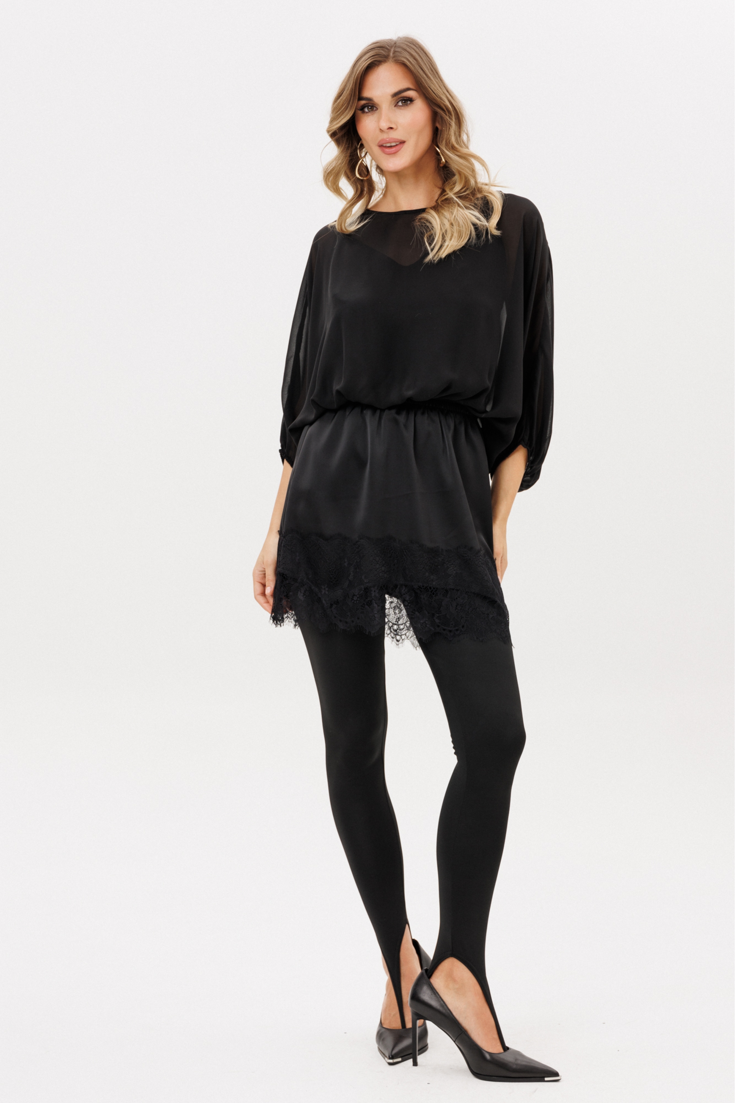 Блузка выполнена из шифона. Блузка О-образного силуэта, длиной до линии талии. Перед и спинка цельные. Горловина округлой формы. Рукав покроя "летучая мышь", двухшовный, длиной ниже линии локтя. Низ блузки и рукава на эластичной тесьме. Топ из тонкого атласа в комплект не входит и продается отдельно м.2770.