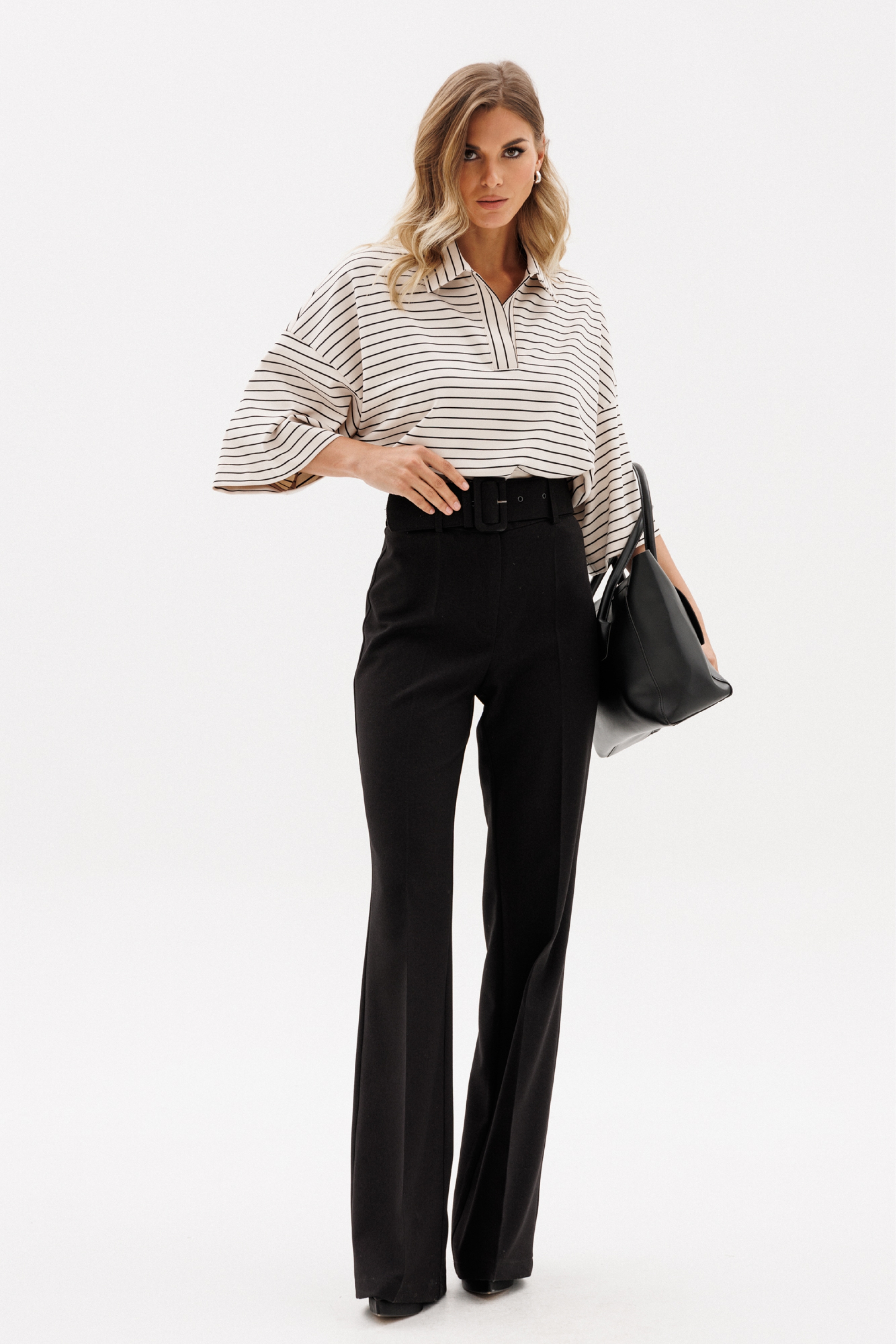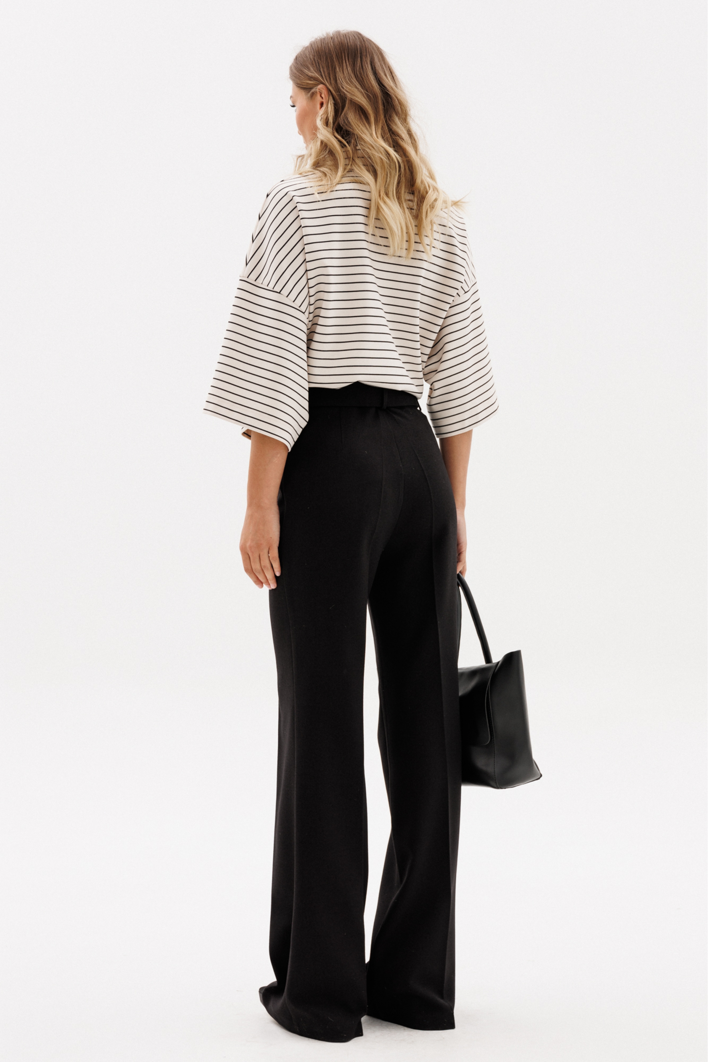 Брюки выполнены из костюмной ткани. Брюки покроя ""клеш"", на притачном поясе, длиной в пол. Спереди застежка на молнию с гульфиком, потайную пуговицу и два брючных крючка. Передние и задние части брюк заутюжены на кант. В комплект входит съемный пояс из основной ткани.