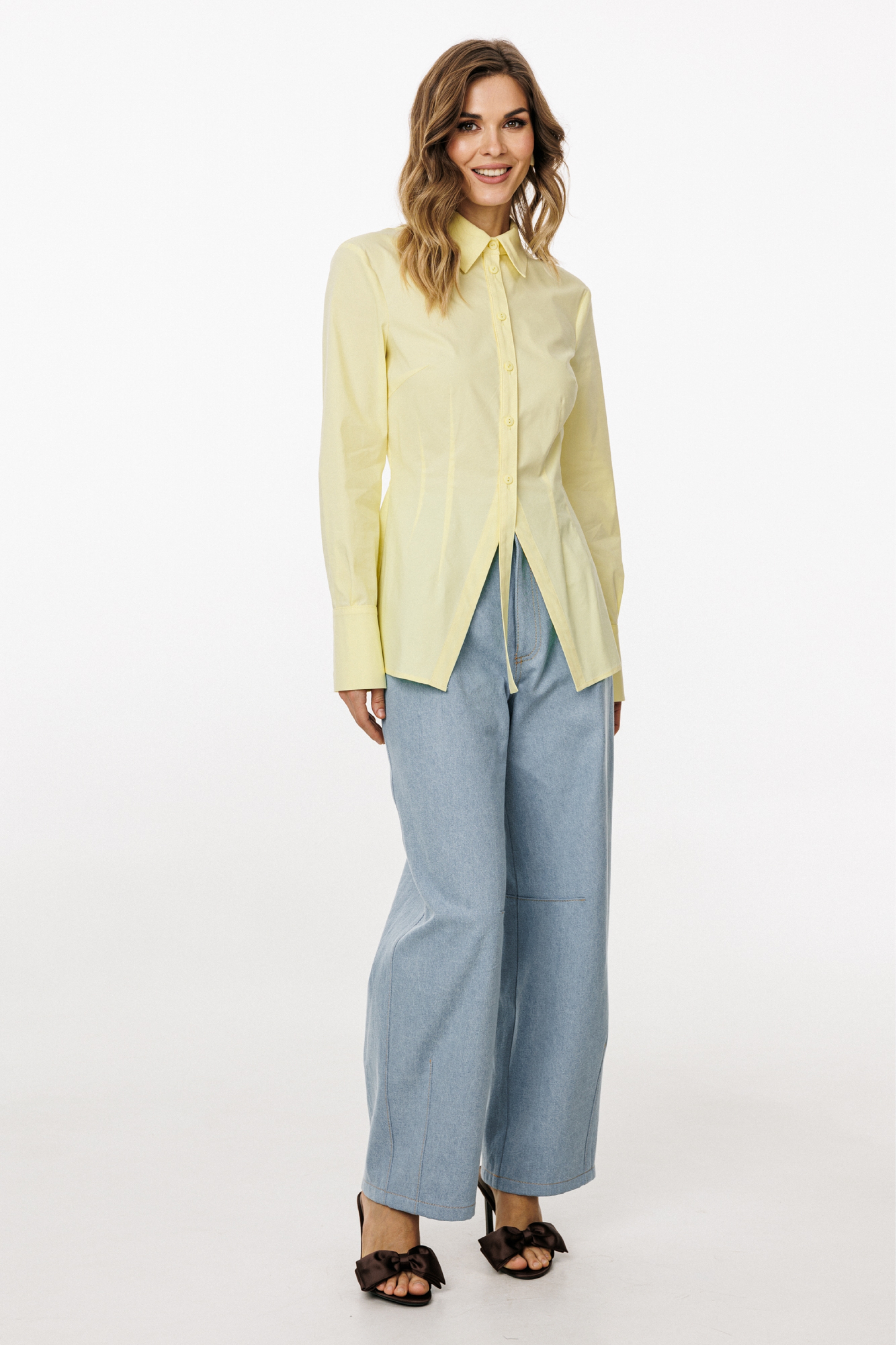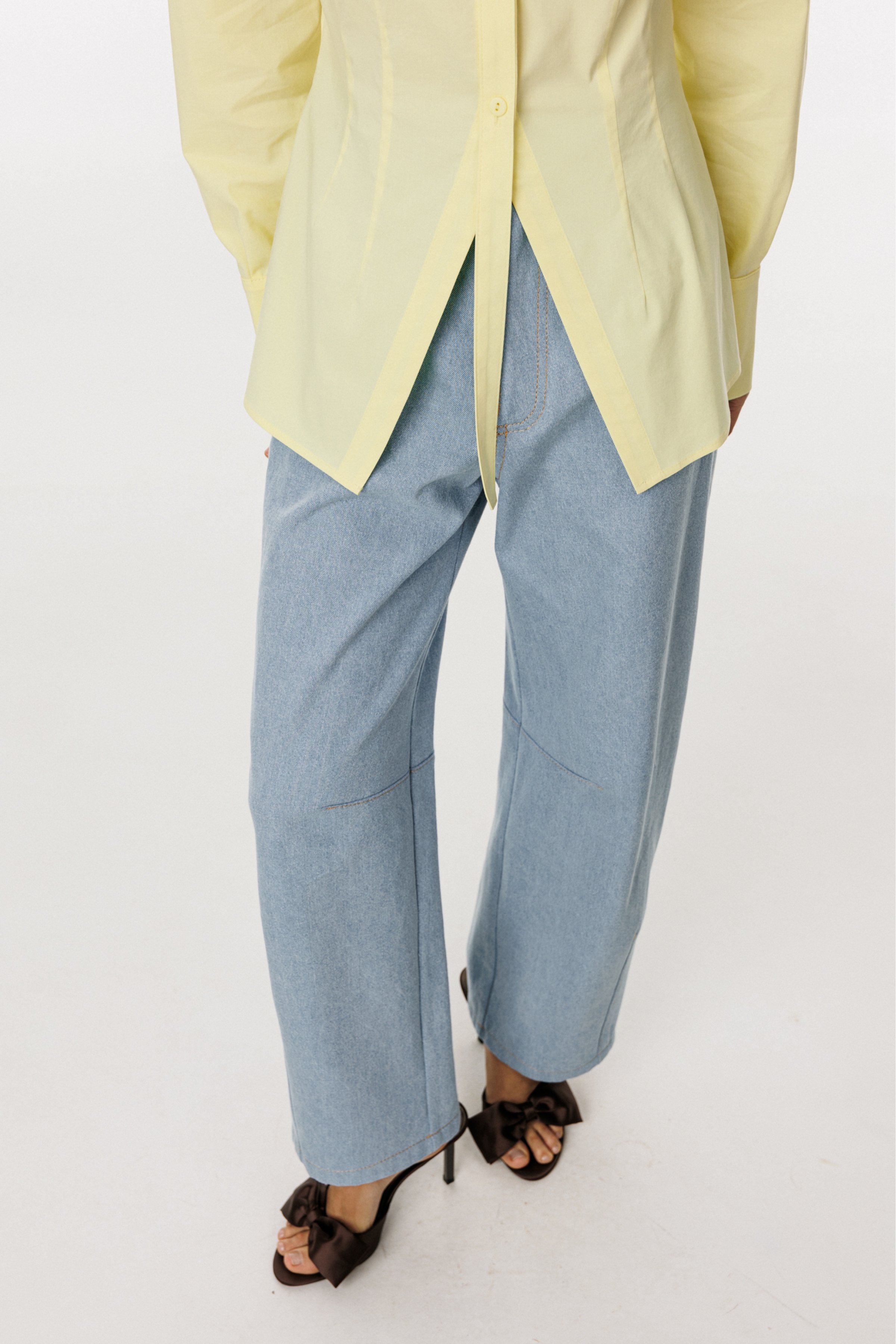 Джинсы-багги выполнены из плотного джинса. Брюки на притачном поясе, длиной до линии щиколотки, расширенные от бедер и слегка зауженные к низу. Спереди боковые карманы с фигурным входом. Застежка на пуговицу и молнию с гульфиком. На задних частях кокетки и накладные карманы. На передней и задней части коленные вытачки.