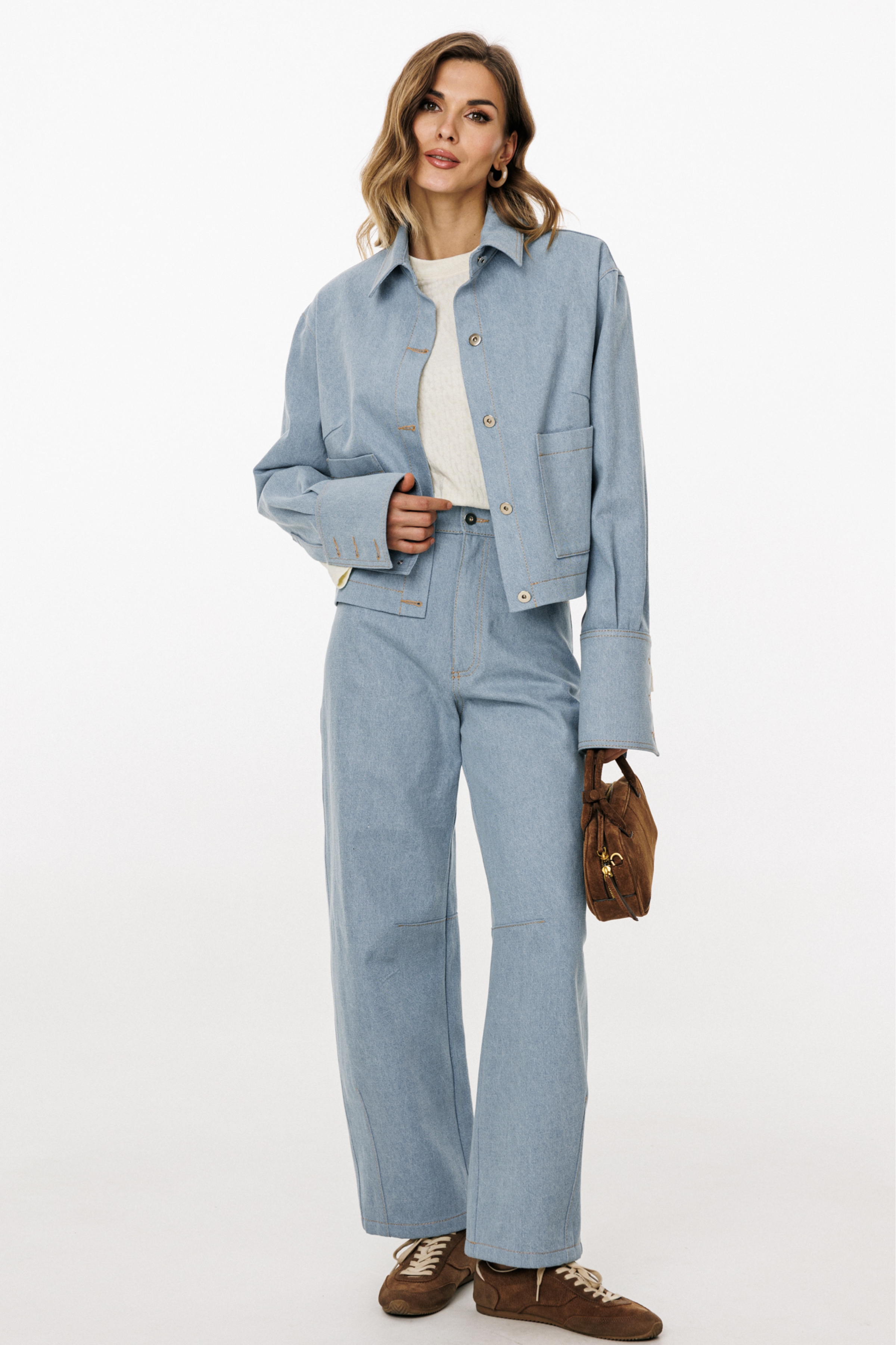Джинсы-багги выполнены из плотного джинса. Брюки на притачном поясе, длиной до линии щиколотки, расширенные от бедер и слегка зауженные к низу. Спереди боковые карманы с фигурным входом. Застежка на пуговицу и молнию с гульфиком. На задних частях кокетки и накладные карманы. На передней и задней части коленные вытачки.