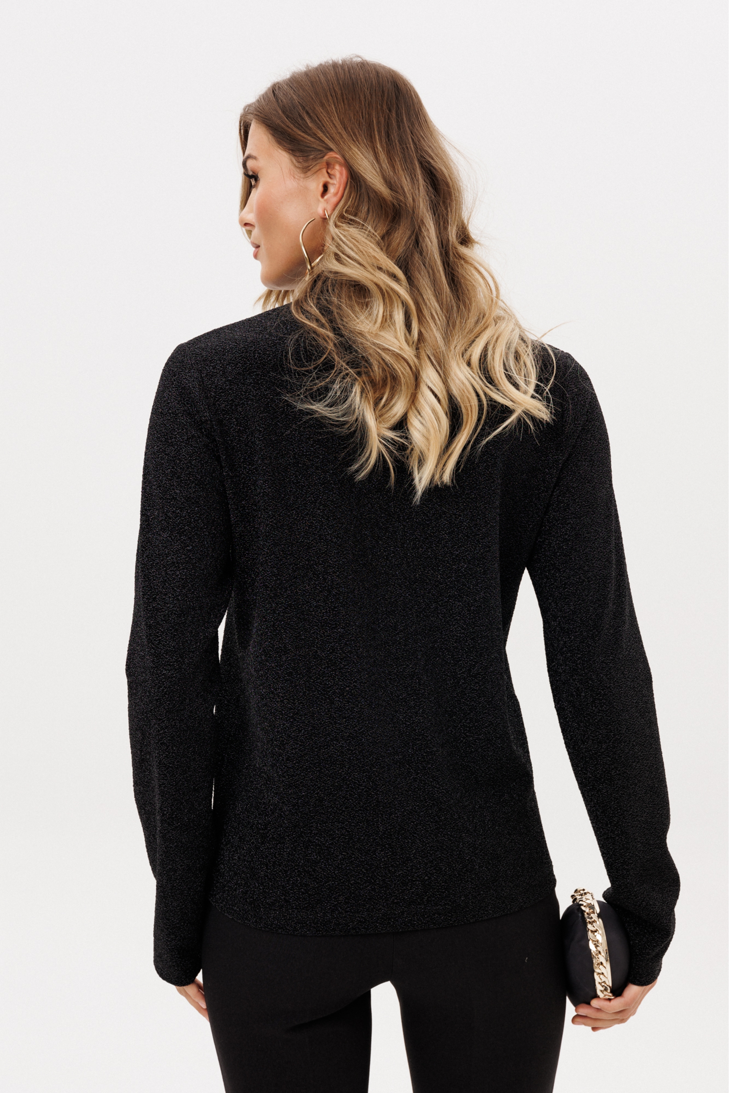 Джемпер выполнен из трикотажного полотна с блеском. Джемпер полуприлегающего силуэта, длиной выше линии бедер. Воротник стояче-отложной. Плечевой шов удлинен. Рукав втачного покроя, одношовный. Застежка по планке на петли и декоративные пуговицы.