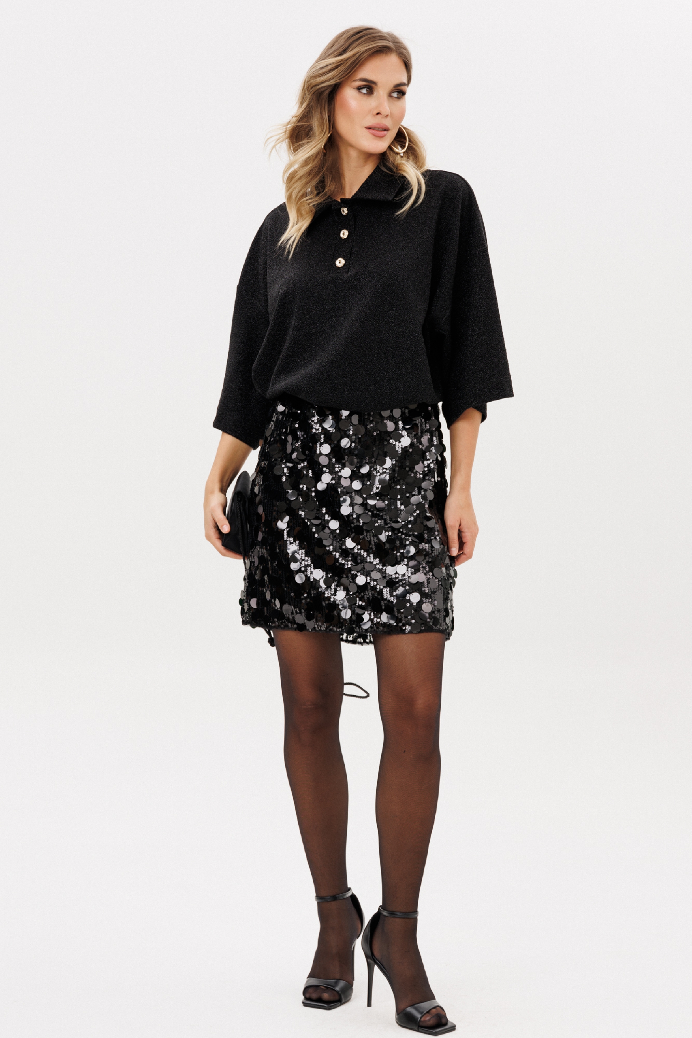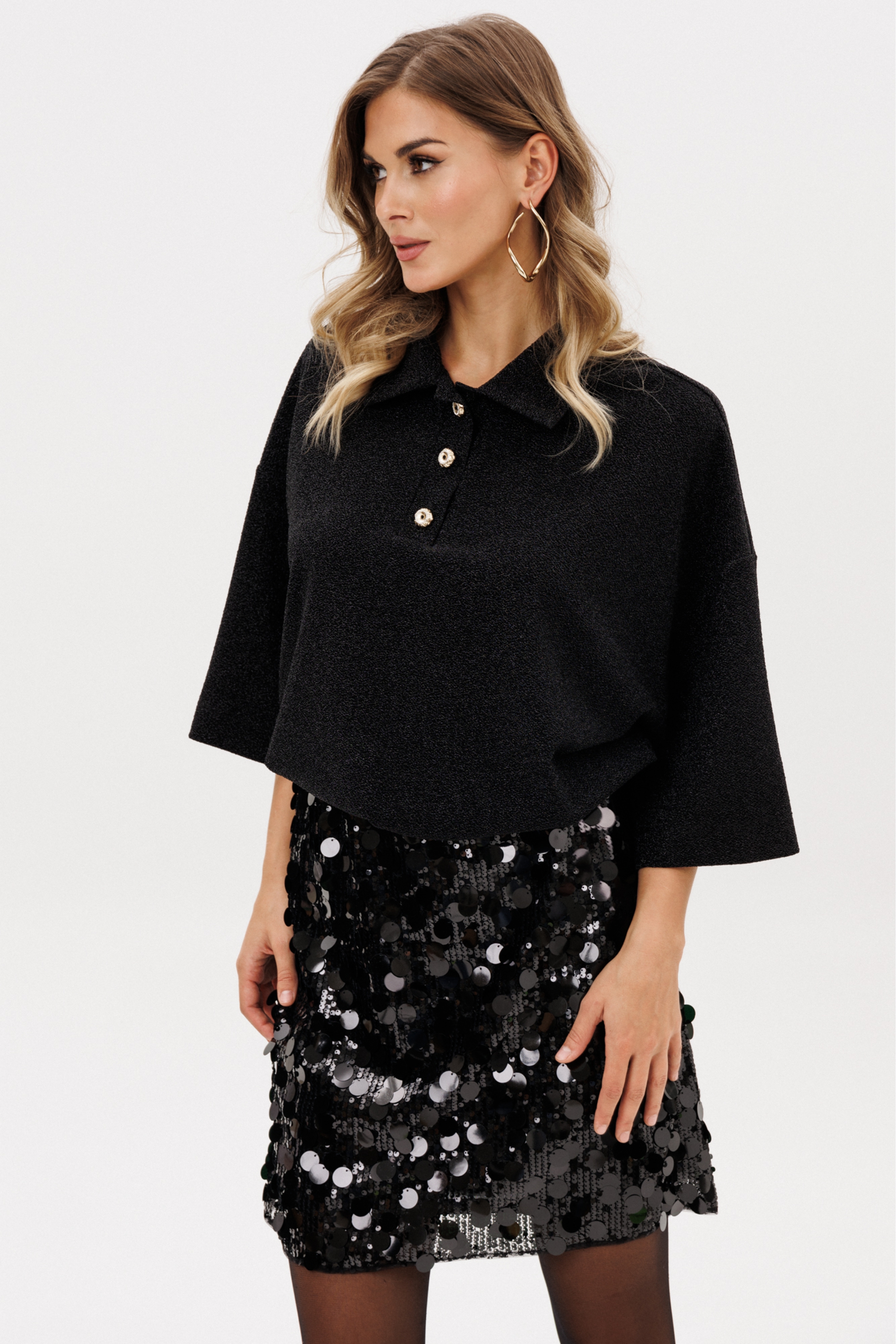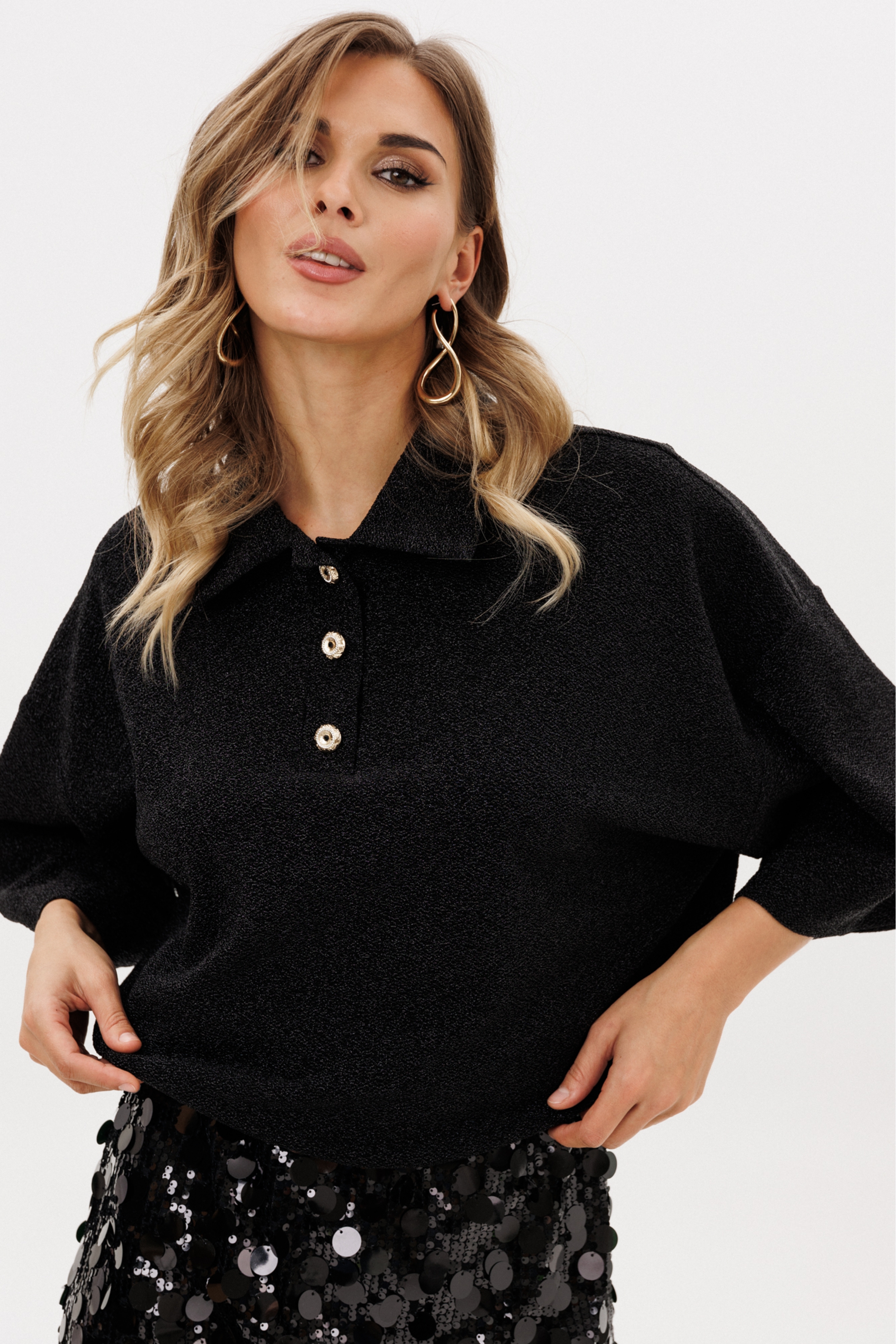 Джемпер выполнен из трикотажного полотна с блеском. Джемпер О-образного силуэта, длиной выше линии бедер. Спереди центральная застежка на декоративные пуговицы. Спинка цельная. Воротник стояче-отложной. Плечевой шов удлинен. Рукав рубашечного покроя, одношовный, длиной до линии локтя. Низ джемпера присобран на эластичную тесьму.