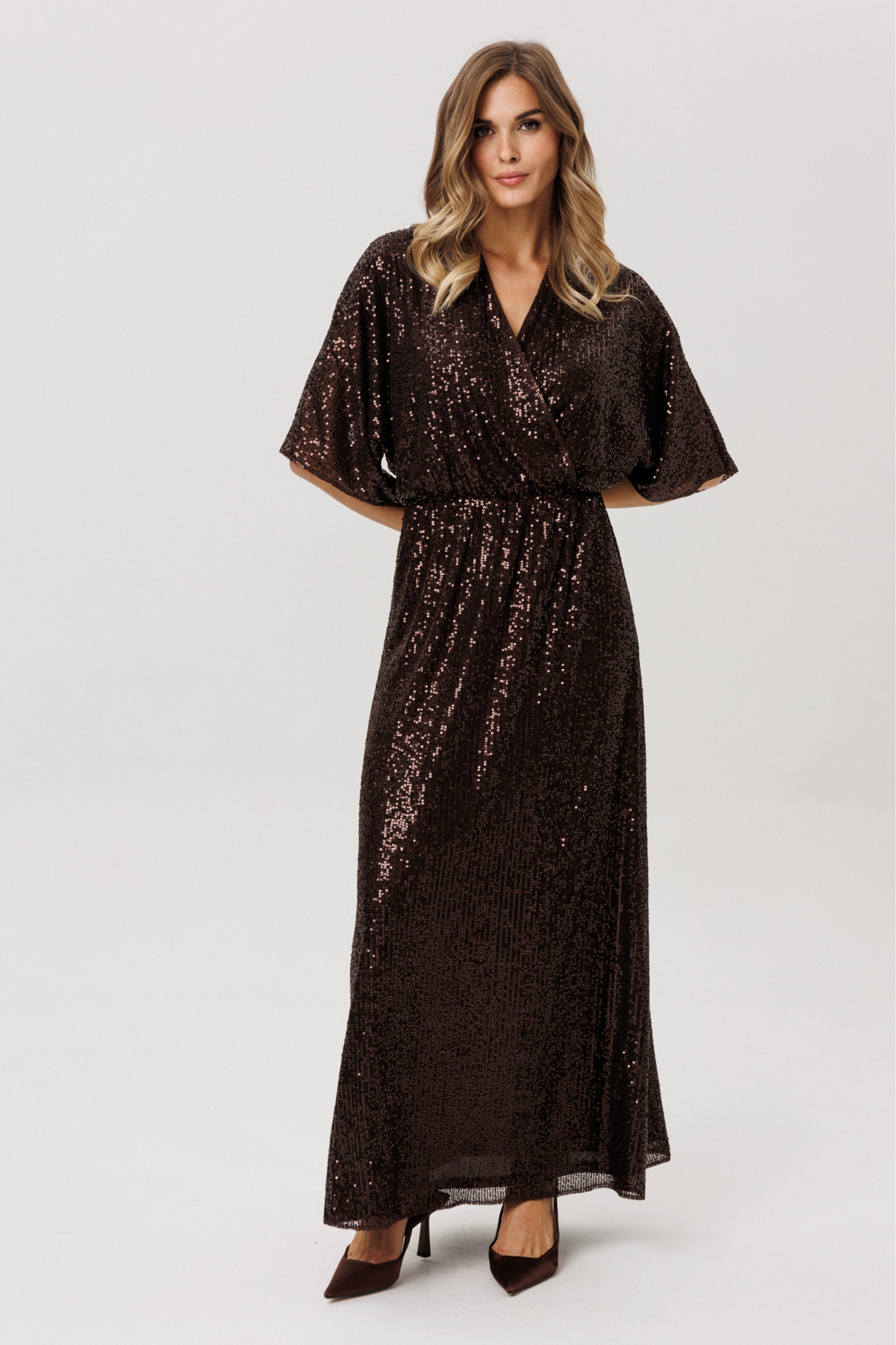 Платье выполнено из трикотажного полотна в пайетки. Платье X-образного силуэта, длиной миди, отрезное по линии талии. Лиф покроя кимоно. Перед выполнен на запах. Горловина V-образной формы. Переднее и заднее полотнище цельные и расширенные к низу. По линии талии эластичная тесьма. Платье на отлетной по низу трикотажной подкладке.