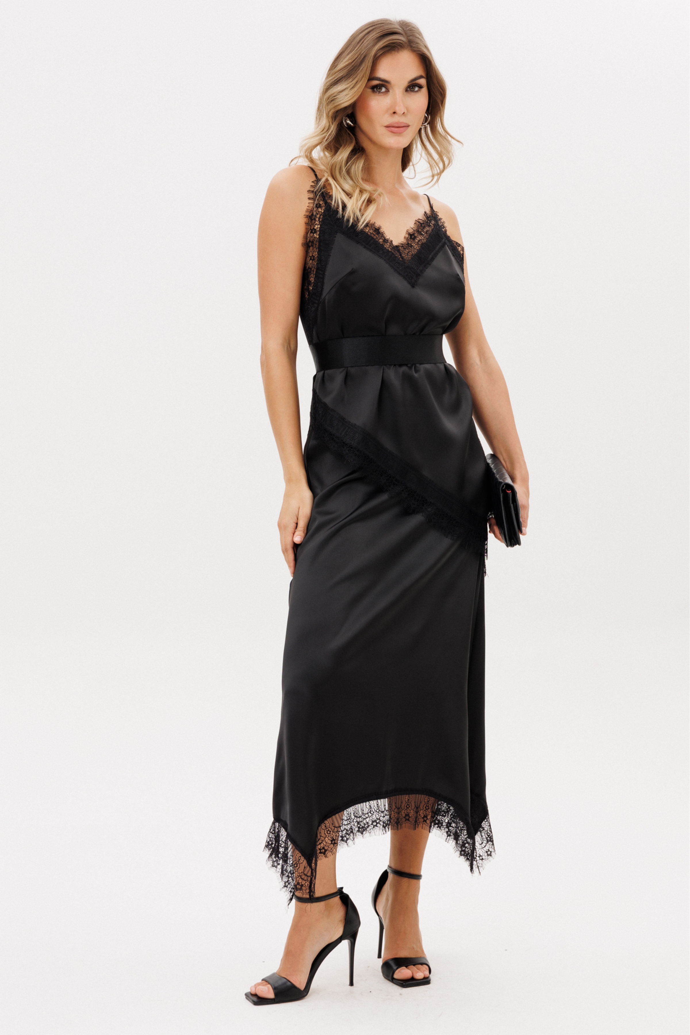 Топ выполнен из плотного атласа. Топ прямого силуэта длиной до линии бедер. Вырез V-образной формы формы. Топ декорирован тесьмой-кружевом по проймам, низу и разрезу слева . Топ на нерегулируемых бретелях.