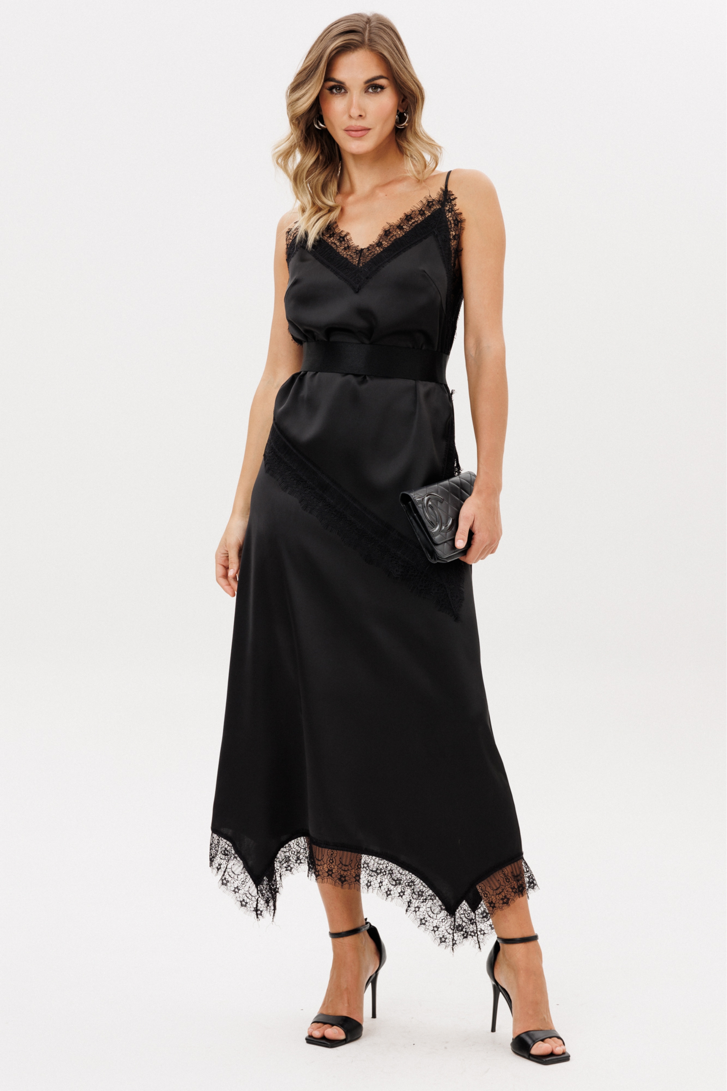 Юбка выполнена из атласа. Юбка А-образного силуэта, длиной миди. Переднее и заднее полотнище цельные и расширены к низу. Низ юбки фигурной формы, обработан кружевом. ВЗастежка в левом боковом шве на потайную молнию и пуговицу. Юбка без подкладки.