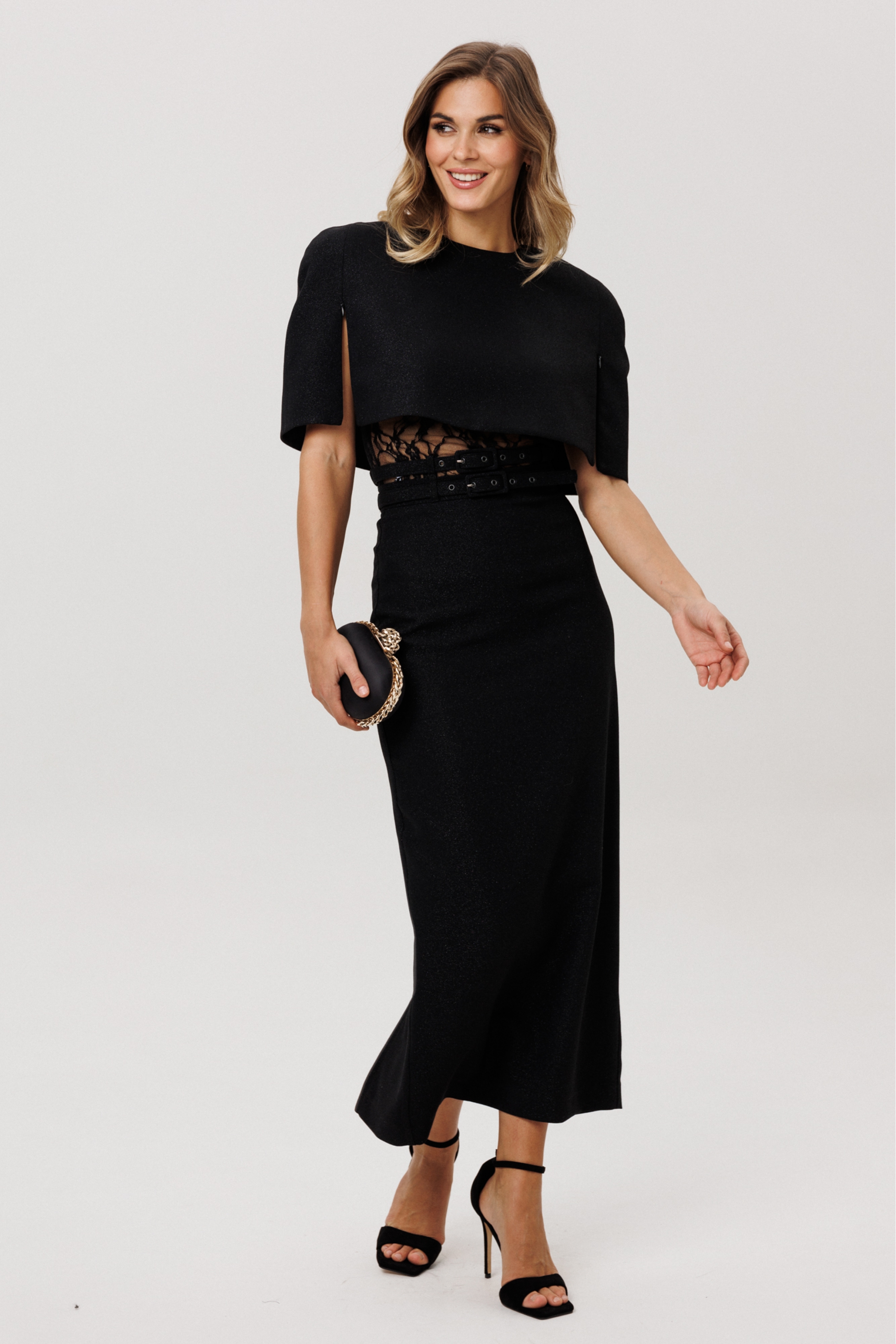 Юбка выполнена из костюмно-плательной ткани с блеском. Юбка прямого силуэта, зауженная к низу, длиной миди. Юбка на поясе, застегивающимя на петлю и пуговицу и на потайную молнию сзади в среднем шве. Юбка на отлетной по низу подкладке. В комплект входит два съемных ремня из основной ткани с обтяжной пряжкой и блочками.