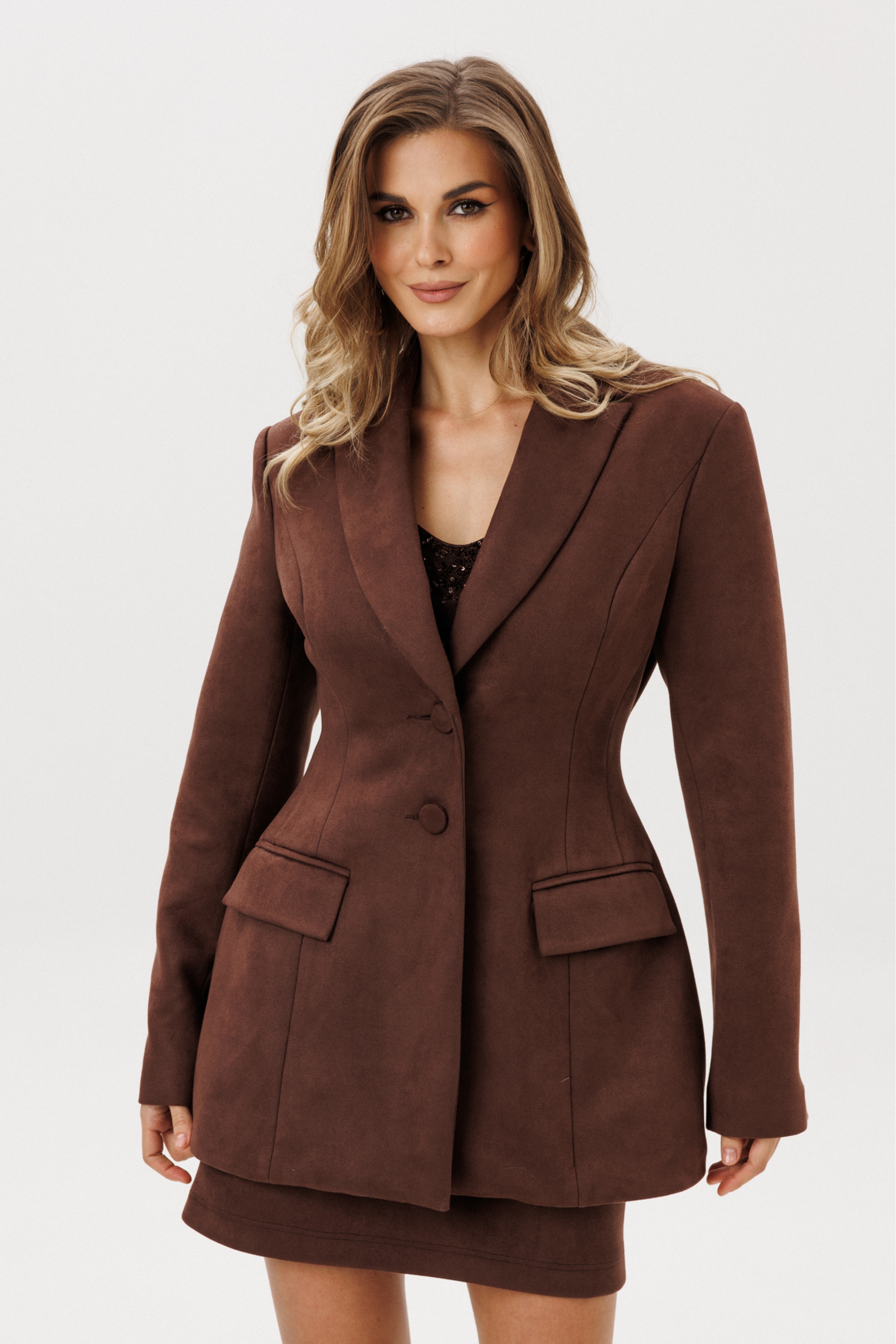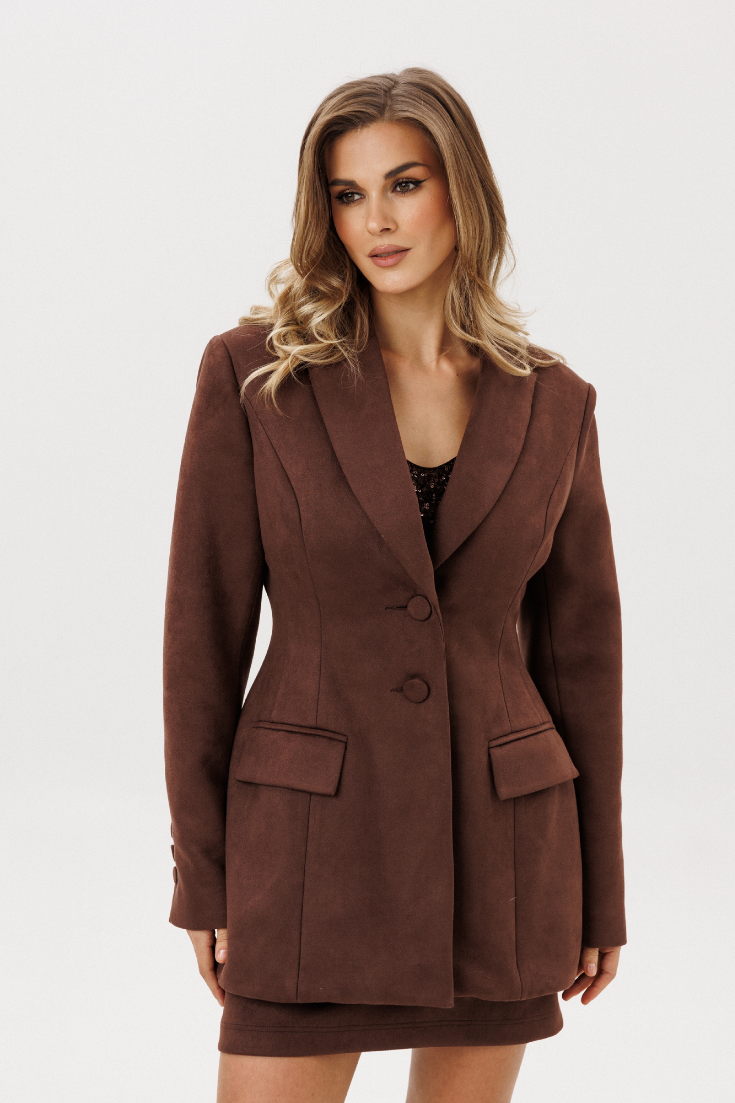 Жакет выполнине из плотной искуственной замши. Жакет Х-обраного силуэта, длиной ниже линии бедер. Спереди рельефы от проймы до низа, прорезные карманы с клапанами и центральная бортовая застежка на пуговицы. Воротник пиджачного типа. На спинке средний шов. Плечевой шов удлинен. Рукав втачной, двухшовный, по низу заднего шва шлица с застежкой на пуговицы. Жакет на притачной по низу подкладке.