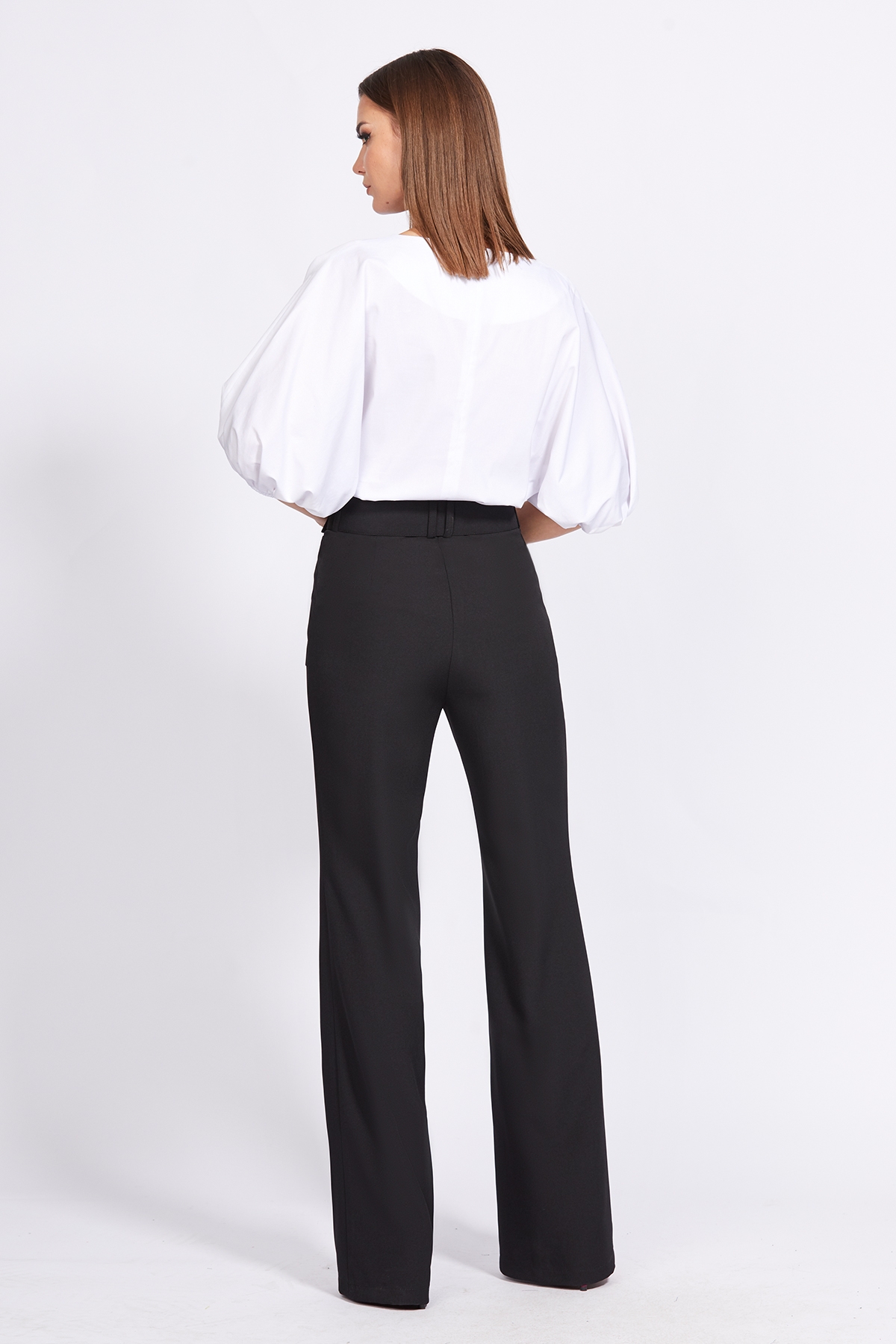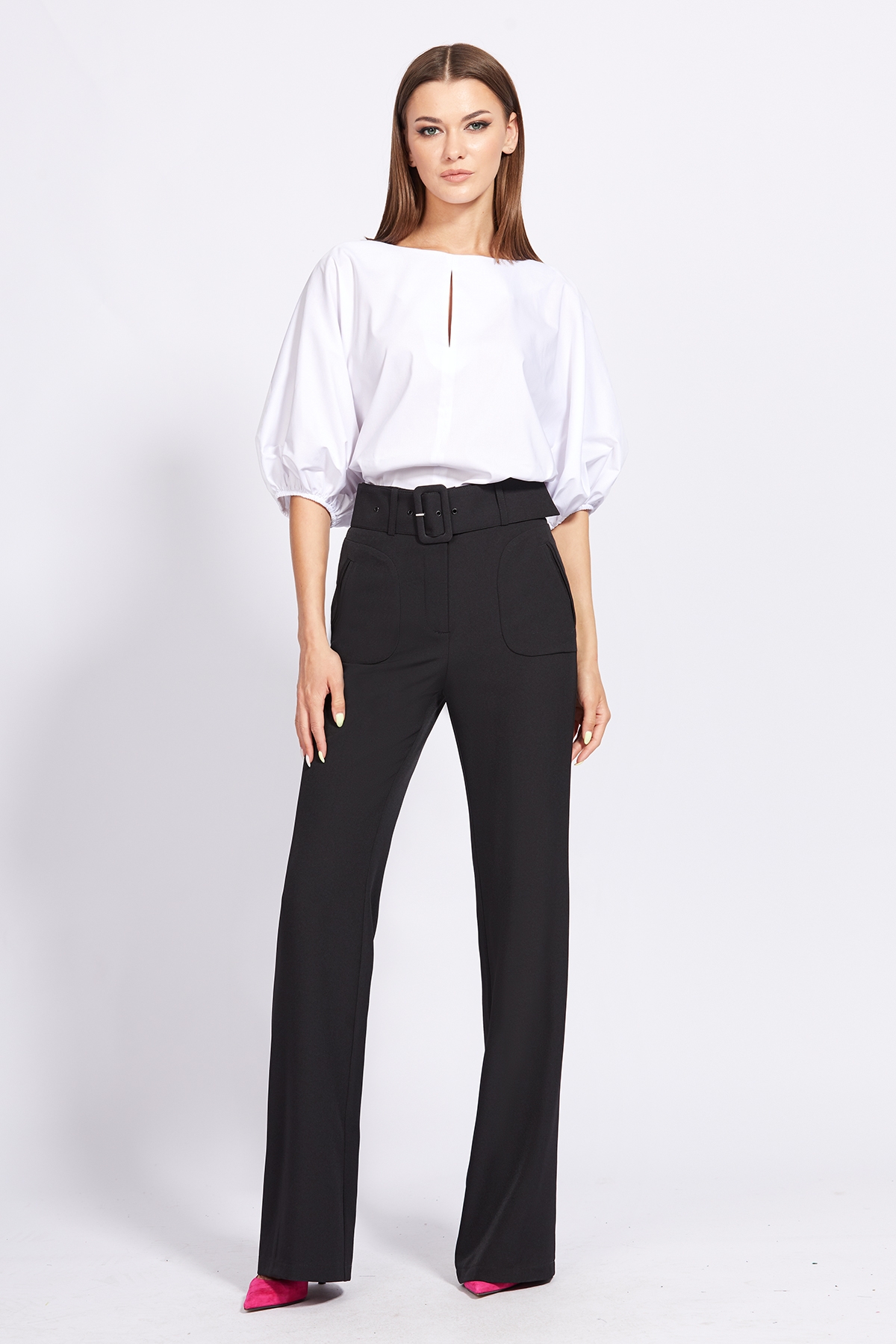 Блузка выполнена из блузочной ткани. Блузка О-образного силуэта, длиной до линии бедер. Спереди прорезь в среднем шве. Спинка со средним швом. горловина округлой формы. Рукав цельнокроеный, типа "кимоно", длиной ниже линии локтя, со сборкой по низу. Низ рукава на эластичной тесьме. В боковых швах разрезы.