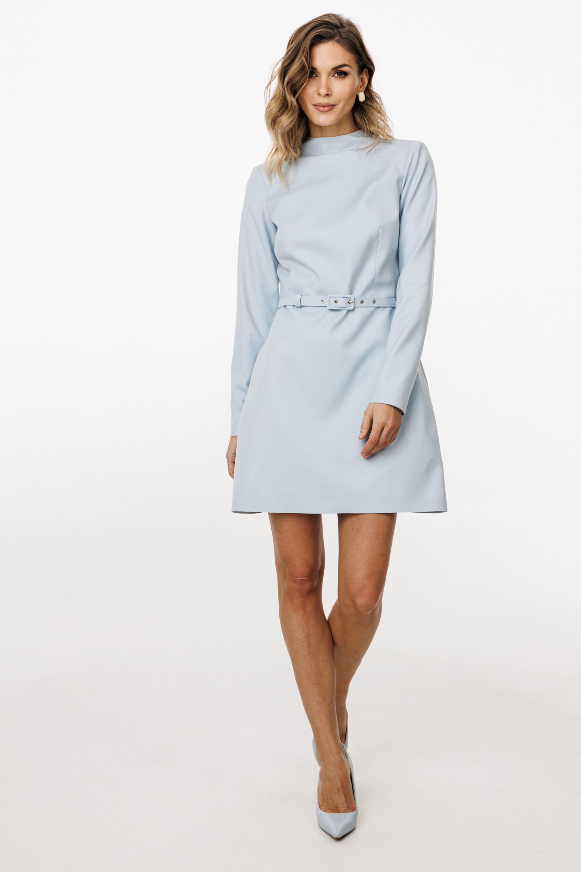 Платье выполнено из костюмно-плательной ткани. Платье Х-образного силуэта длиной выше линии колена. По переду лифа обработаны плечевые вытачки и нагрудные вытачки от горловины. Застежка на потайную молнию в среднем шве спинки. Горловина округлой формы в виде цельнокроеной стойки. Плечевой шов удлинен. Рукав втачного покроя, одношовный. Юбка прямого силуэта с расширением по линии бедер. Платье на притачной по низу подкладке.