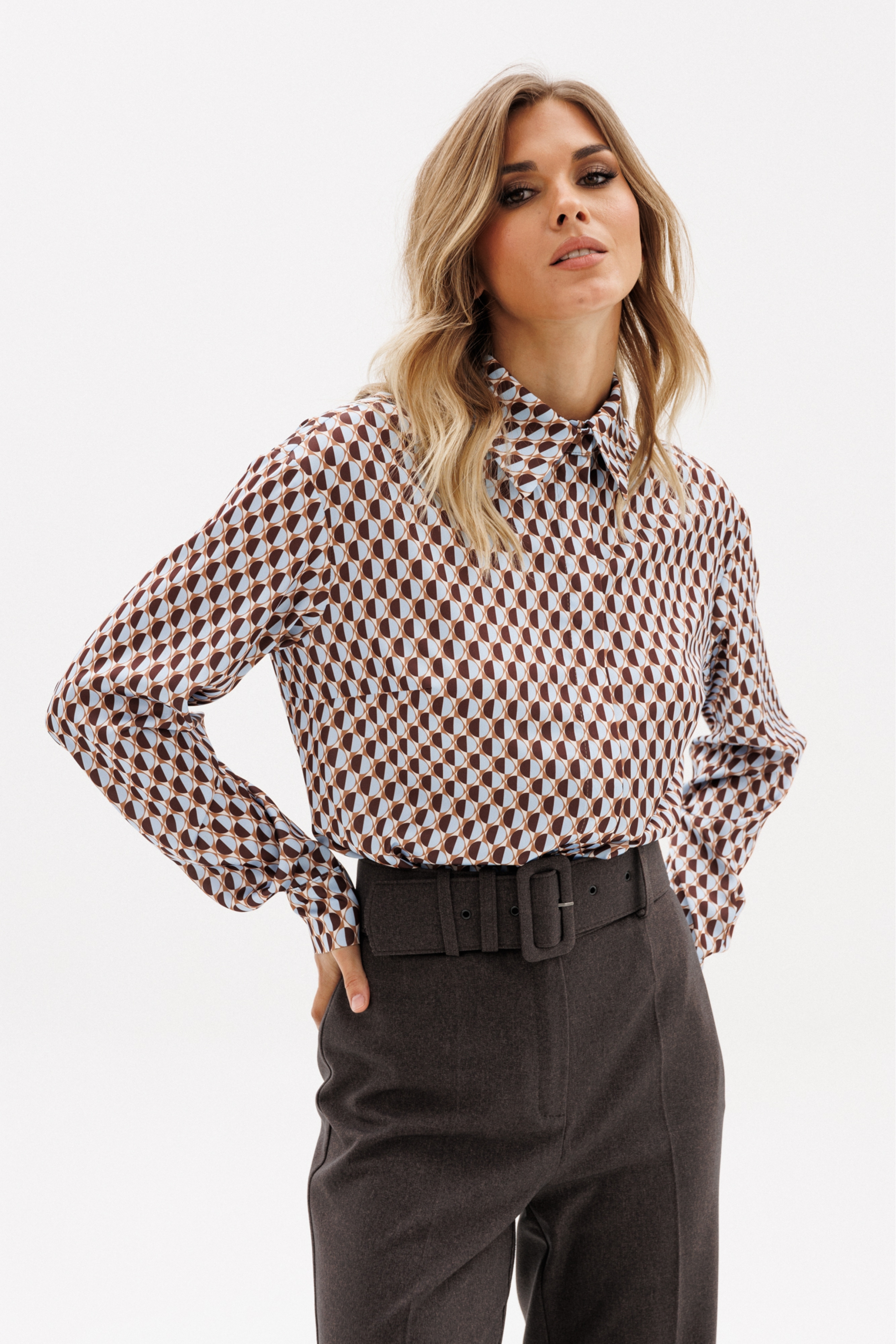 Блузка выполнена из тонкого атласа с принтом. Спереди центральная застежка на потайную планку с пуговицами. Спинка цельная. Воротник стояче-отложной. Плечевой шов удлинен. Рукав рубашечный одношовный. Низ рукава на притачной манжете.