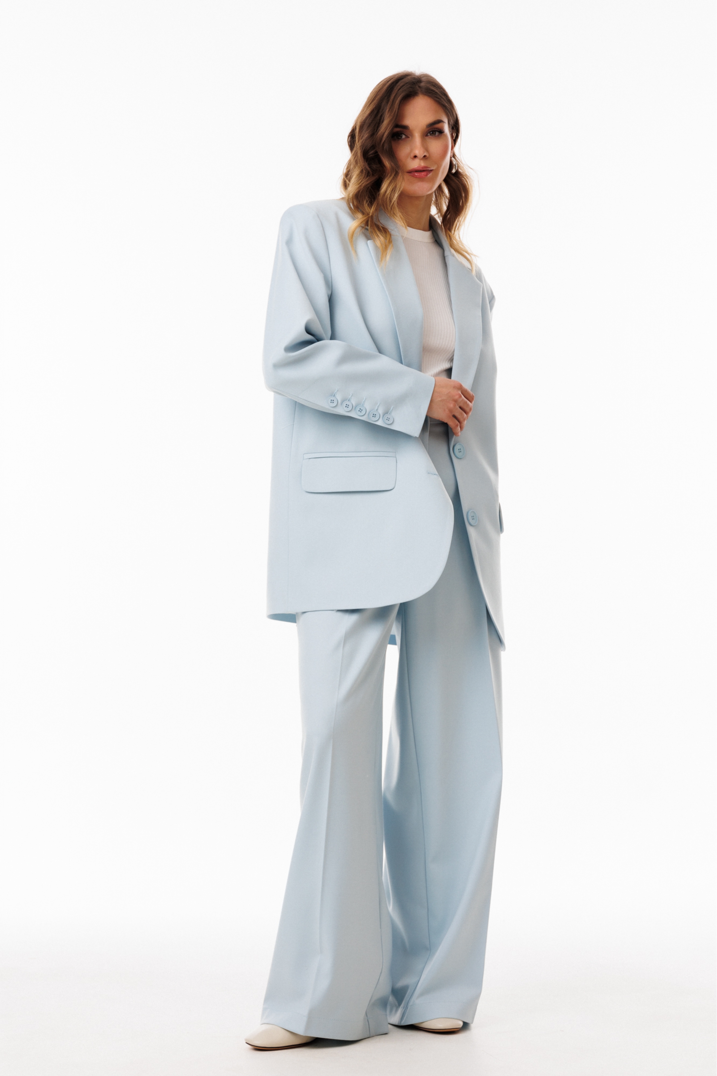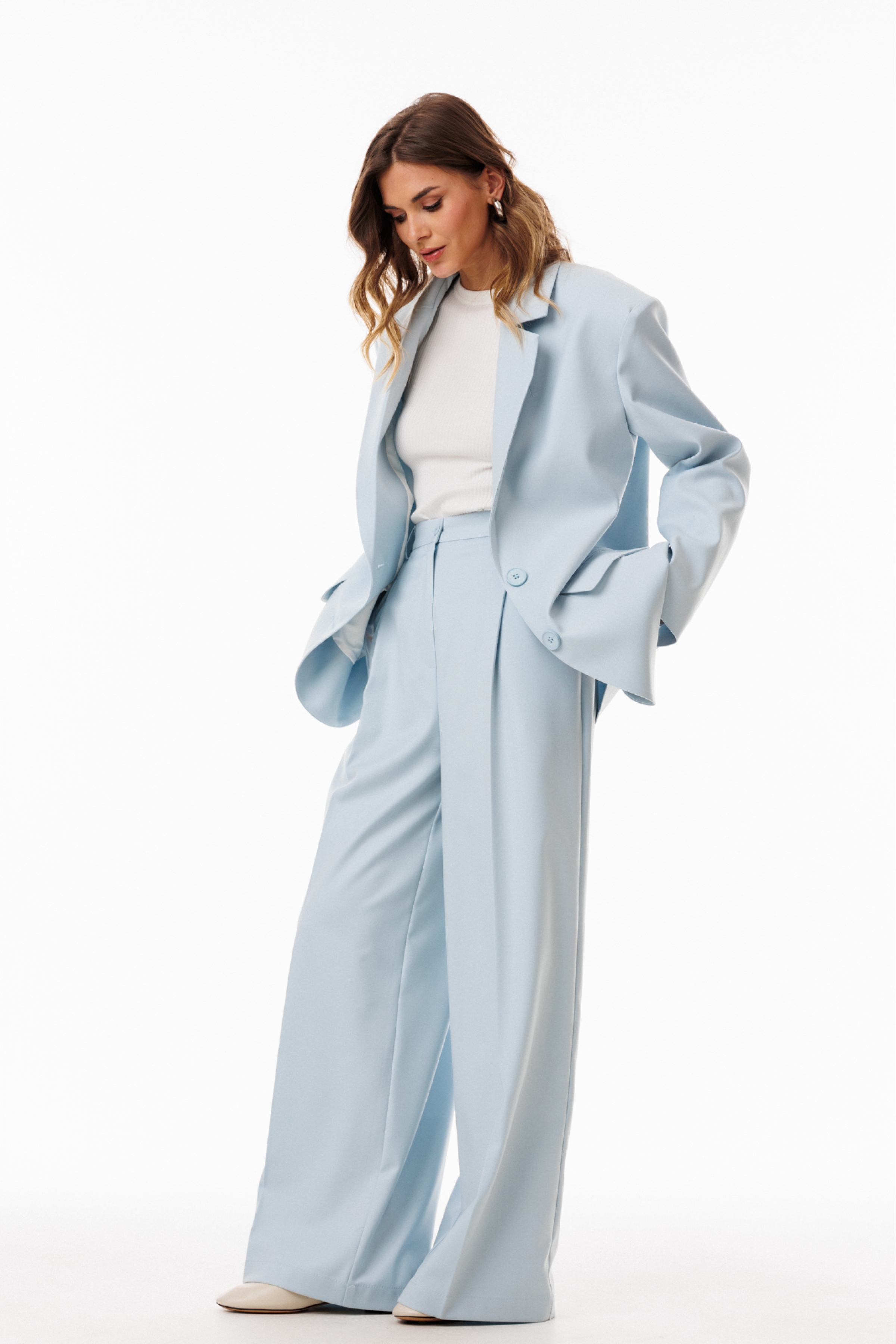 Брюки-палаццо выполнены из плательно-костюмной ткани. Брюки на притачном поясе, длиной в пол, расширенные к низу. Спереди складки и боковые карманы с наклонным входом. Застежка спереди на молнию с гульфиком и пуговицу. На задних частях обработаны талиевые вытачки.
