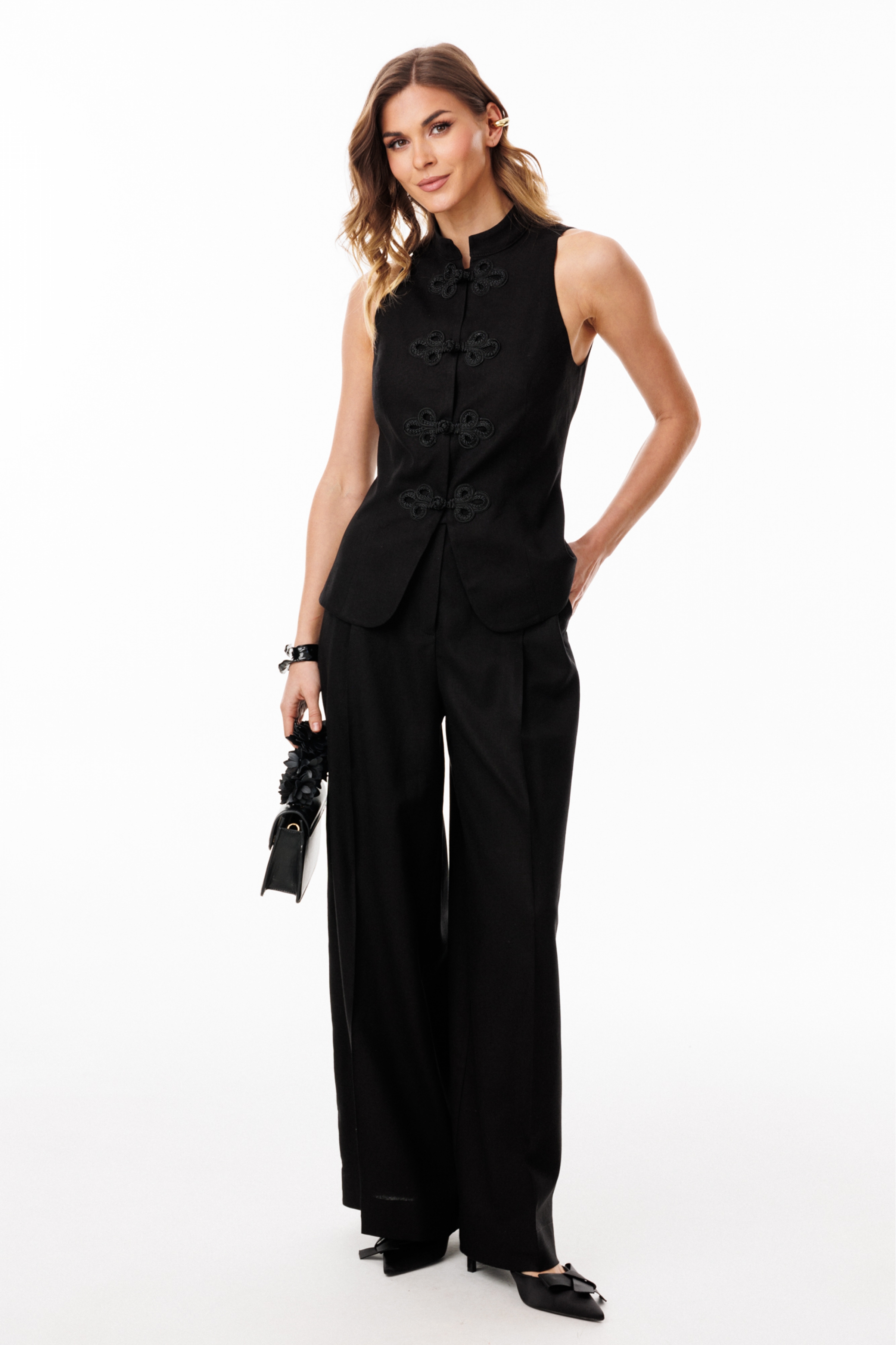 Брюки-палаццо выполнены из льна. Брюки на притачном поясе, длиной в пол, расширенные к низу. Спереди складки и боковые карманы с наклонным входом. Застежка спереди на молнию с гульфиком и пуговицу. На задних частях обработаны талиевые вытачки.