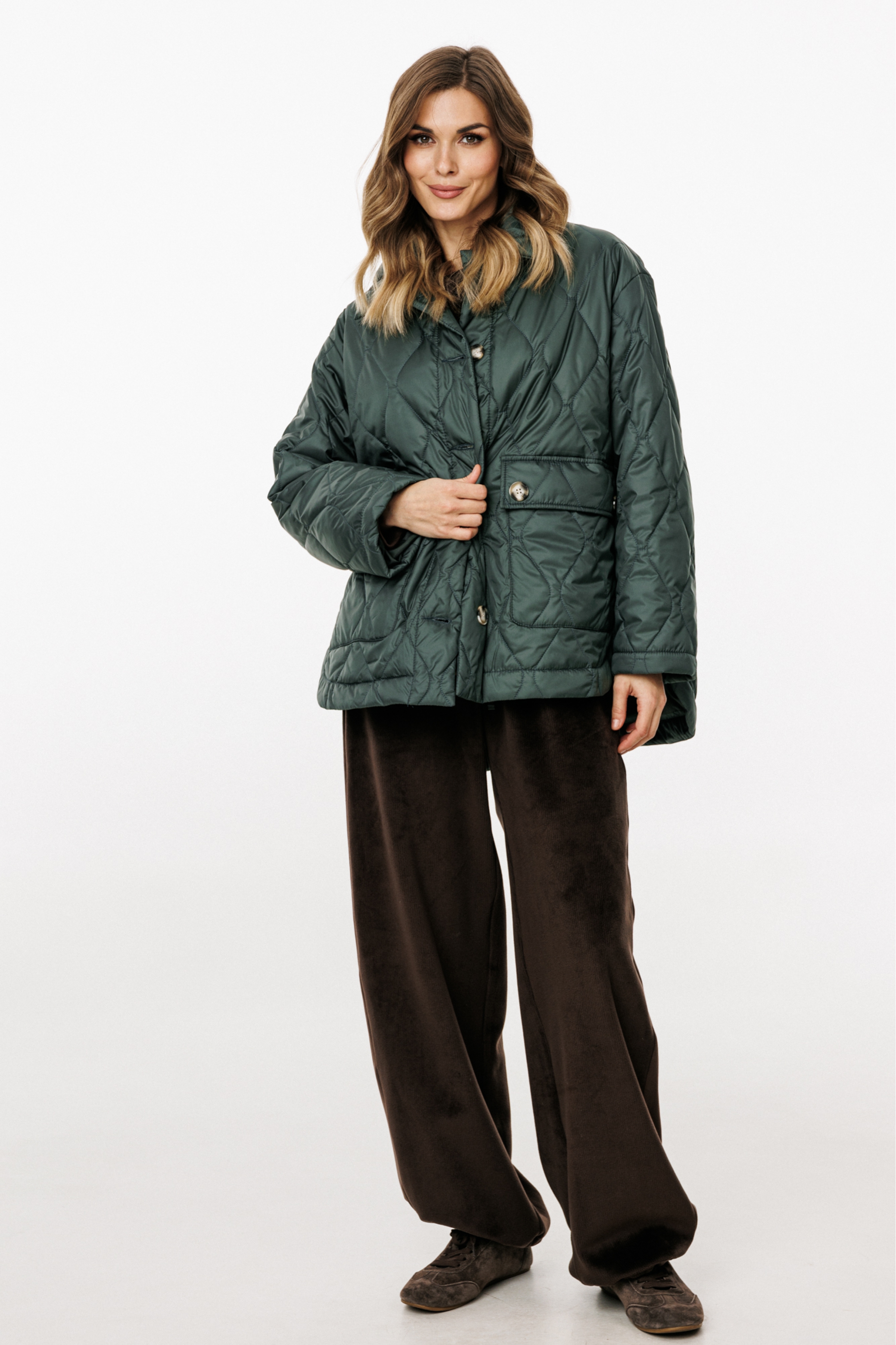 Комплект: джемпер+брюки. Комплект выполнен из двустороннего велюра в мелкий рубчик. Джемпер О-образного силуэта, покроя "oversize", длиной до линии бедер. Перед и спинка цельные. Горловина округлой формы, обработана бейкой. Плечевой шов удлинен. Рукав рубашечного покроя, одношовный. Низ рукава на манжете. Верхняя часть рукава переходит в кокетку переда т спинки и доходит до горловины. По низу джемпера обработан пояс. Пояс, манжеты, верхняя часть рукава и бейка горловины выполнены из основной, но без рубчика. Брюки на притачном поясе с эластичной тесьмой, прямого силуэта, длиной в пол, покроя "oversize". Боковой шов заменен лампасом. В швах лампаса карманы. Сзади накладные карманы. В пояс протянут шнур с наконечниками. По низу брюк втянута эластичная тесьма с фиксаторами. Лампасы и пояс выполнены из основной ткани, но без рубчика.