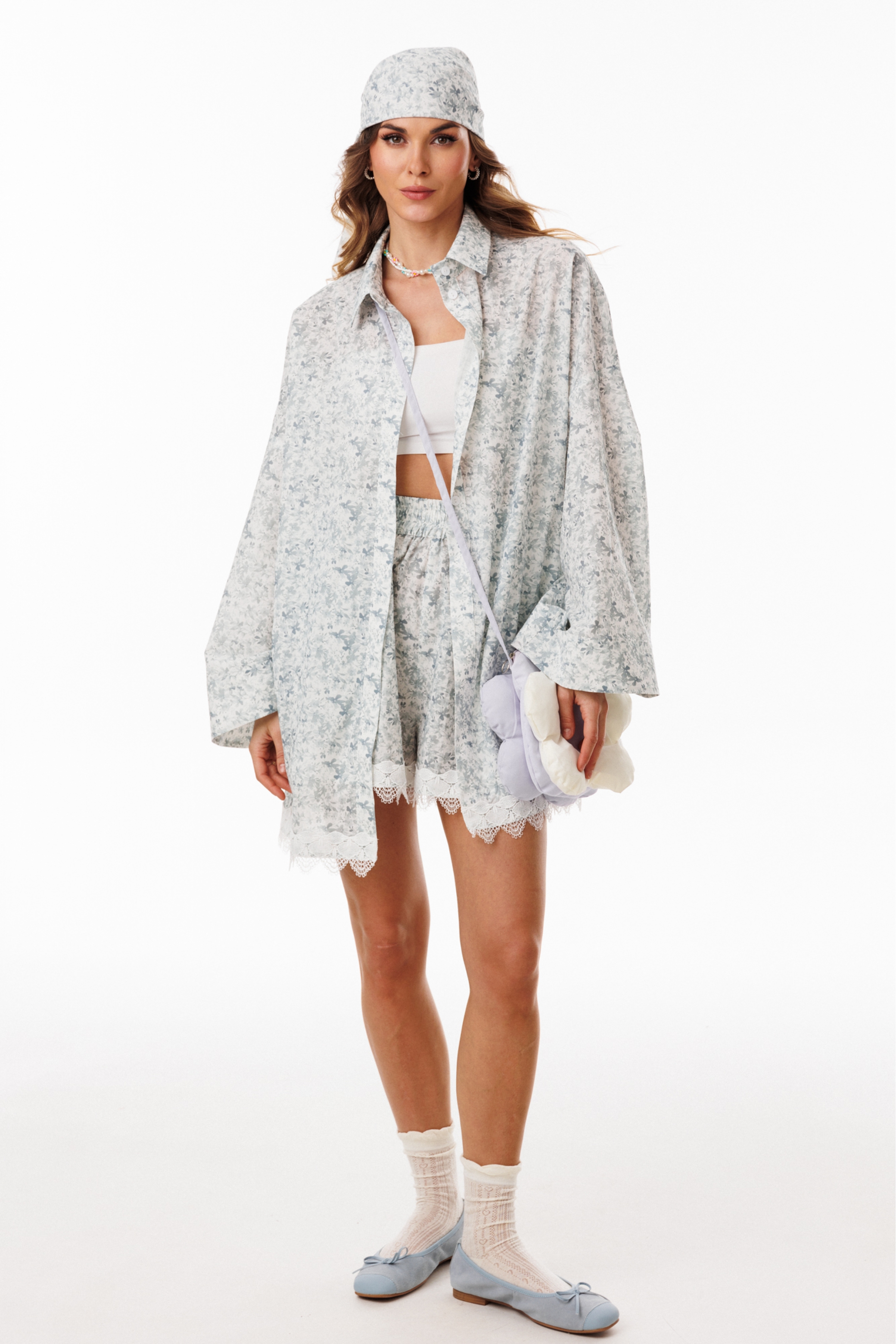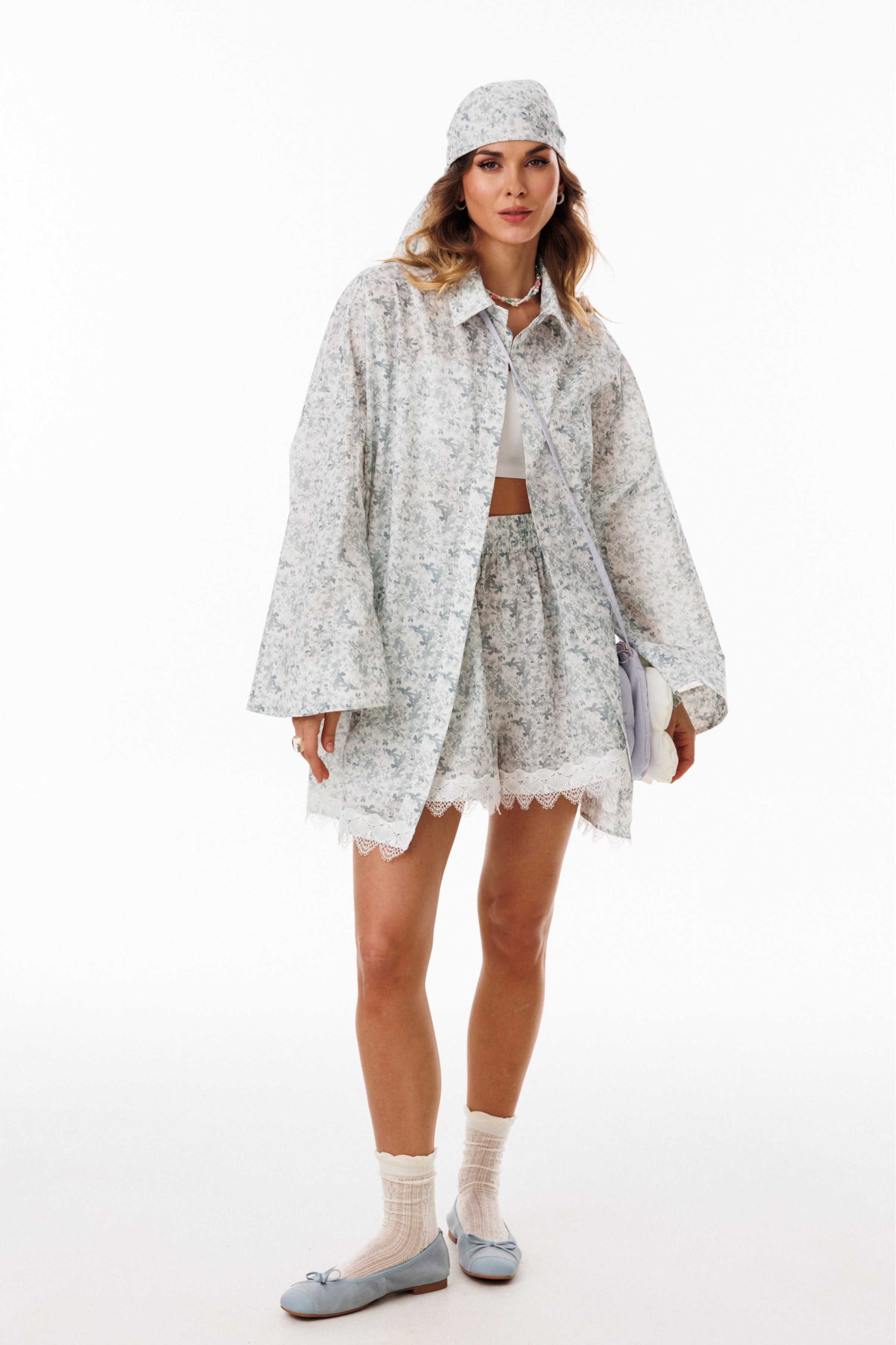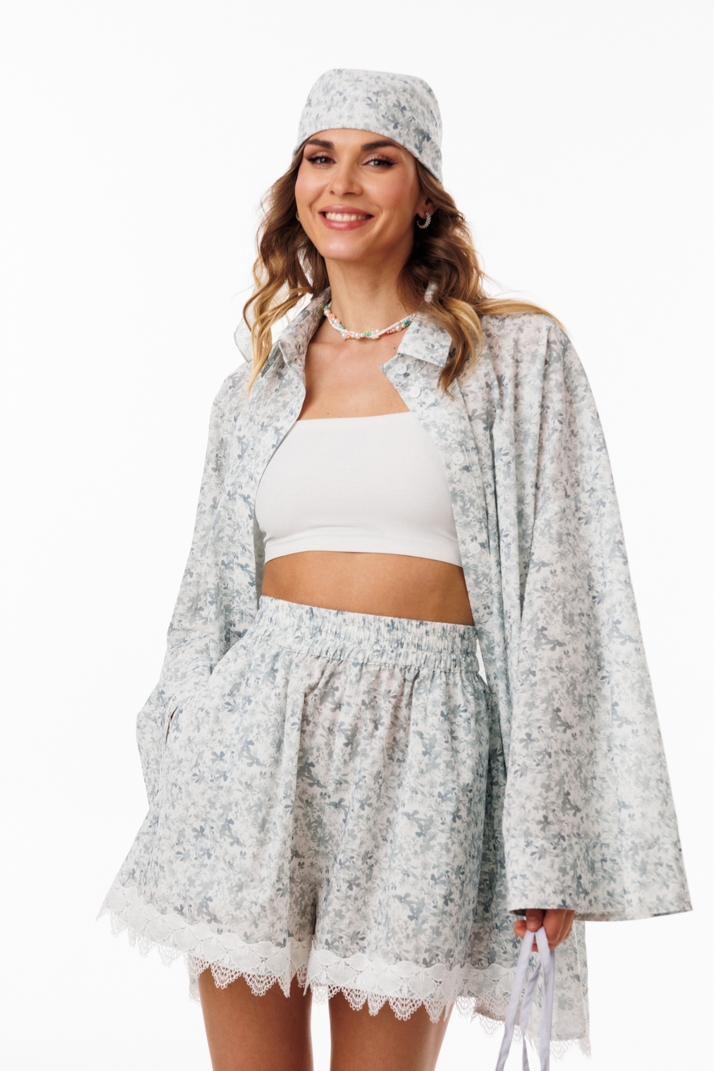 Комплект: блузка+шорты. Комплект выполнен из хлопчатобумажной плательно-блузочной ткани. Блузка прямого силуэта, покроя ""oversize"", длиной ниже линии бедер. По переду обработана центральная застежка до верха с планками на петли и пуговицы. Спинка цельная. Горловина обработана стояче-отложным воротником с отрезной стойкой. Плечевой шов удлинен. Рукав рубашечного покроя, одношовный, расширенный к низу. Низ блузки декорирован тесьмой-кружевом. Шорты на притачном поясе с эластичной тесьмой, длиной выше линии колена, расширенные к низу. На передних и задних частях обработаны талиевые вытачки. В боковых швах обработаны карманы. Низ шорт декорирован настрочной тесьмой-кружевом.