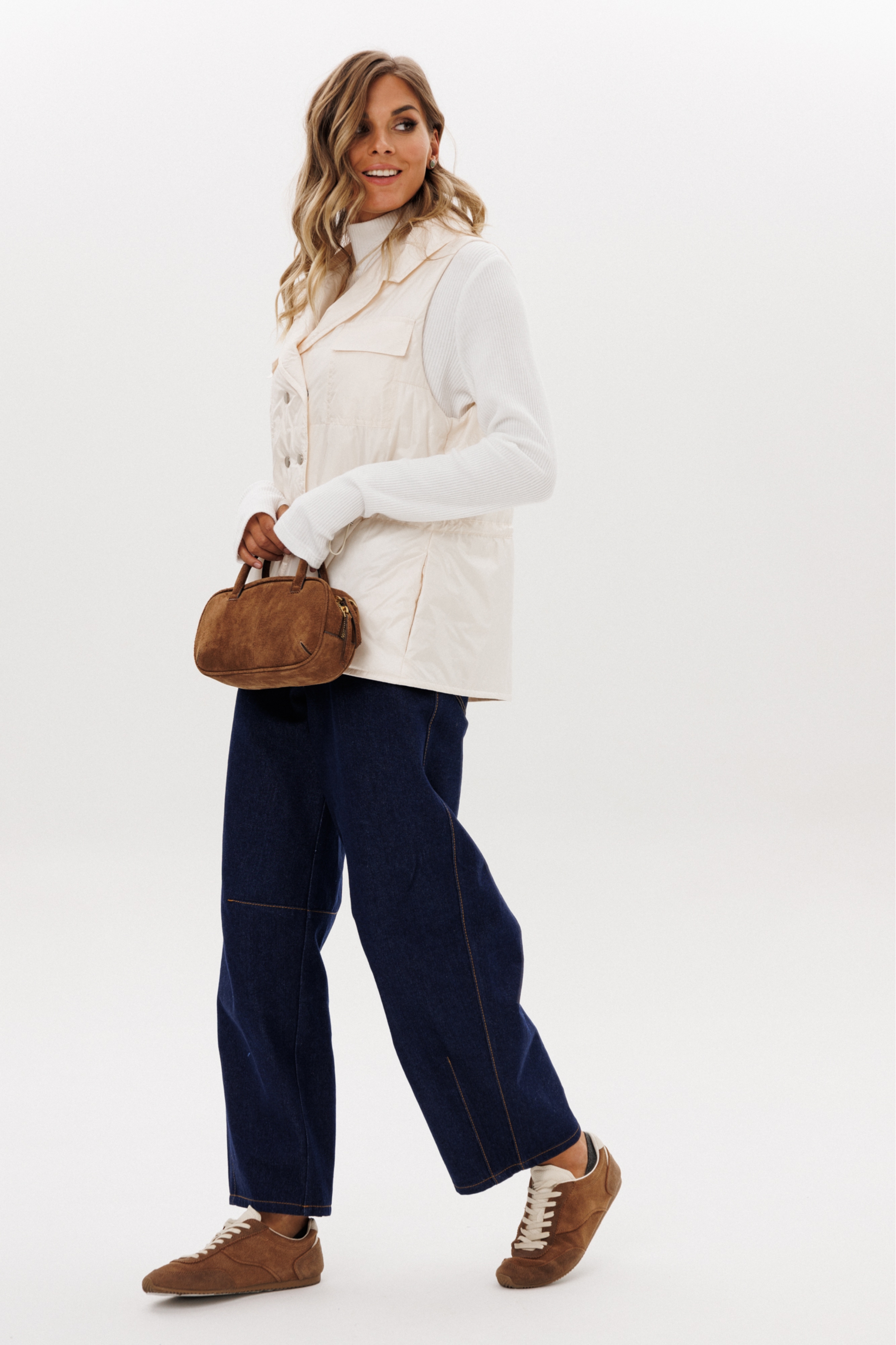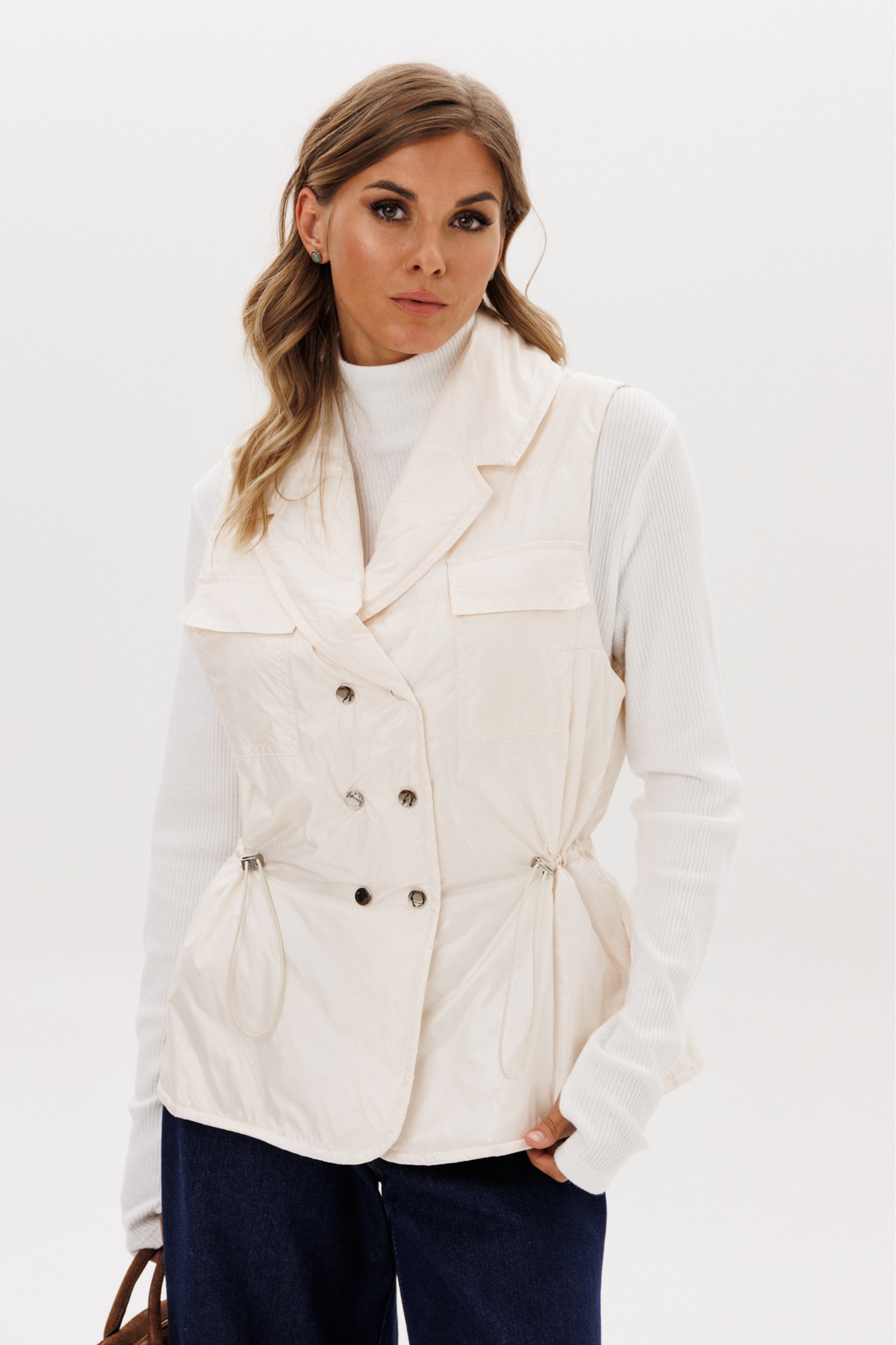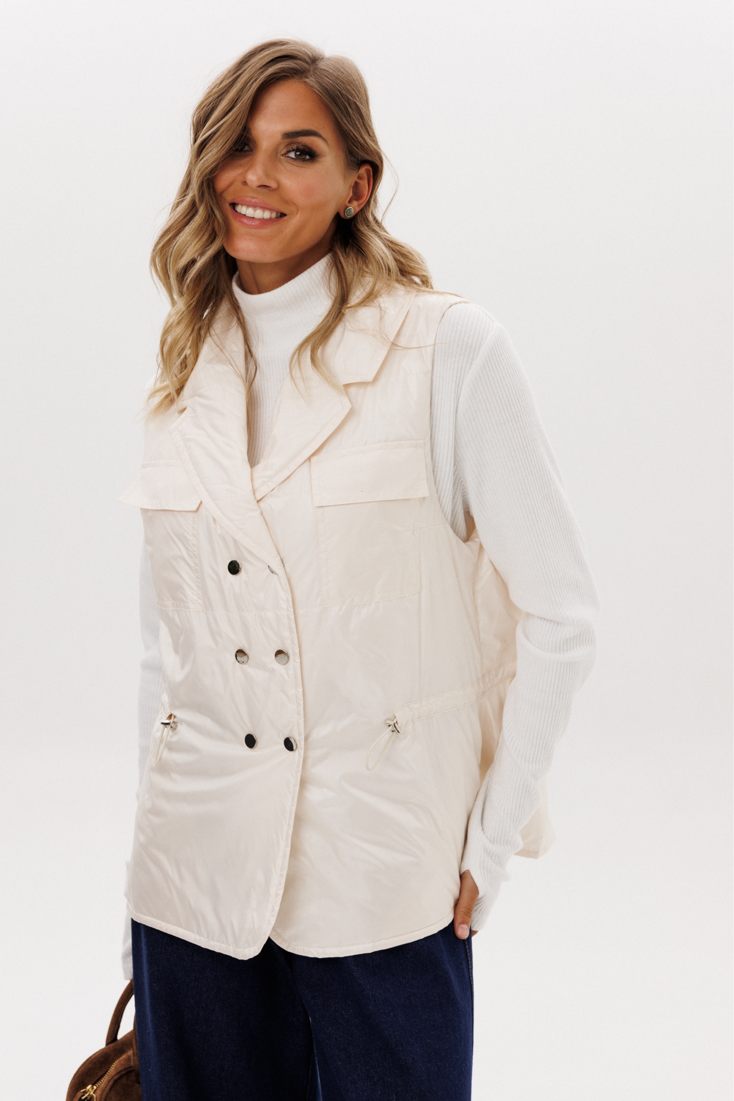Жилет выполнен из плащевой ткани с утеплителем Isosoft. Жилет полуприлегающего силуэта, длиной до линии бедер. Застежка спереди центральная двубортная на пробивные кнопки. Спереди лацканы, накладные нагрудные карманы с клапанами и боковые карманы в швах. Спинка цельная. Воротник пиджачного типа. По линии талии настрочена кулиса, в которой протянута эластичная тесьма с фиксаторами. Жилетка на подкладке из основной ткани.