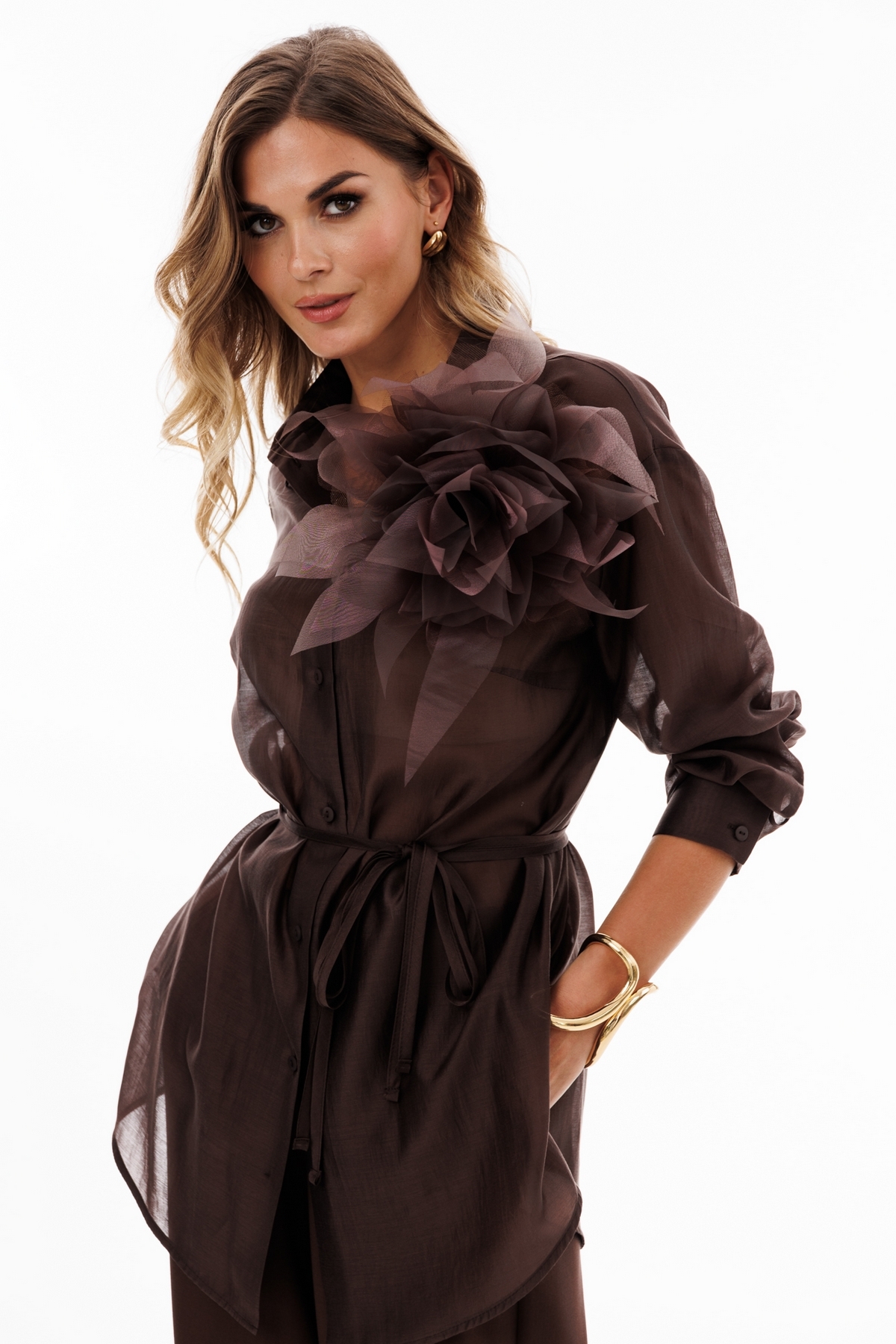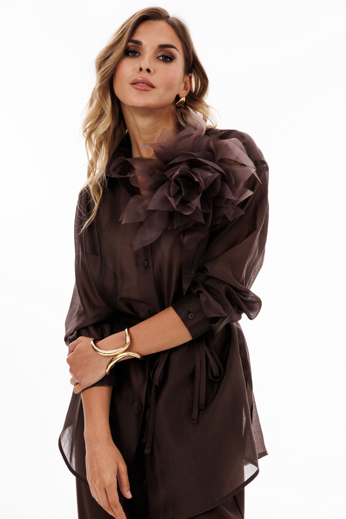 Блузка выполнена из плательно-блузочной ткани. Блузка прямого силуэта, длиной до линии бедер. Спереди центральная застежка на пуговицы. Воротник стояче-отложной. Плечевой шов удлинен. Рукав рубашечного кроя, одношовный с прорезью и двумя складками по низу. Рукав на притачной манжете. Низ блузки фигурной формы. В комплект входит пояс из основной ткани.