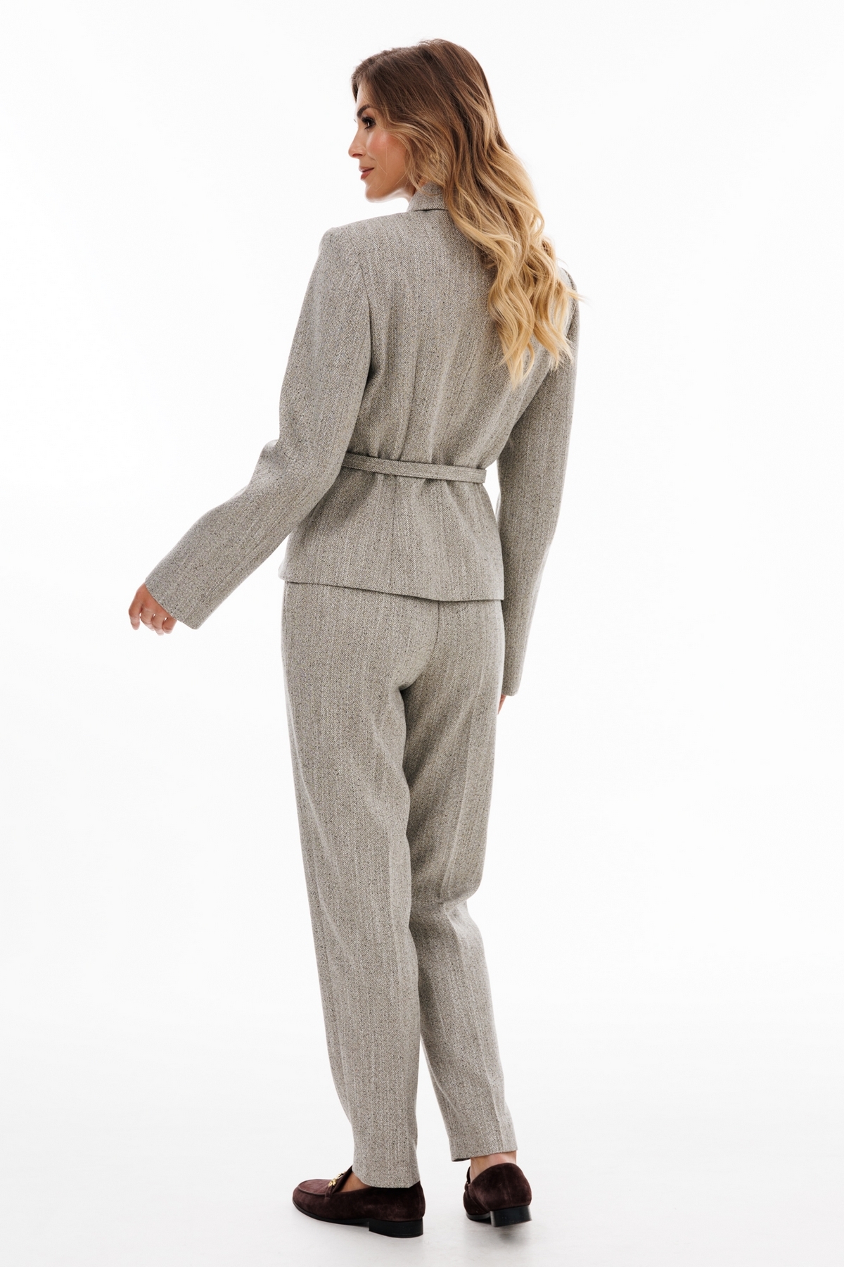 Брюки выполнены из костюмной ткани меланж с рисунком "елочка". Брюки зауженные к низу, длиной 7/8, на притачном поясе. Спереди боковые карманы с наклонным входом и застежка на пуговицу и молнию с гульфиком. По задней части пояса эластичная тесьма. Передние и задние части брюк заутюжены на кант.
