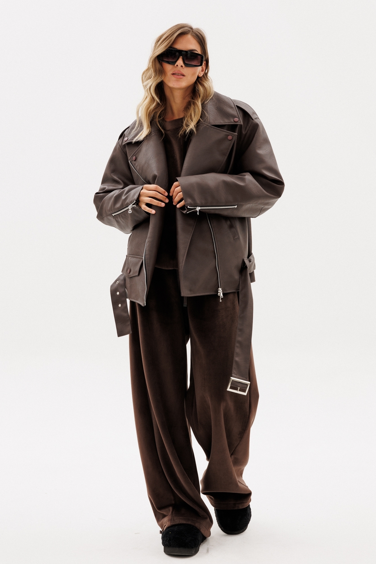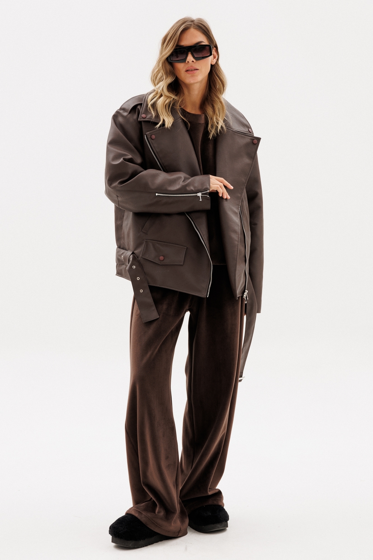 Комплект: джемпер+брюки. Комплект выполнен из двустороннего велюра в мелкий рубчик. Джемпер О-образного силуэта, покроя "oversize", длиной до линии бедер. Перед и спинка цельные. Горловина округлой формы, обработана бейкой. Плечевой шов удлинен. Рукав рубашечного покроя, одношовный. Низ рукава на манжете. Верхняя часть рукава переходит в кокетку переда т спинки и доходит до горловины. По низу джемпера обработан пояс. Пояс, манжеты, верхняя часть рукава и бейка горловины выполнены из основной, но без рубчика. Брюки на притачном поясе с эластичной тесьмой, прямого силуэта, длиной в пол, покроя "oversize". Боковой шов заменен лампасом. В швах лампаса карманы. Сзади накладные карманы. В пояс протянут шнур с наконечниками. По низу брюк втянута эластичная тесьма с фиксаторами. Лампасы и пояс выполнены из основной ткани, но без рубчика.
