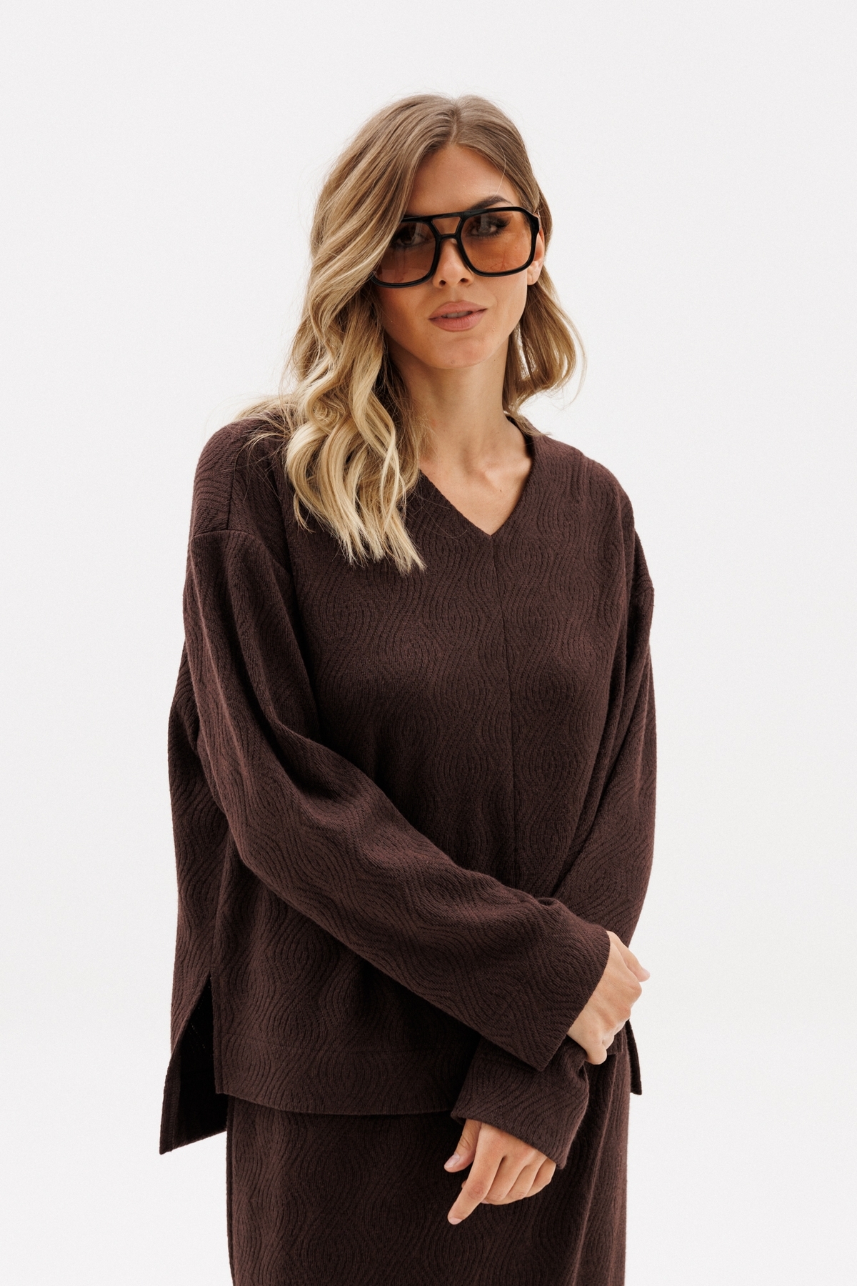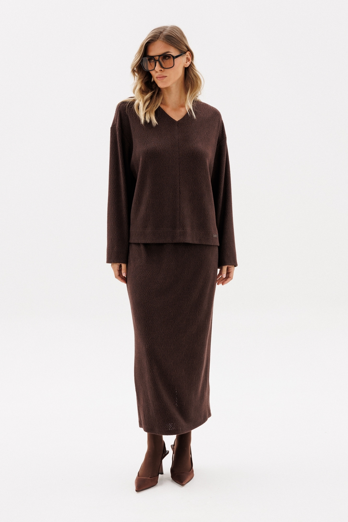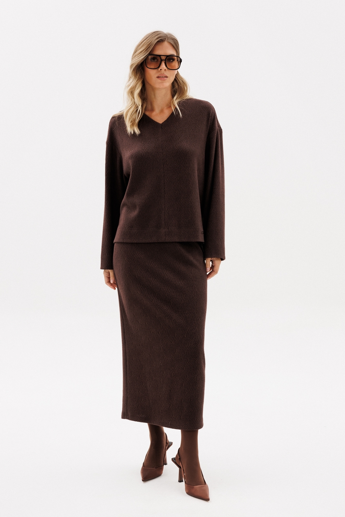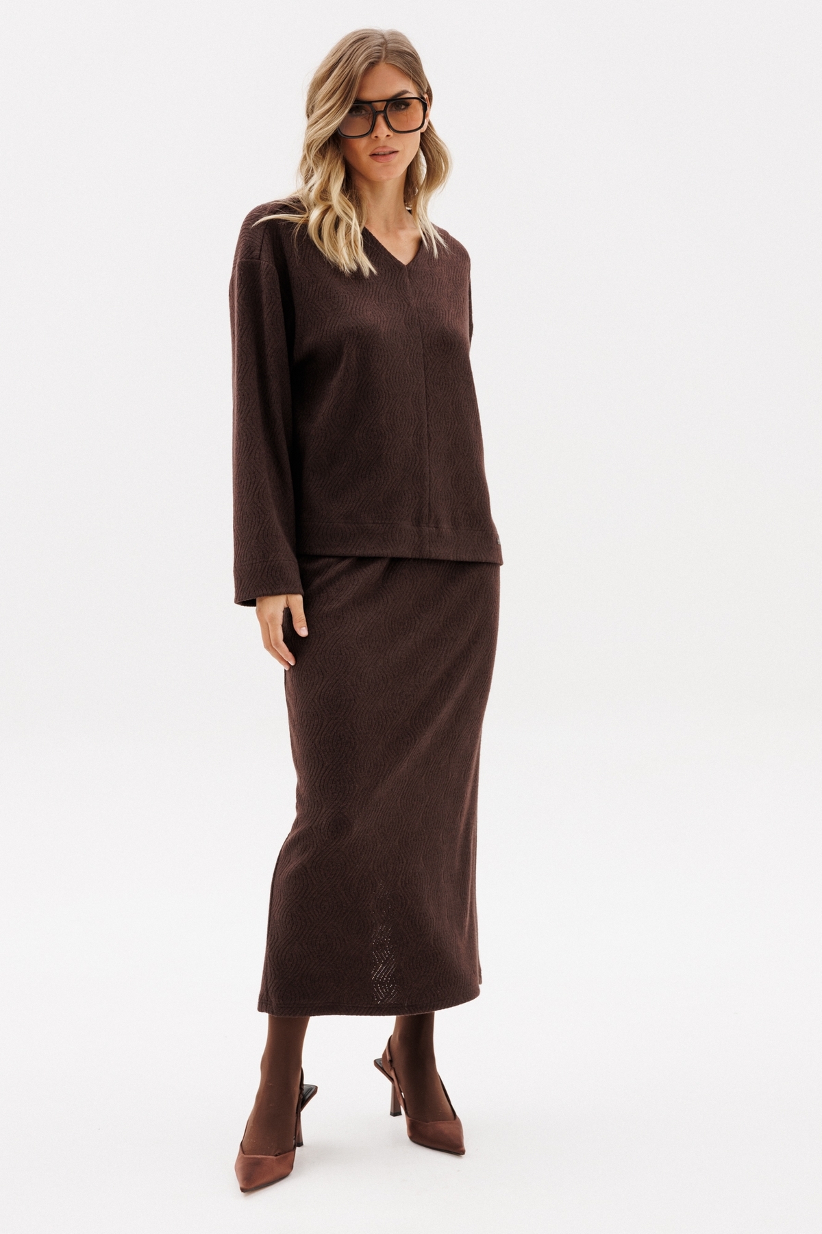 Комплект: джемпер + юбка. Комплект выполнен из трикотажного полотна с рисунком. Джемпер прямого силуэта, длиной до линии бедра. Перед со средним швом. Спинка цельная. Горловина V-образной формы. Плечевой шов спущен. Рукав рубашечного покроя, одношовный. В боковых швах разрезы. Спинка длиннее переда. Юбка слегка заужена к низу, на цельнокроенном поясе с эластичной тесьмой, длиной миди. Юбка без подкладки, сзади шлица в среднем шве.