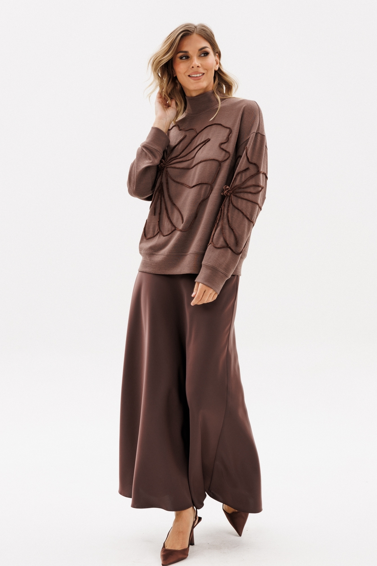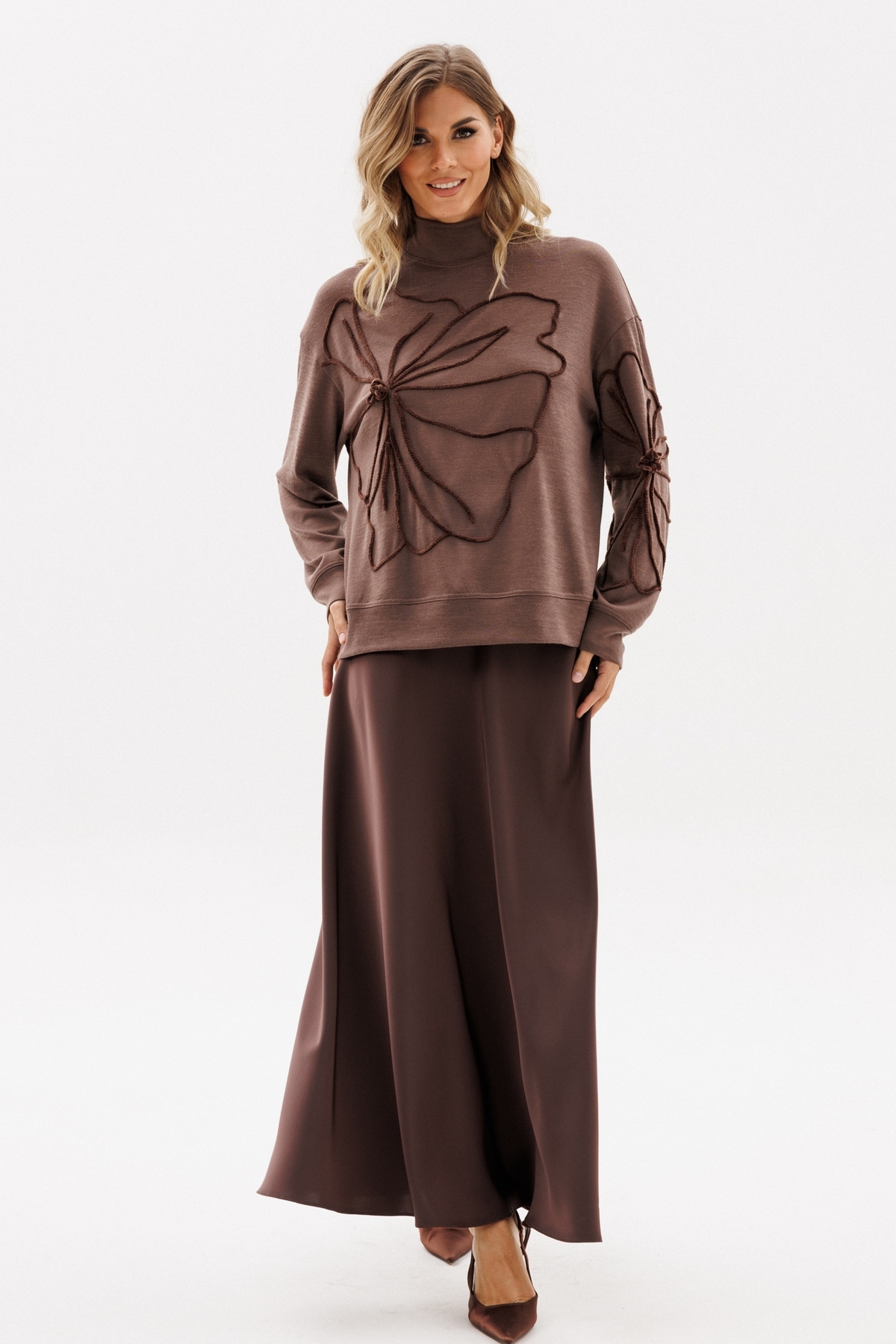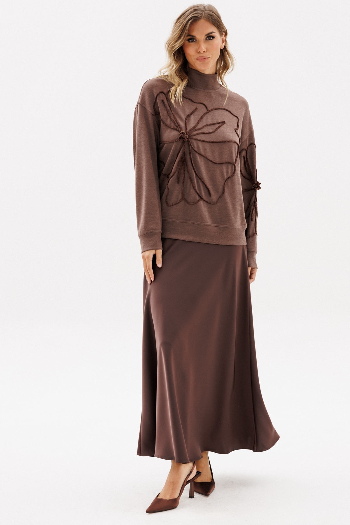 Юбка выполнена из плотного атласа. Юбка расширенная к низу, на притачном поясе, длиной миди.Переднее и заднее полотнища цельные и выкроены по косой. Застежка в левом боковом шве на потайную молнию и пуговицу. Юбка без подкладки.