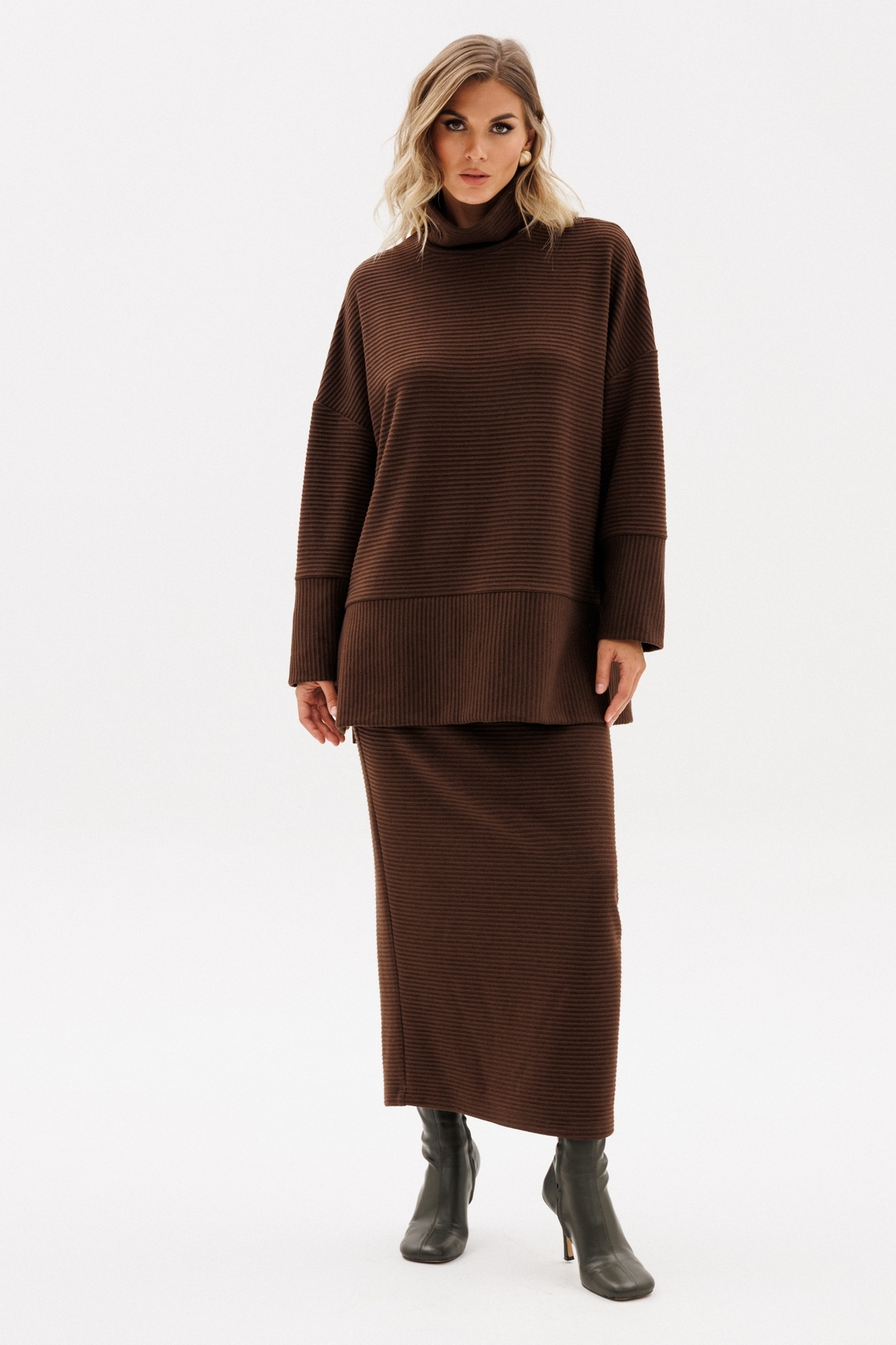 Юбка выполнена из трикотажного полотна в рубчик. Юбка прямого силуэта, длиной миди, на цельнокроеном поясе с эластичной тесьмой. Сзади разрез в среднем шве.