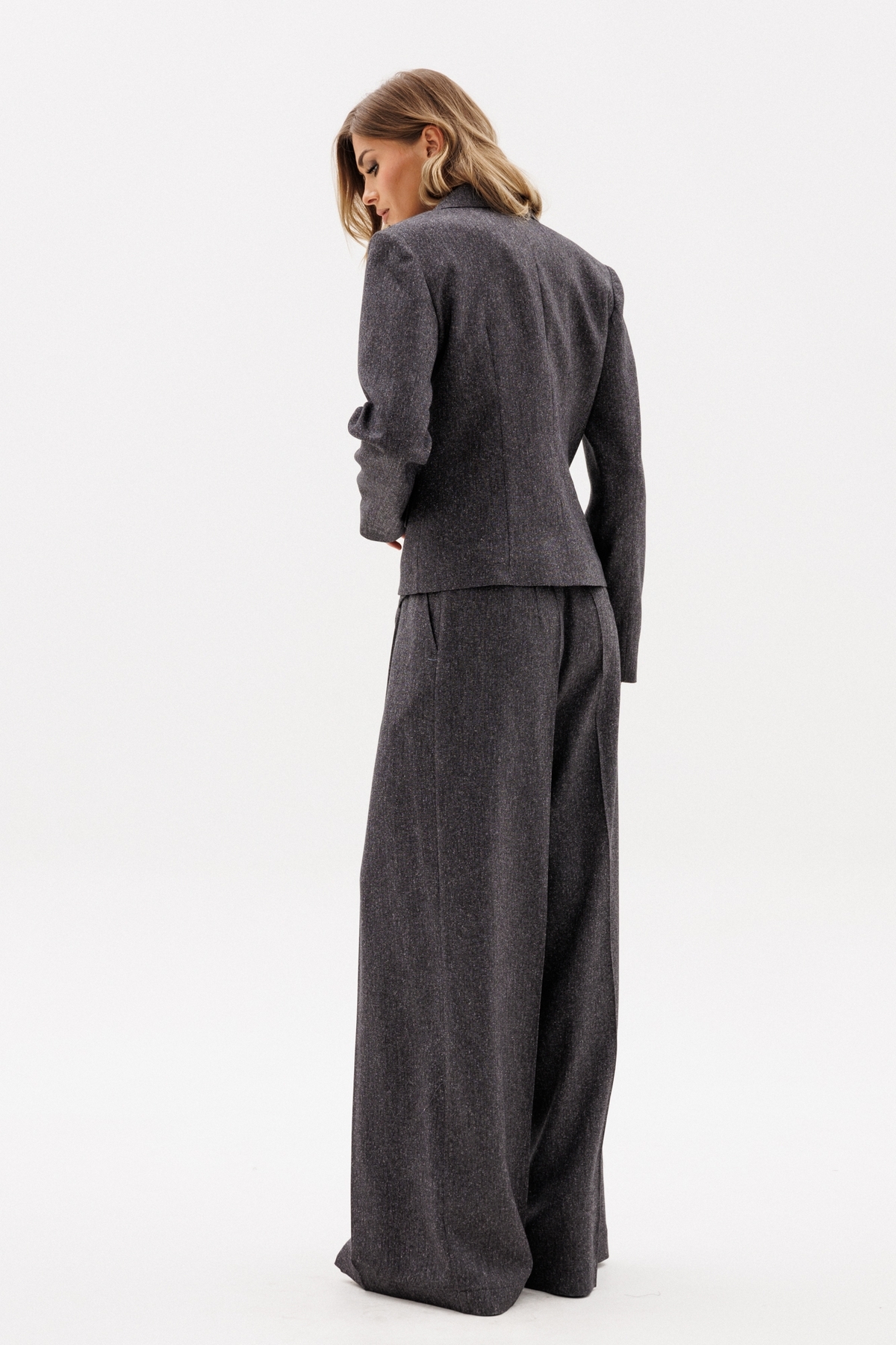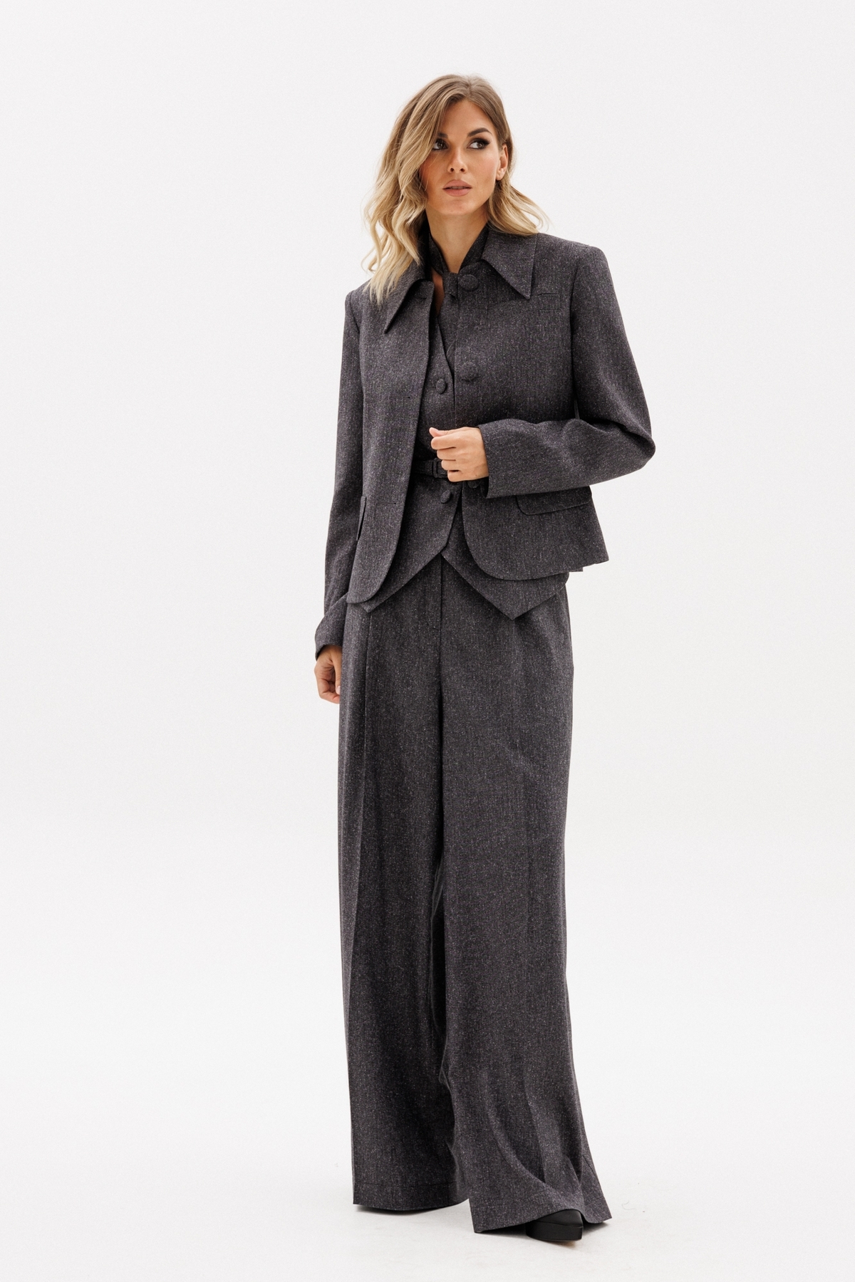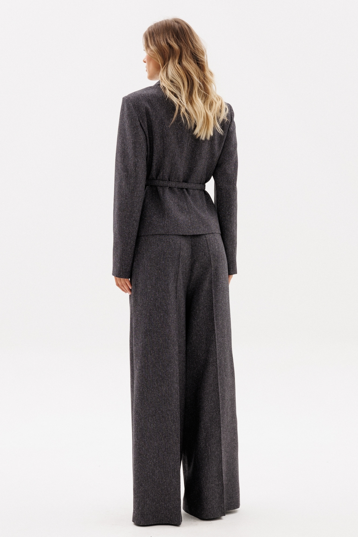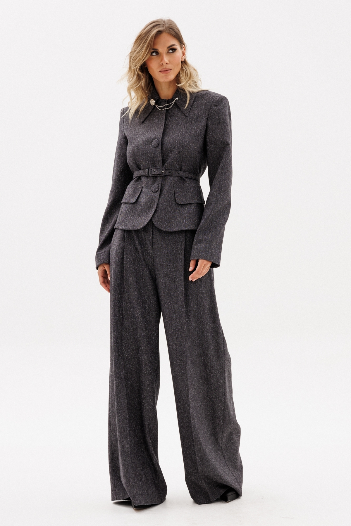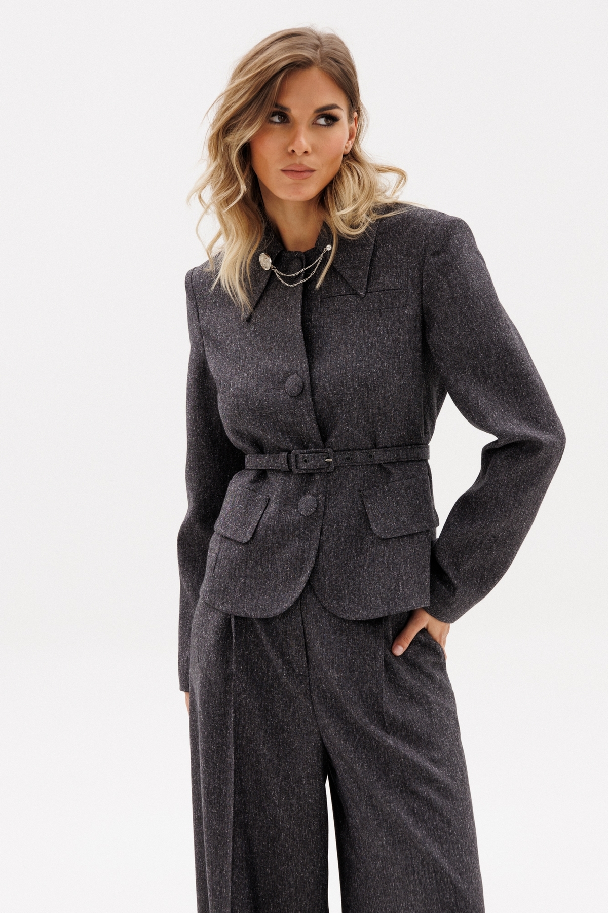 Жакет выполнен из костюмной ткани меланж. Жакет полуприлегающего силуэта длиной выше линии бедер. Спереди центральная застежка на пуговицы и  декоративные клапаны. Воротник стояче-отложной. Спинка со средним швом. Рукав втачного покроя двухшовный. Жакет на притачной по низу подкладке. В комплект входит ремень из основной ткани с обтяжной пряжкой.