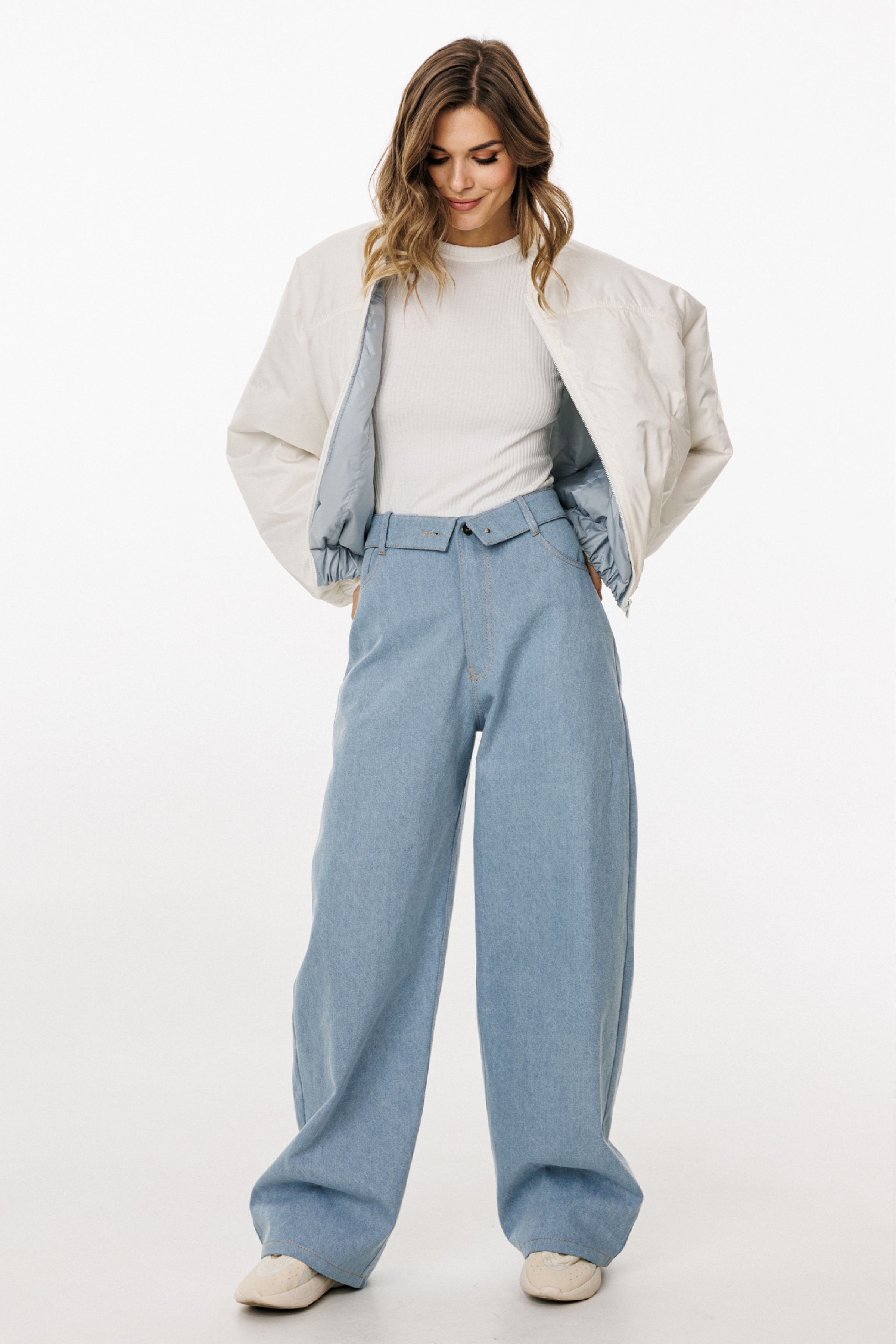 Брюки выполнены из плотного джинса. Брюки прямого силуэта, на притачном поясе, длиной в пол. На передних частях обработаны фигурные боковые карманы и застёжка на металлическую молнию и пуговицу. На задних частях обработаны кокетки и накладные карманы. Пояс выполнен с декоративным отворотом на лицо. По поясу обработаны 5 шлевок и декоративная петля.