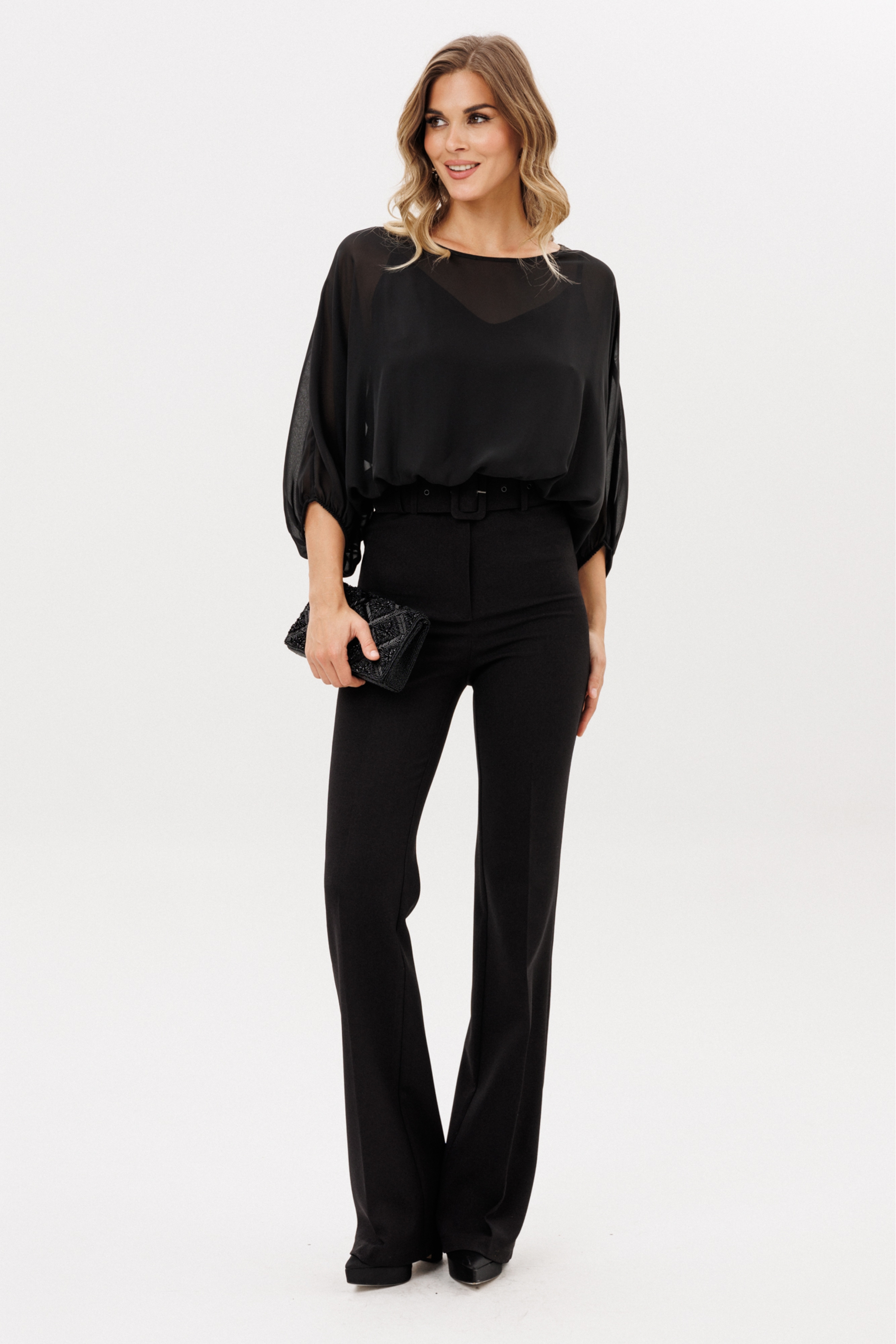 Брюки выполнены из костюмной ткани. Брюки покроя "клеш", на притачном поясе, длиной в пол. Спереди застежка на молнию с гульфиком, потайную пуговицу и два брючных крючка. Передние и задние части брюк заутюжены на кант. В комплект входит съемный пояс из основной ткани.
