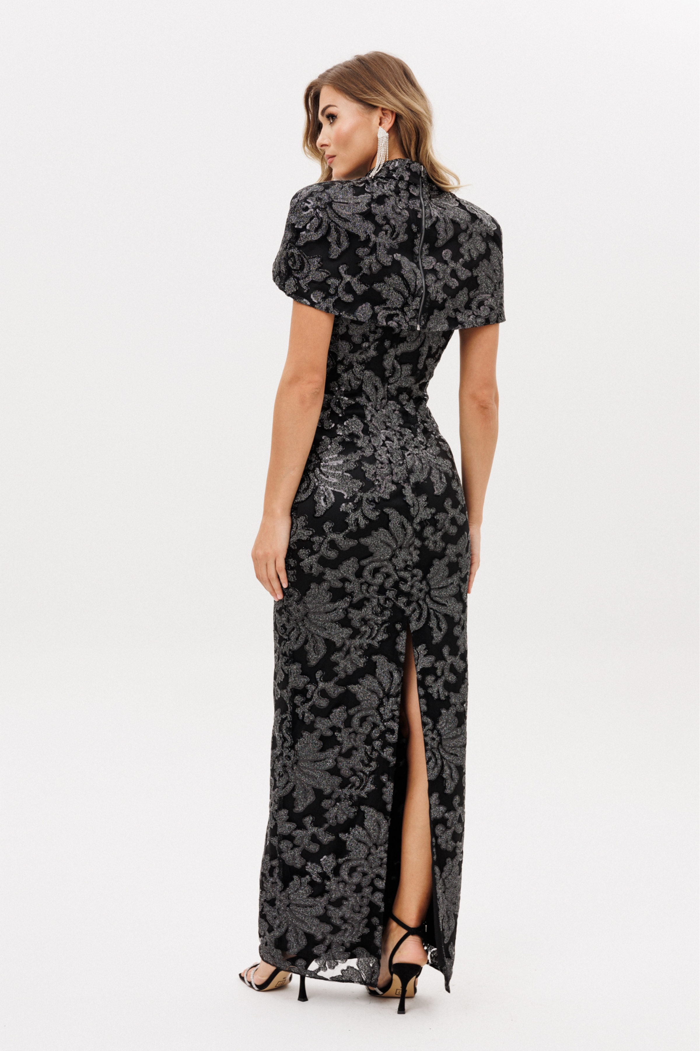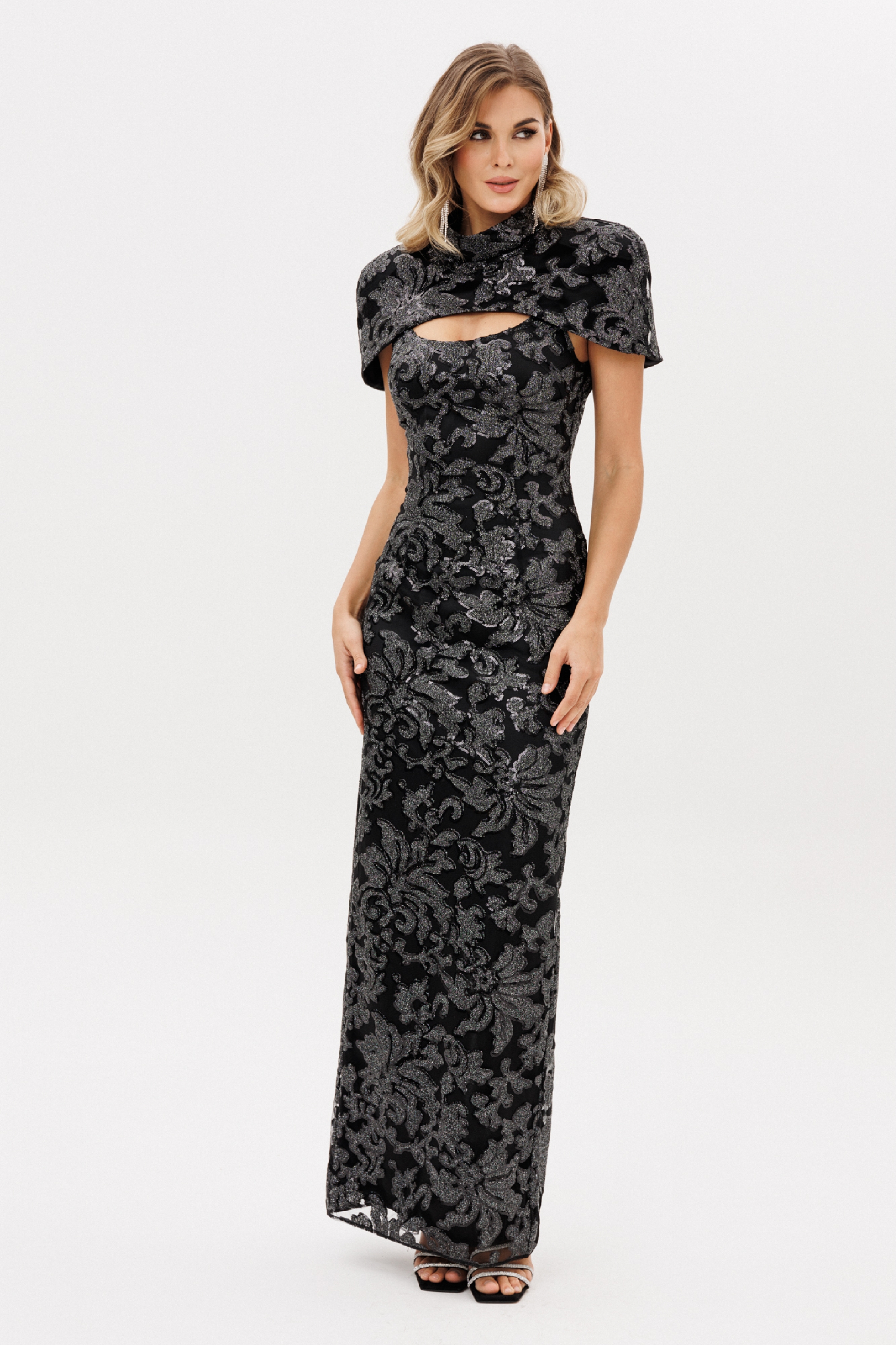 Кейп (накидка) выполнен из сетки с вышивкой с пайетками. Кейп прямого силуэта, длиной до линии груди. Перед цельный. Низ переда фигурной формы. Застежка на молнию с металлическими звеньями сзади в среднем шве спинки. Воротник-стойка. Кейп на притачной по низу подкладке из атласа, кейп с плечевыми накладками.