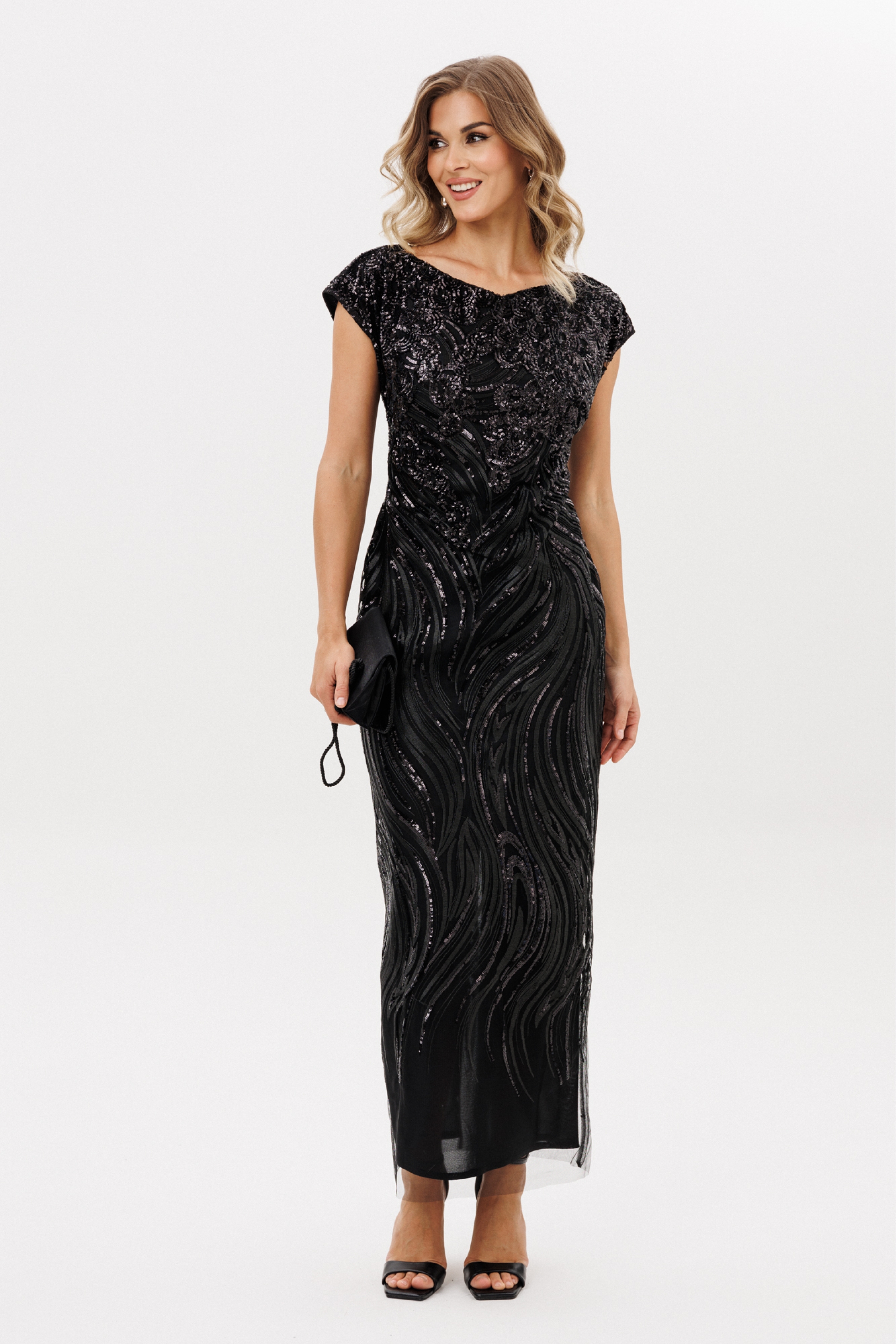 Платье выполнено из сетки с вышивкой с пайетками. В среднем шве спинки разрез и застежка на молнию с металлическими звеньями. Горловина и спинка выполнены в виде V-образной лодочки. Плечевой шов удлинен, образуя рукав цельнокроенного покроя. Платье на отлетной по низу подкладке.