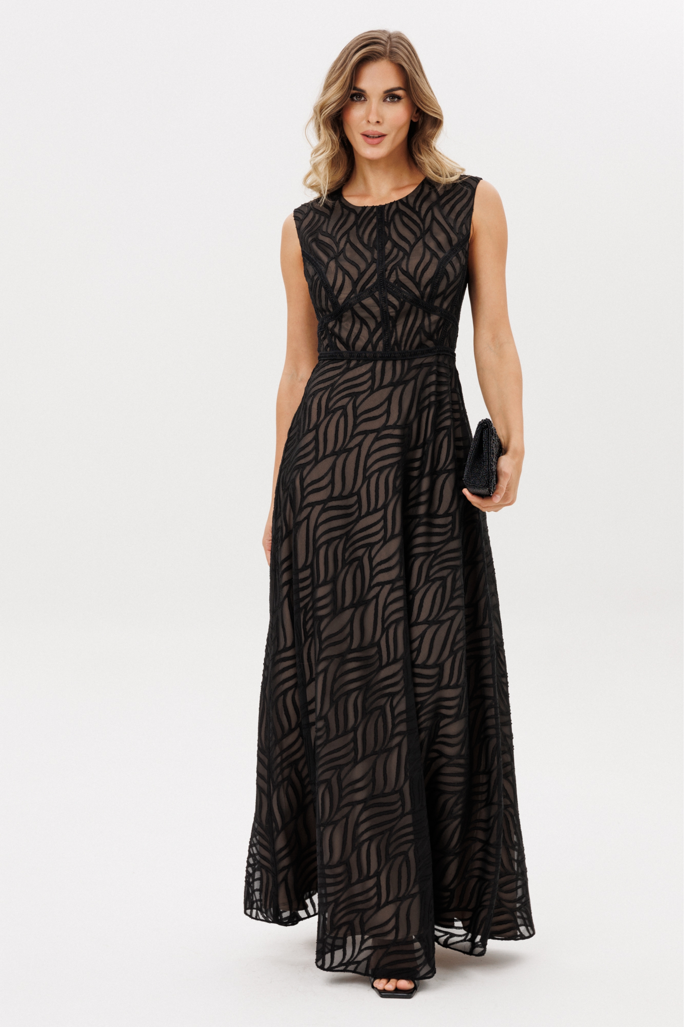 Платье выполнено из шифона с жаккардовым рисунком. Платье Х-образного силуэта, отрезное по линии талии, длиной миди. Спереди средний шов и горизонтальный подрез. Застежка на потайную молнию сзади в среднем шве спинки и юбки. Горловина округлой формы. Юбка расширена к низу и выкроена по косой. Платье декорировано настрочной тесьмой по всем резным линиям лифа и линии талии. Платье на отлетной по низу подккладке телесного цвета.