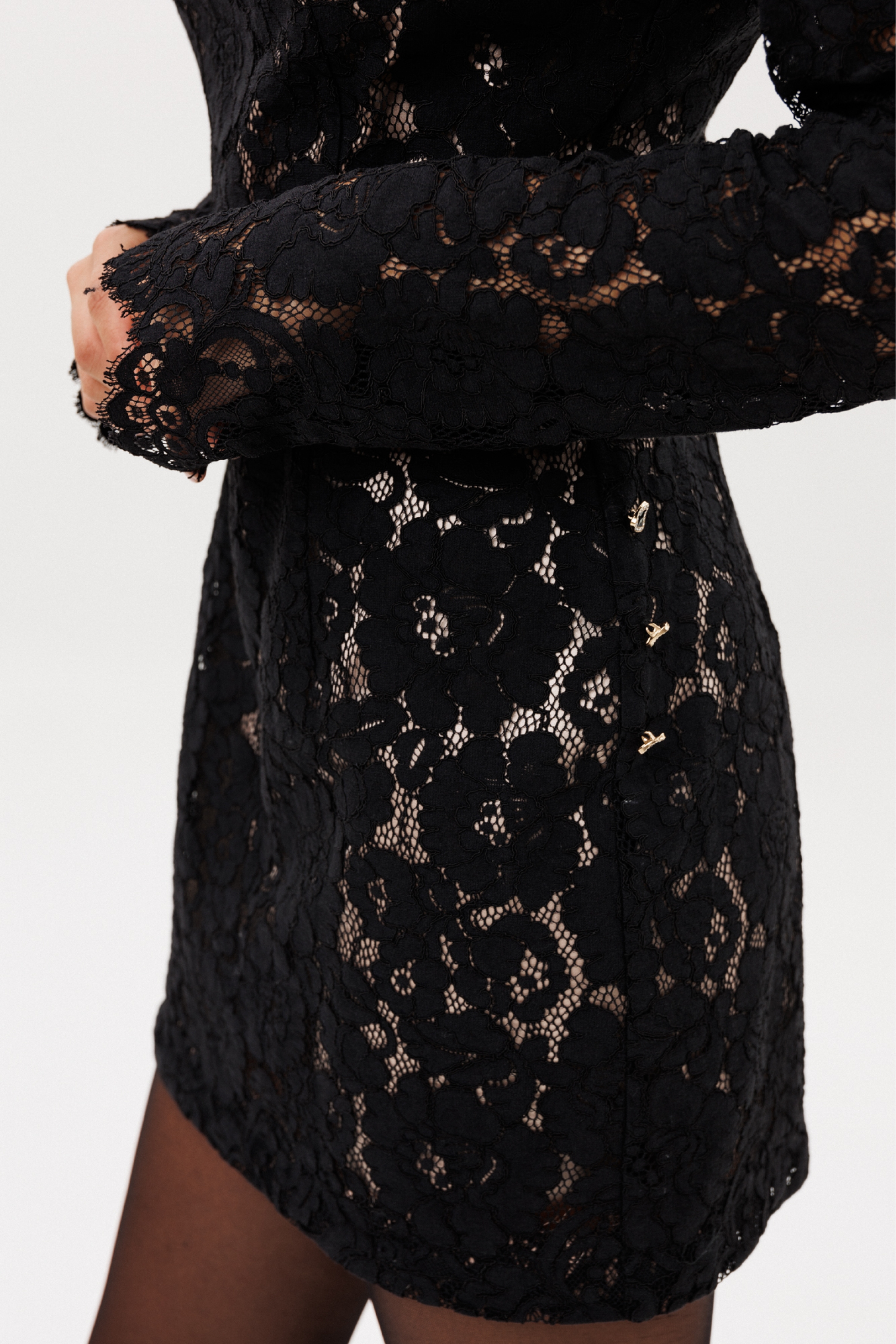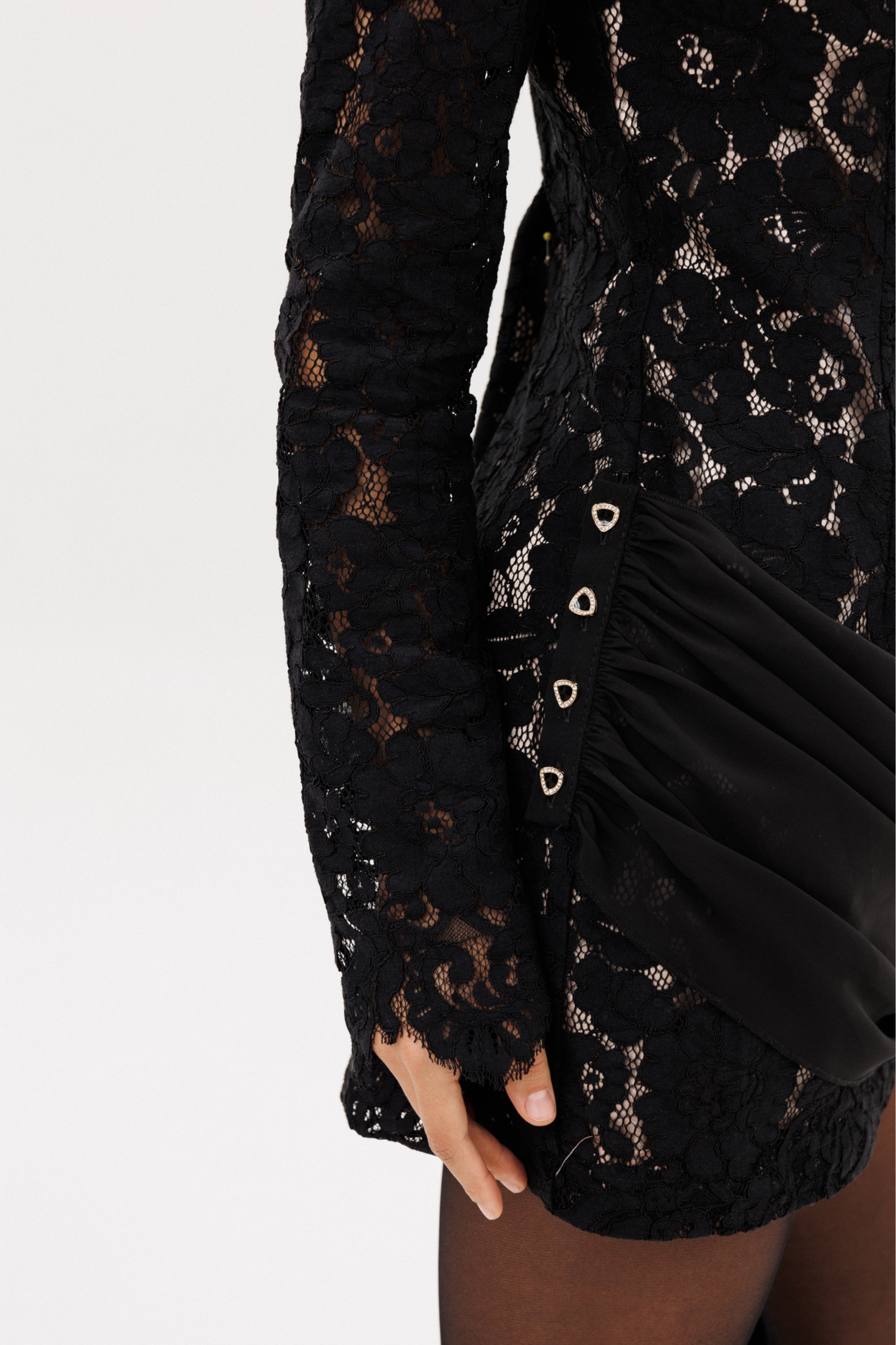 Платье выполнено из гипюра. Платье полуприлегающего силуэта длиной выше линии колена. Застежка на потайную молнию сзади в среднем шве спинки. Горловина округлой формы. Плечевой шов удлинен. Рукав втачной, одношовный. По низу рукава фестоны. Платье на отлетной по низу подкладке телесного цвета. Платье с плечевой накладкой. Платье декорировано съемной драпировкой из шифона, которая крепится к платью по боковым швам на петли и декоративные пуговицы.