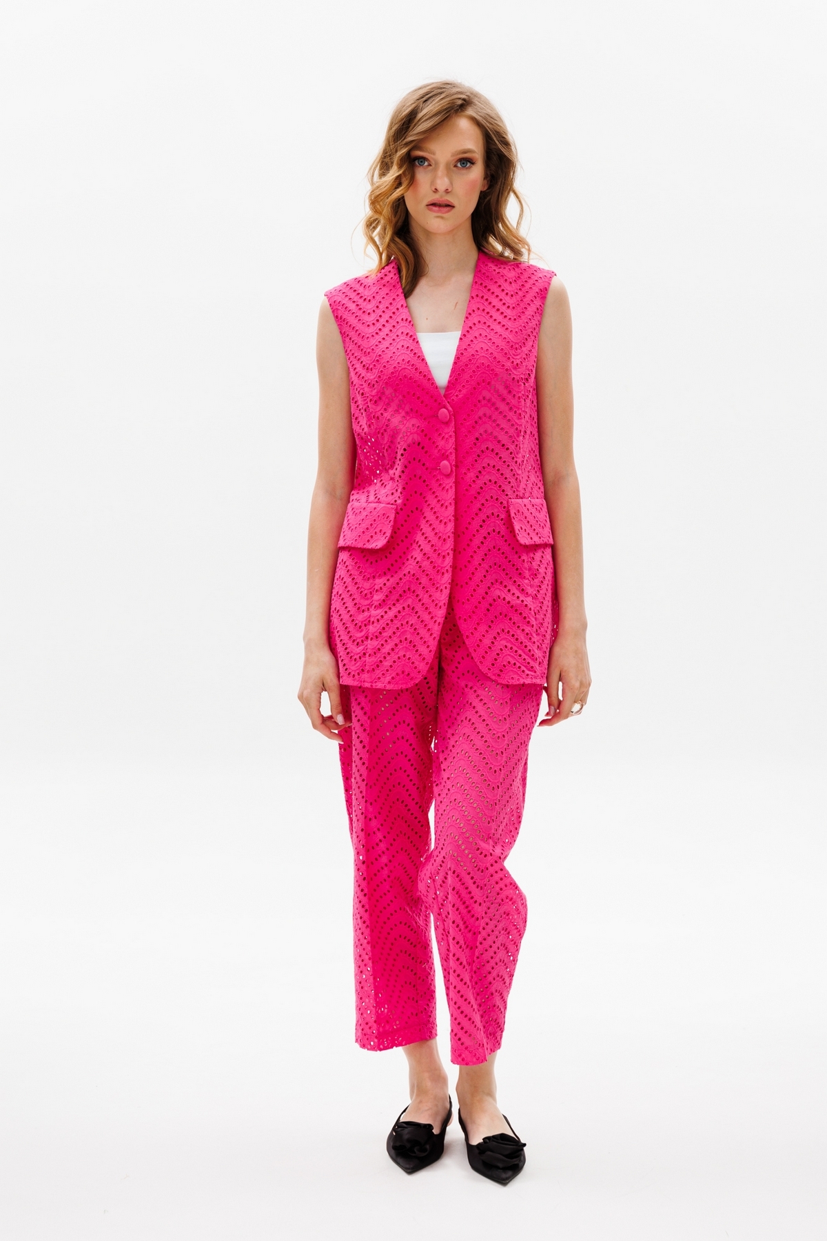 Комплект: жилет + брюки. Комплект выполнен из хлопка с вышивкой. Жилет полуприлегающего силуэта длиной ниже линии бедер. Спереди обработаны рельефы, декоративные клапаны и центральная бортовая застежка на пуговицы. Борт закругленной формы. Горловина V-образной формы. На спинке средний шов. Брюки свободного покроя, длиной 7/8, зауженные к низу, на притачном поясе с эластичной тесьмой. Спереди по бокам обработаны карманы с наклонным входом и застежка на молнию. Передняя и задняя часть брюк заутюжена на кант. Брюки на короткой отлетной подкладке в виде шорт.