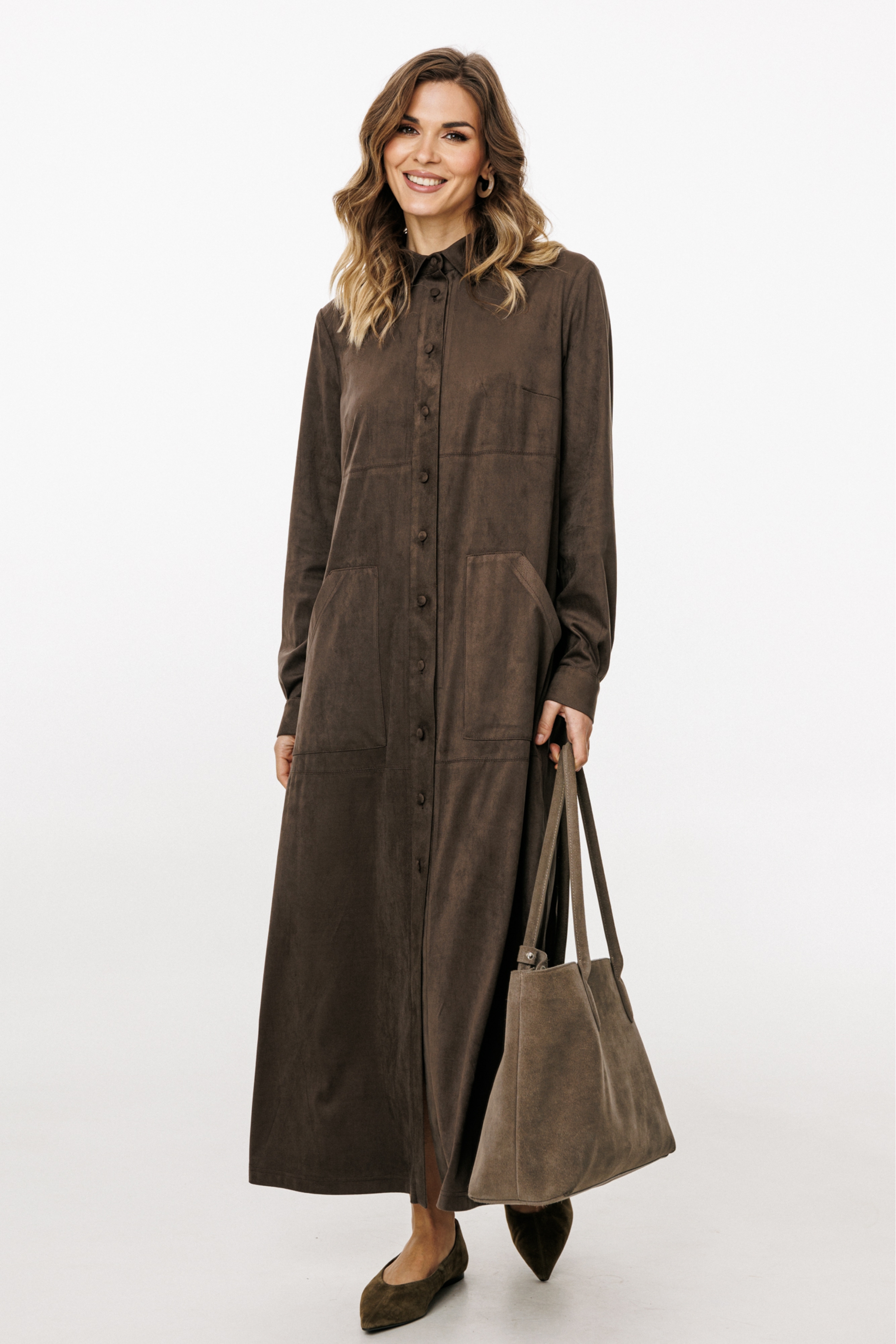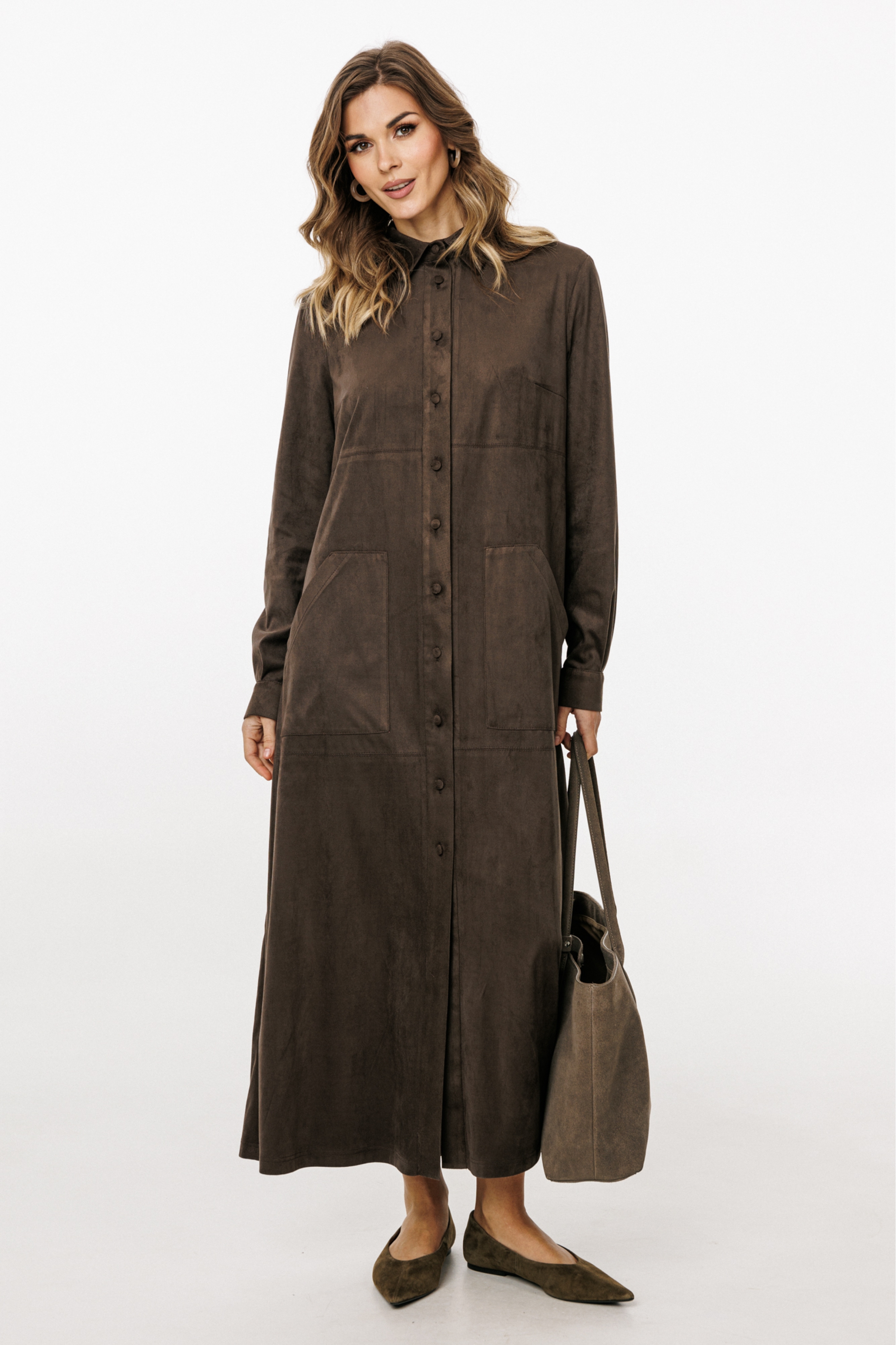 Платье выполнено из тонкой искусственной замши. Платье прямого силуэта, длиной миди. Спереди горизонтальные подрезы, накладные карманы и центральная застежка до верха с планкой на пуговицы. На спинке кокетка и встречная складка. Воротник стояче-отложной с отрезной стойкой и застежкой на пуговицу. Рукав втачной, одношовный. По низу рукава две складки и планка-обтачка. Низ рукава на притачной манжете с застежкой на пуговицу.