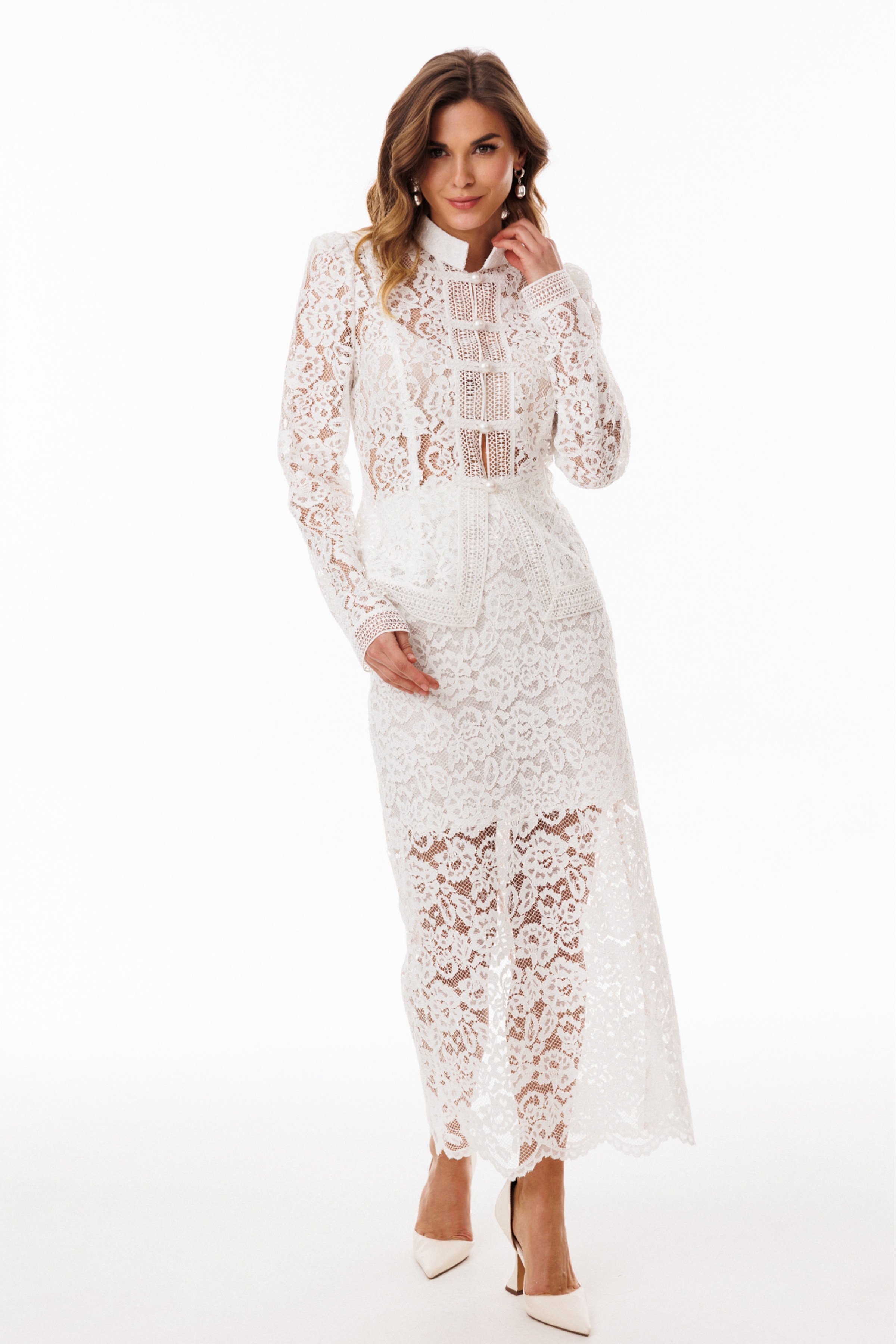 Блузка выполнена из гипюра с напылением серебристого цвета. Блузка полуприлегающего силуэта, длиной до линии бедер. По переду обработаны рельефы от плечевых швов до низа и центральная застежка до верха встык на пять навесных петель и пуговиц. На спинке обработаны талиевые вытачки. Горловина округлой формы, обработана воротником-стойкой. Плечевой шов укорочен. Рукав втачного покроя, одношовный, со сборкой по окату. Блузка декорирована притачной тесьмой по борту, низу и низу рукава.