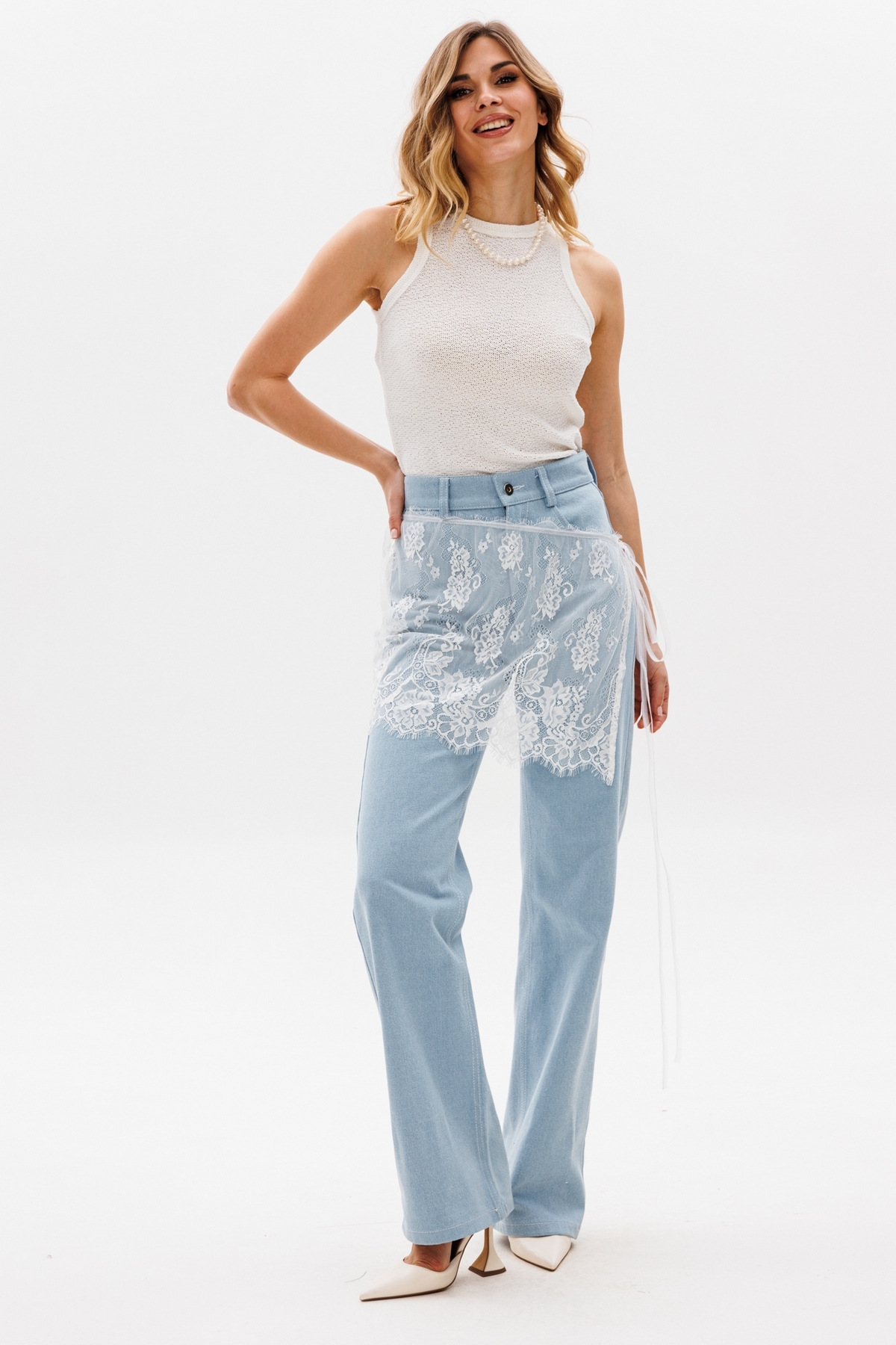 Брюки выполнены из джинса. Брюки прямого силуэта, на притачном поясе, длиной в пол. Спереди боковые карманы с фигурным входом. Застежка спереди на молнию с гульфиком и пробивную пуговицу.  Сзади накладные карманы, декорированные нашивкой. Рекомендуется перед корректировкой длины изделие постирать.